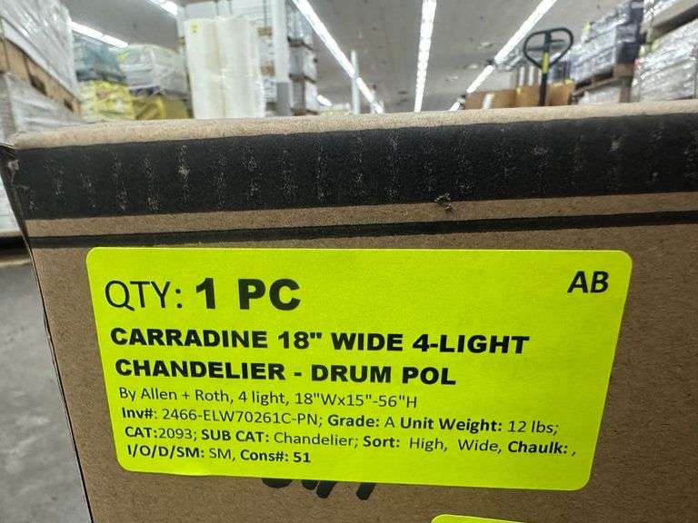 Carradine 18" Wide 4-Light Chandelier- Drum Pol. By Allen + Roth, 4 light, 18"Wx15"-56"H Grade: A Weight: 12. Sold by: Piece. Sold as: Price x Quantity.