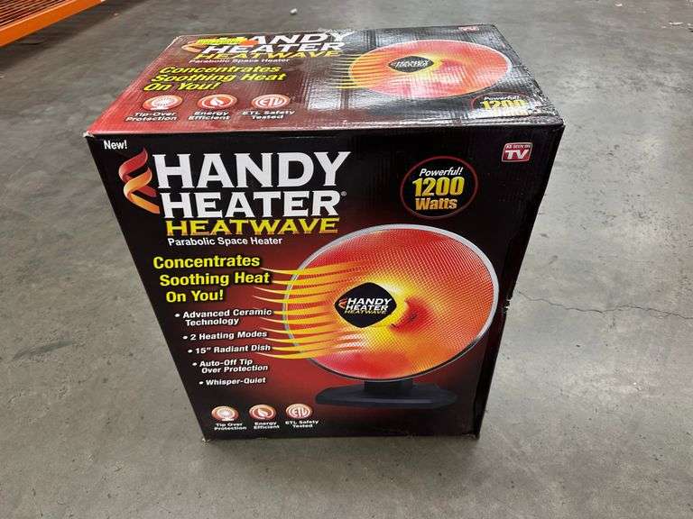 1200-Watt Electric Oscillating Ceramic Parabolic Space Heater. Open box but looks new. Fan-free operation allows quiet and comfortable use. Powerful 1200-watt heater with 2 heating modes for convenience. Large curved radiant face ensures instant and soothing warmth Weight: . Sold by: . Sold as: Price x Quantity.