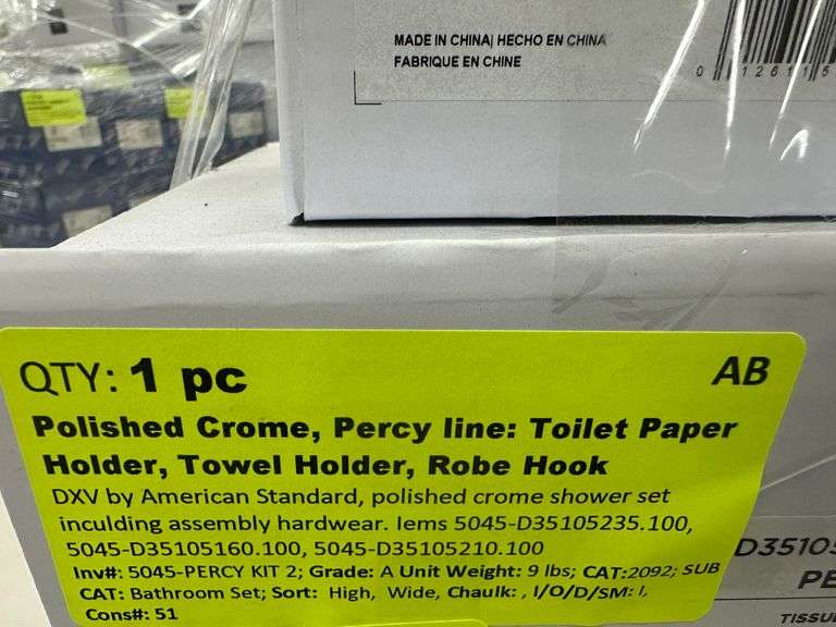 Polished Chrome, Percy Line: Toilet Paper Holder, Towel Holder, Robe Hook, Grade A. DXV by American Standard, Polished Chrome Shower Set including Assembly Hardware. Lems 5045-D35105235.100, 5045-D35105160.00, 5045-D35105210.100 Weight: 9. Sold by: Piece. Sold as: Price x Quantity.