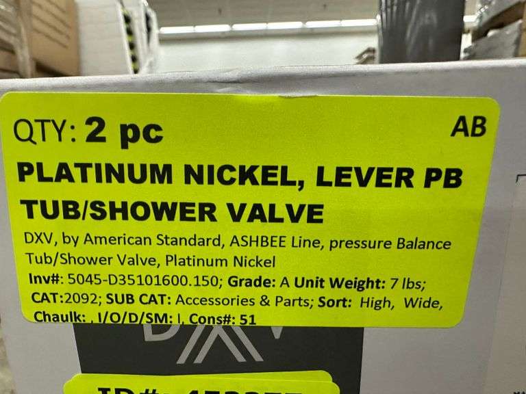 Platinum Nickel Lever PB Tub/Shower Valve. DXV, By American Standard, ASHBEE Line, Pressure Balance Tub/Sower Valve, Platinum Nickel, Grade A Weight: 7lb. Sold by: . Sold as: Price x Quantity.