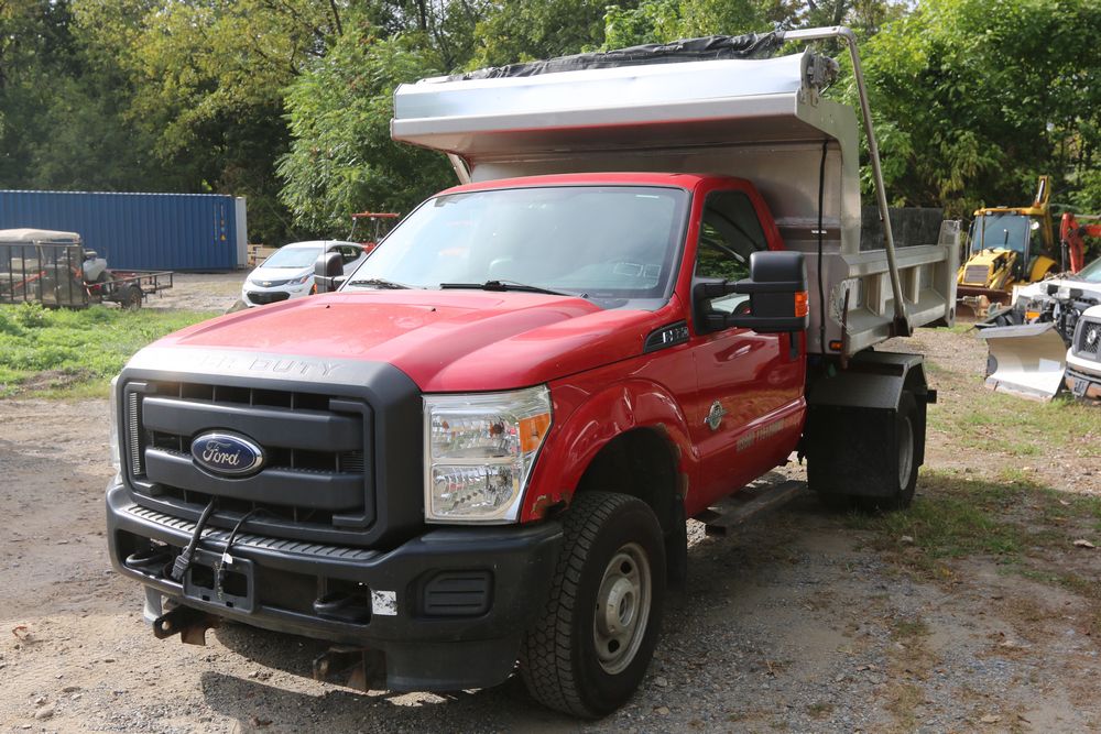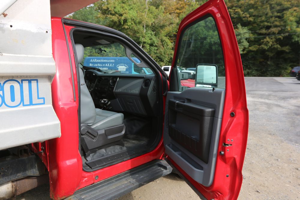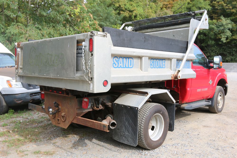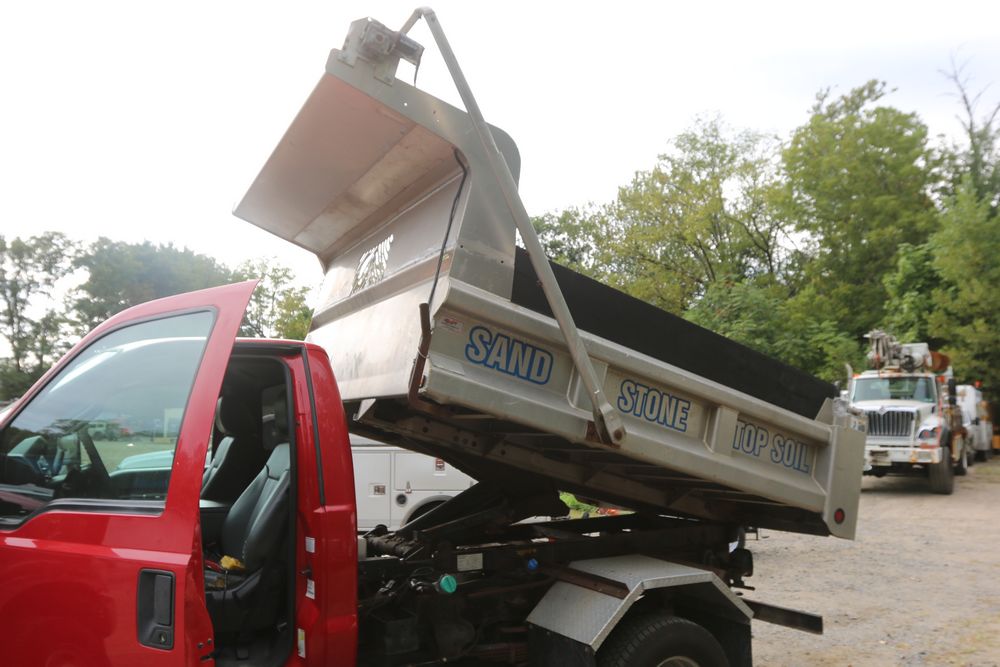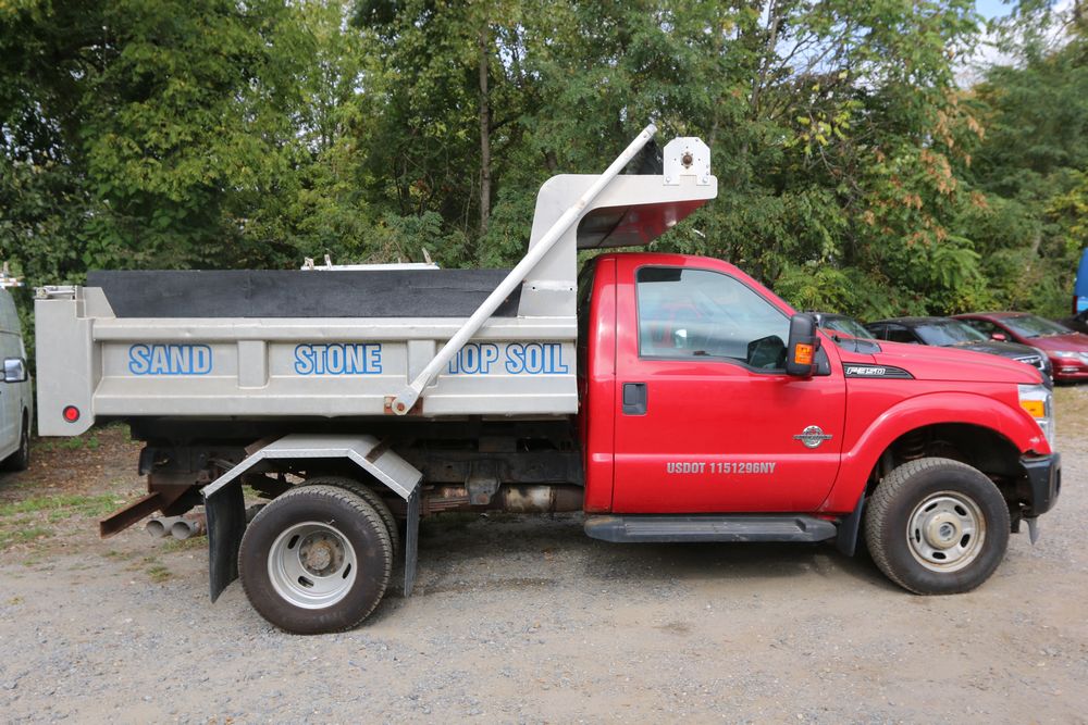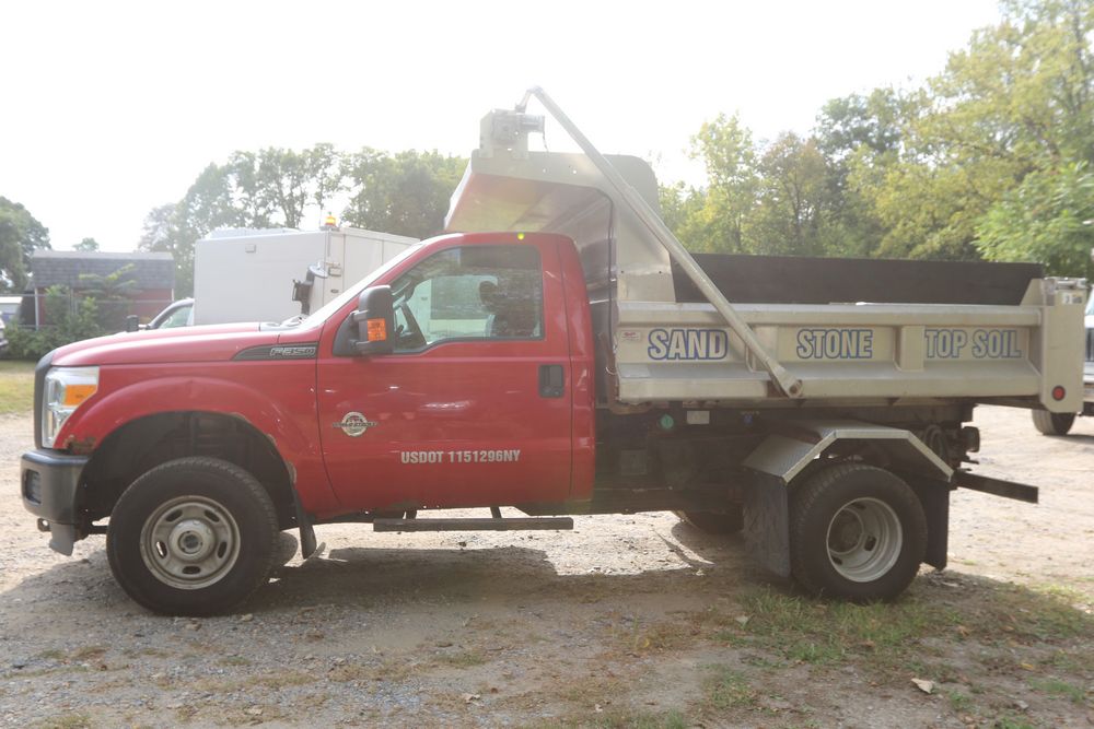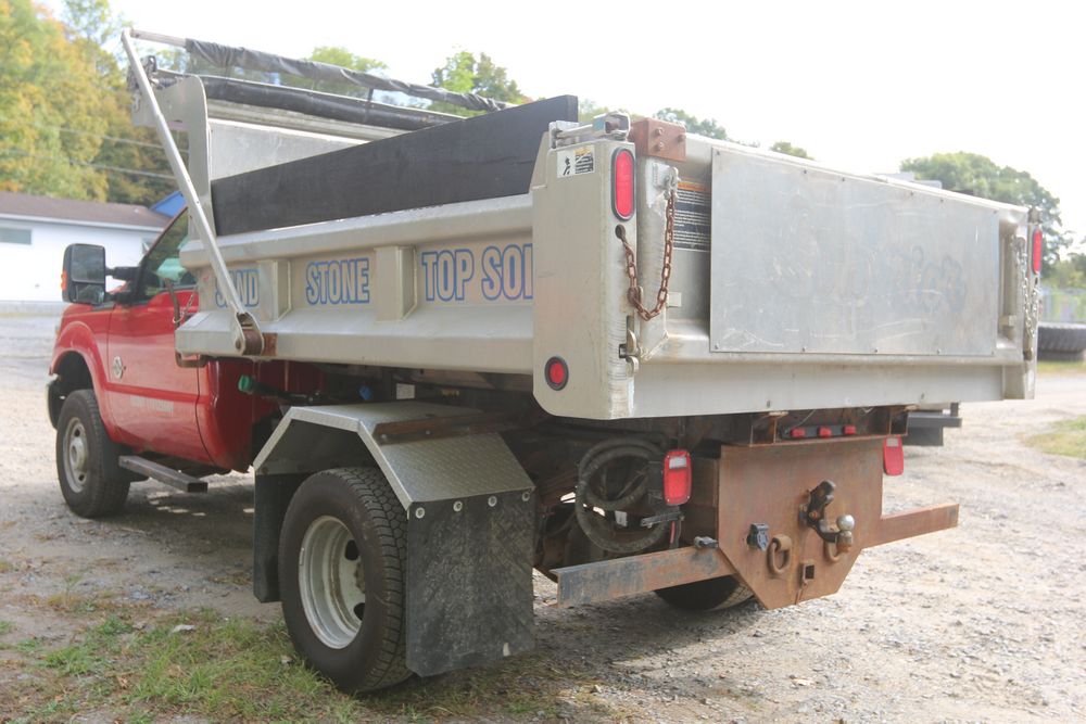 2015 Ford F-350 Super Duty, 6.7L V8 OHV 16V diesel engine and an aluminum dump body labeled for sand, stone, and topsoil. VIN# 1FTRF3BT1FED30045, power windows, AM/FM stereo, AC, auxiliary switches, and a dashboard control system for dump operation. Odometer reading: 137,427 miles. Runs and drives. Title and keys available.