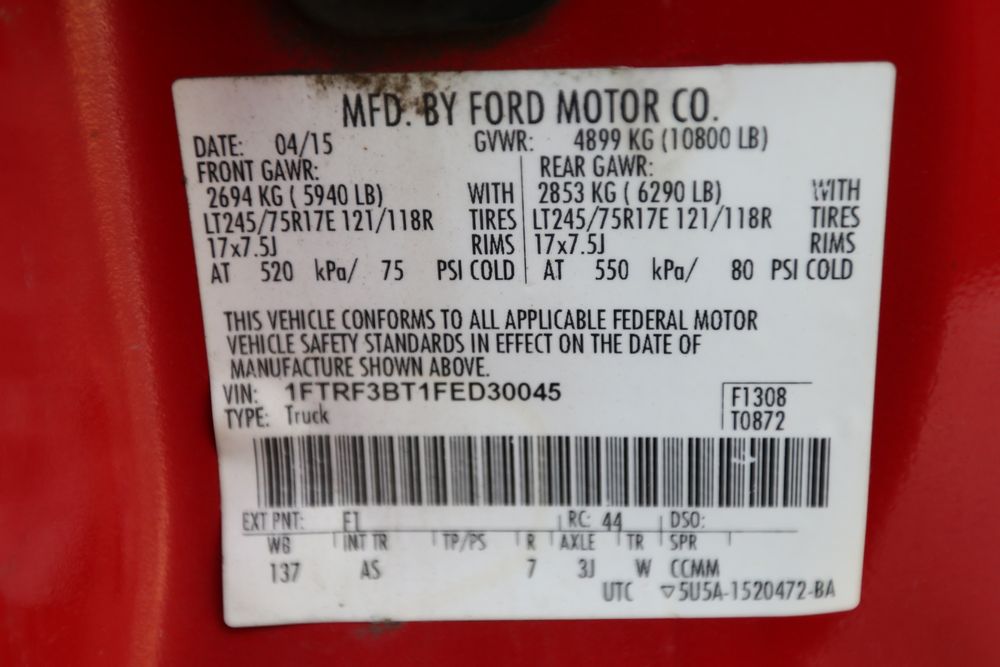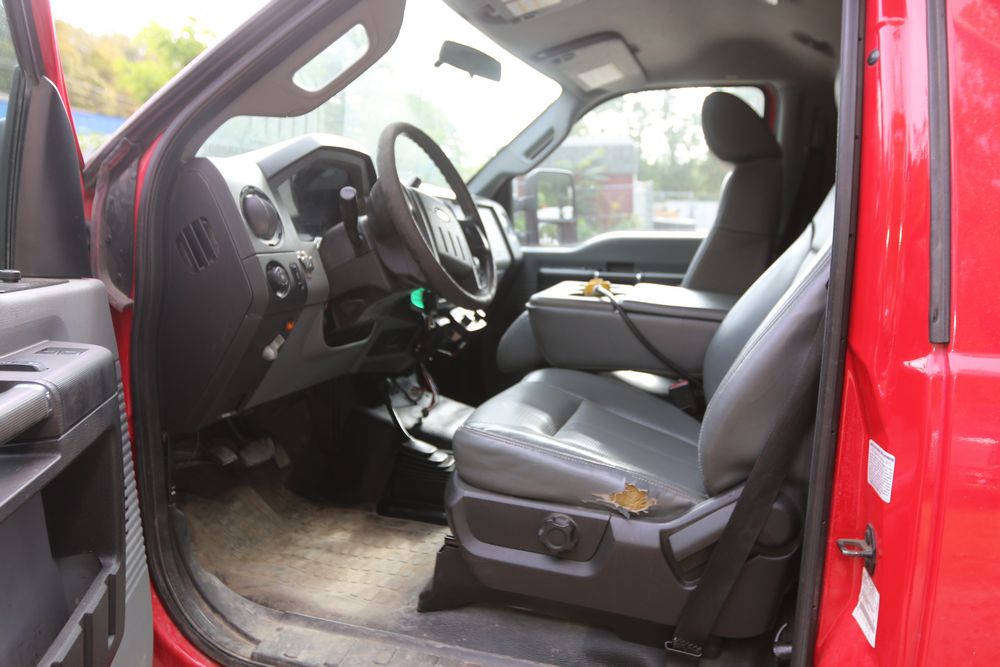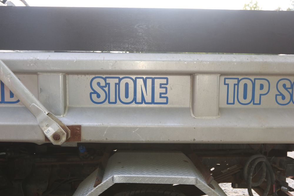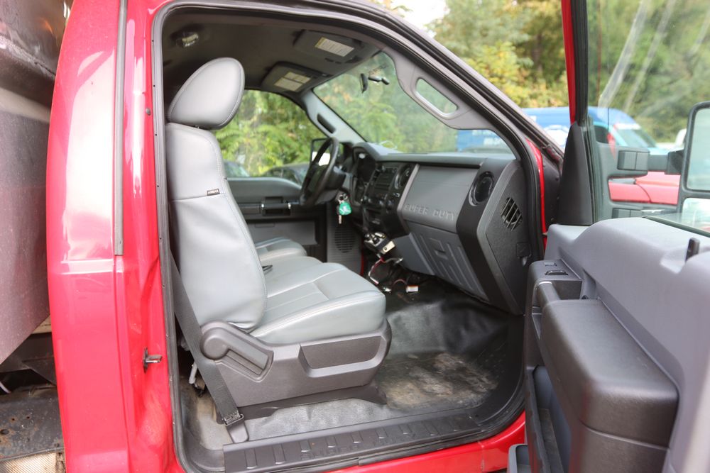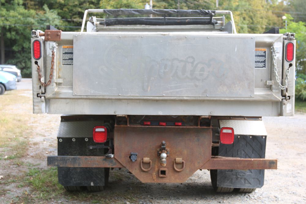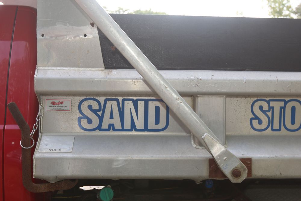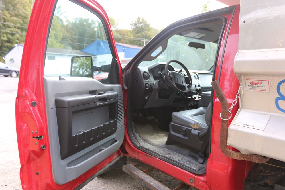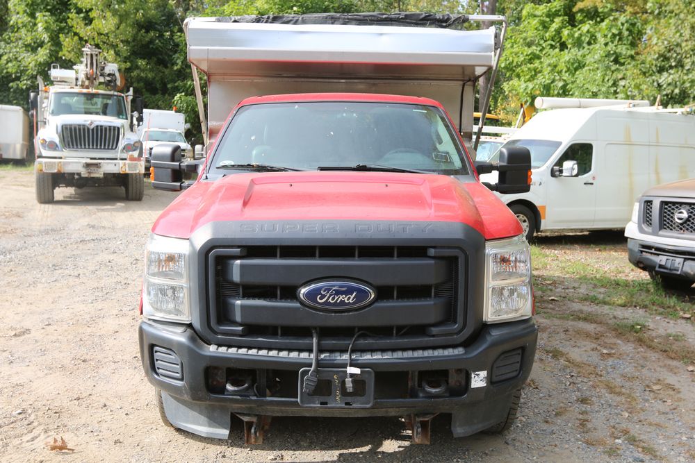 2015 Ford F-350 Super Duty, 6.7L V8 OHV 16V diesel engine and an aluminum dump body labeled for sand, stone, and topsoil. VIN# 1FTRF3BT1FED30045, power windows, AM/FM stereo, AC, auxiliary switches, and a dashboard control system for dump operation. Odometer reading: 137,427 miles. Runs and drives. Title and keys available.