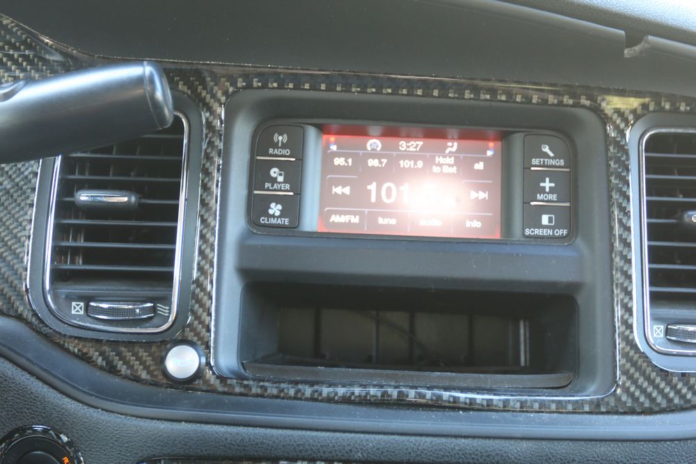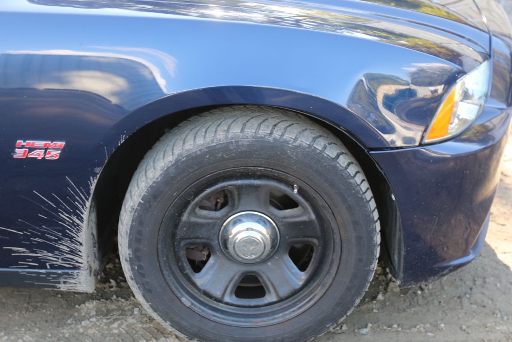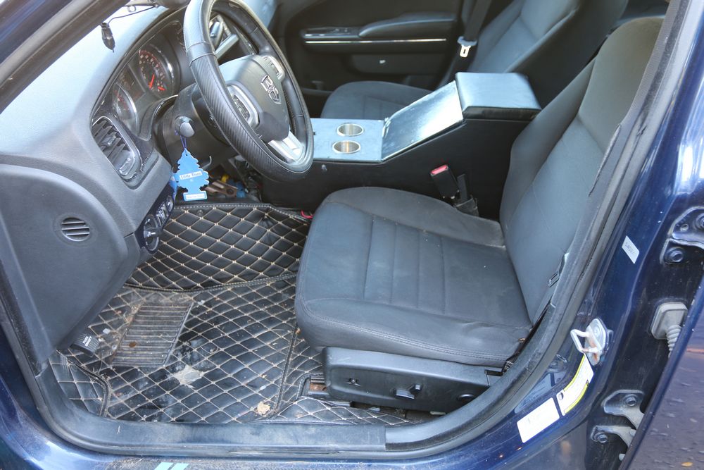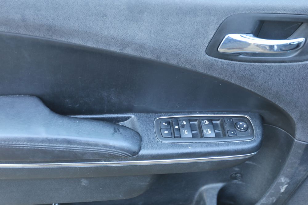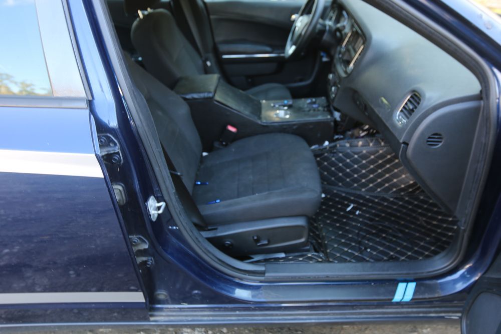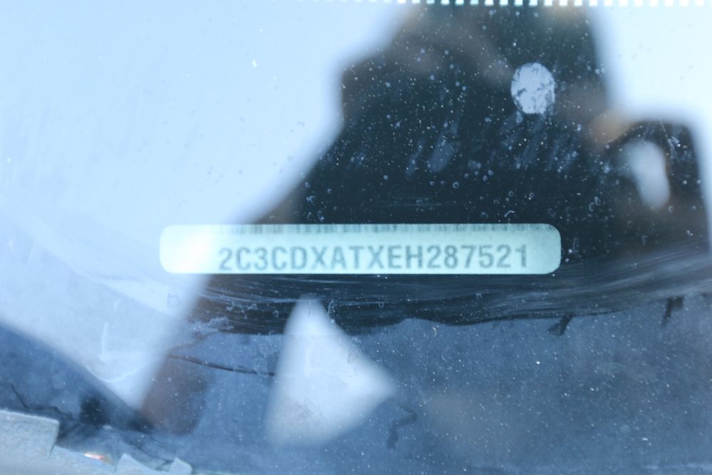 2014 Dodge Charger sedan is equipped with a 5.7L V8 engine and shows approximately 203,983 miles on the odometer. The vehicle has four doors and features a dark blue exterior with silver graphics and steel wheels. Interior equipment includes power windows, a basic radio, air conditioning controls, and a partitioned center console setup. Manufacturer sticker indicates a build date of April 2014. Pickup only.