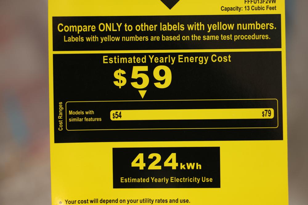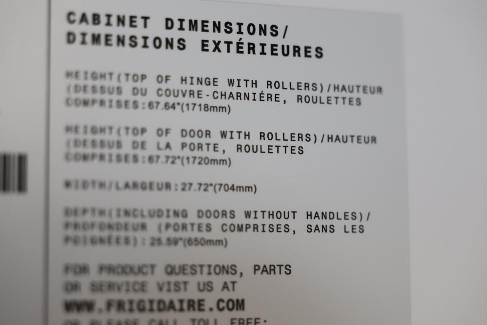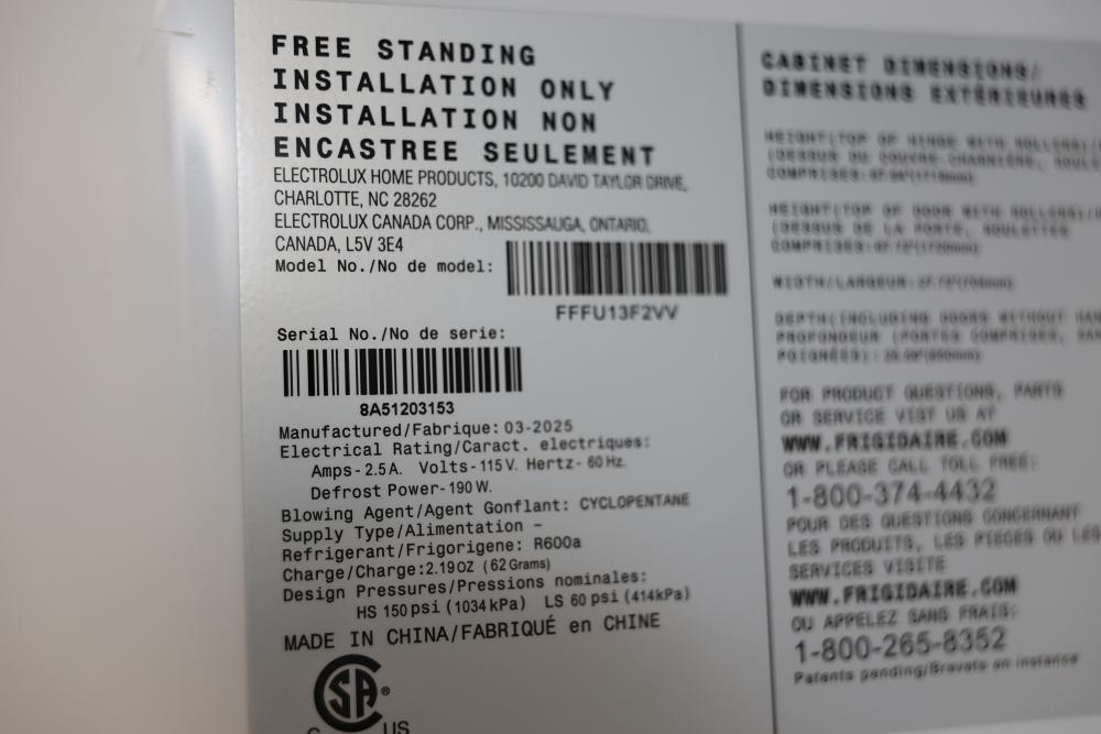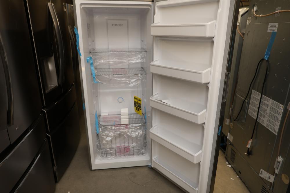Frigidaire 13 Cubic Feet Upright Freezer with Eventemp Cooling. Features adjustable shelves, wire baskets, and door bins for organized storage. Includes an estimated yearly energy cost of $59 with a usage of 424 kWh. Dimensions: Height 67.64 inches, Width 27.72 inches, and Depth 26.57 inches. Free-standing design with a sleek exterior finish. Pickup only.
