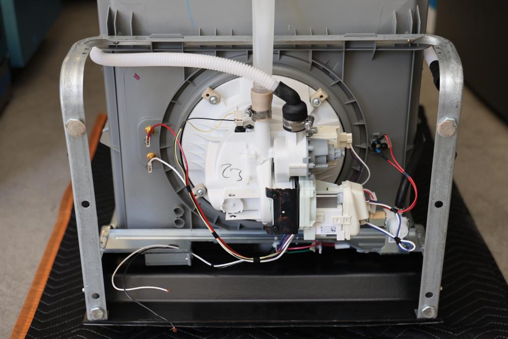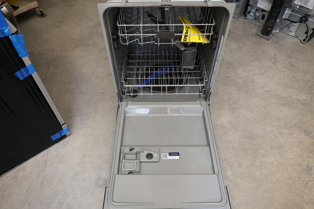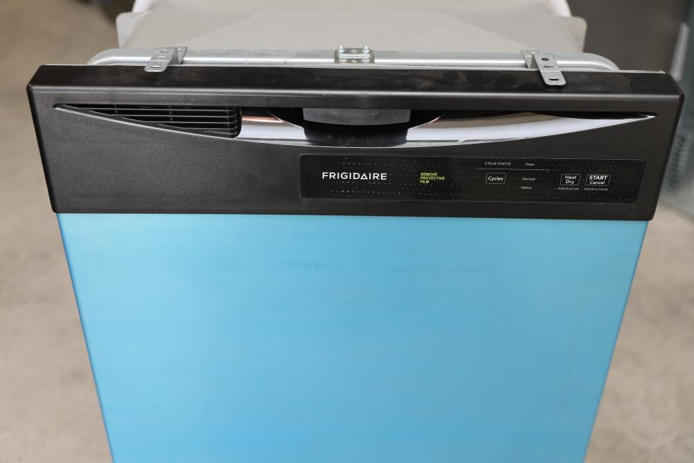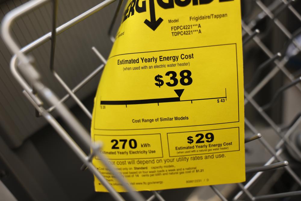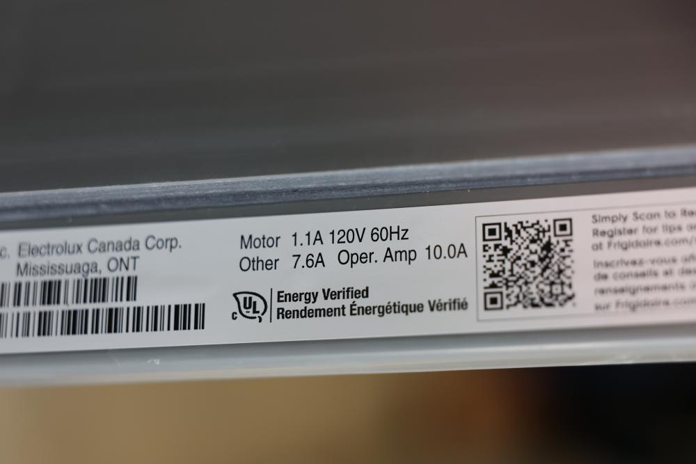 Frigidaire FDPC4221AS3A dishwasher featuring dimensions of 33.5 inches in height, 23.5 inches in width, and 24 inches in depth. Includes energy usage details with an estimated yearly cost of $38. Unit features operating highlights like Normal and Heavy cycles, Heat Dry option, and Start/Cancel functions. Electrical specifications include 1.1A motor and operational amperage of 10.0A. Pickup only.