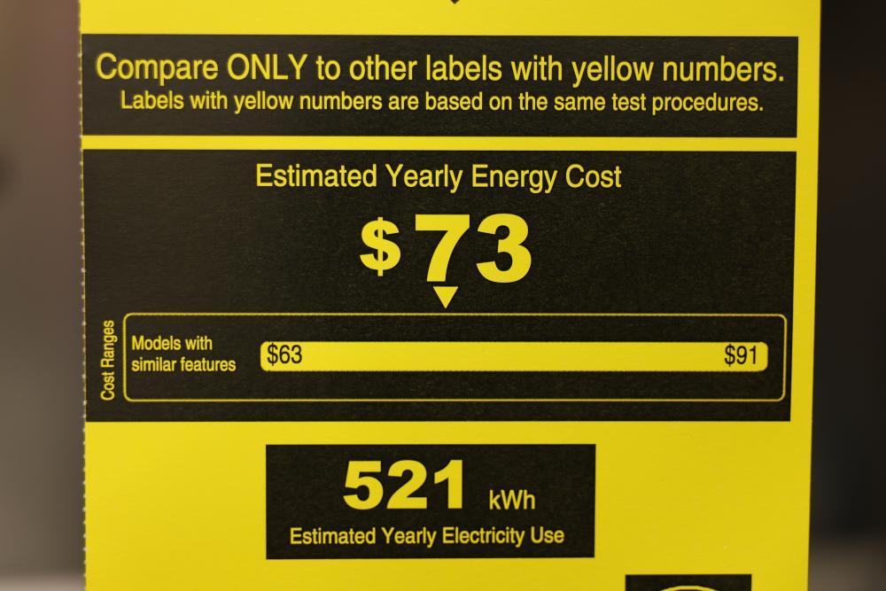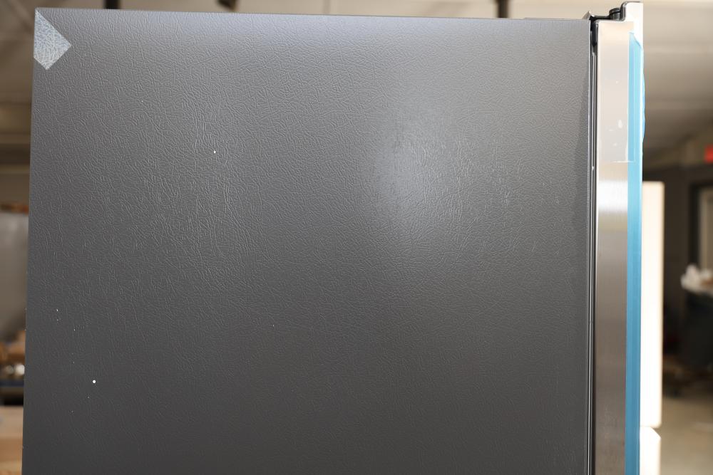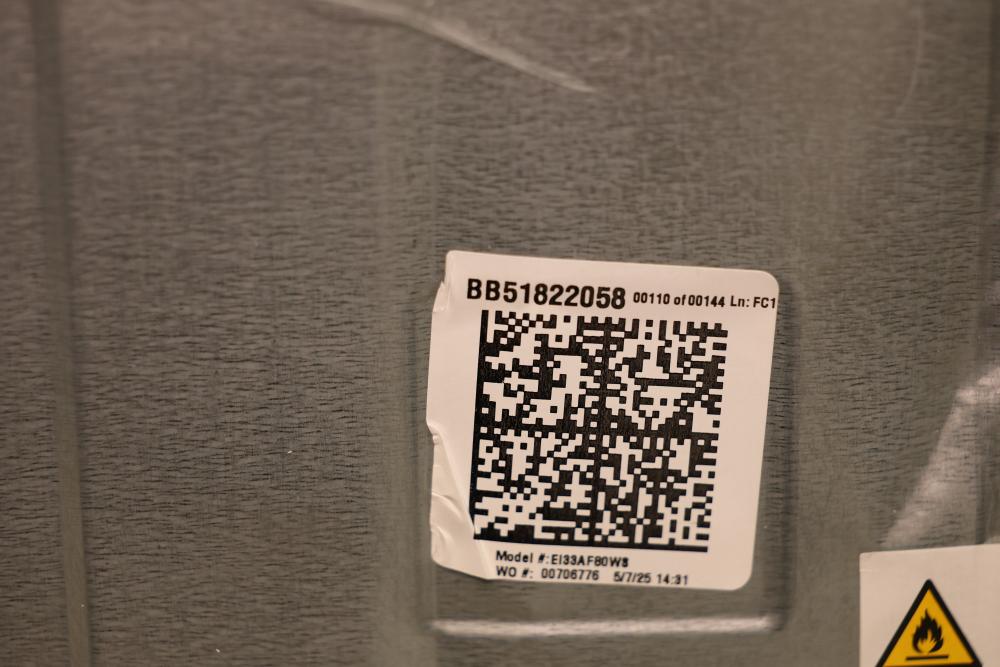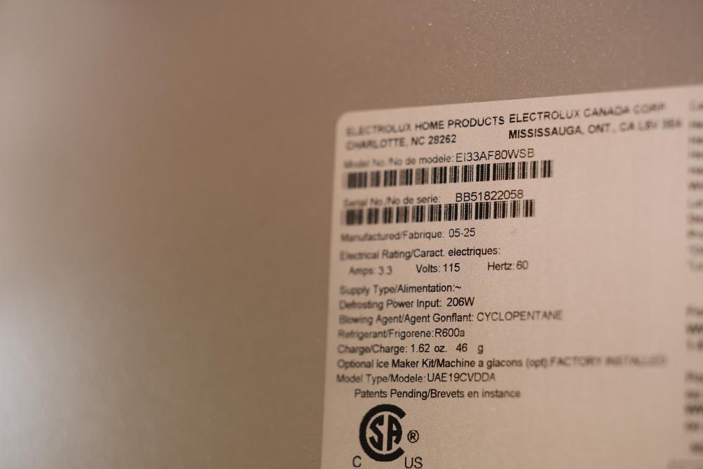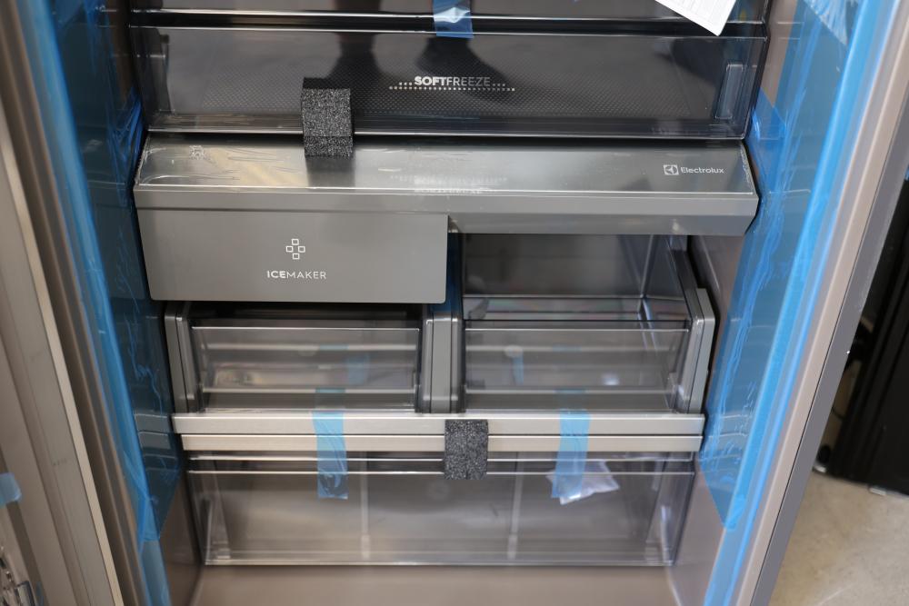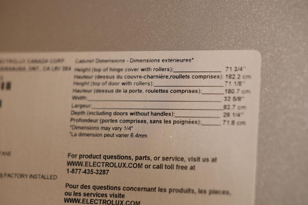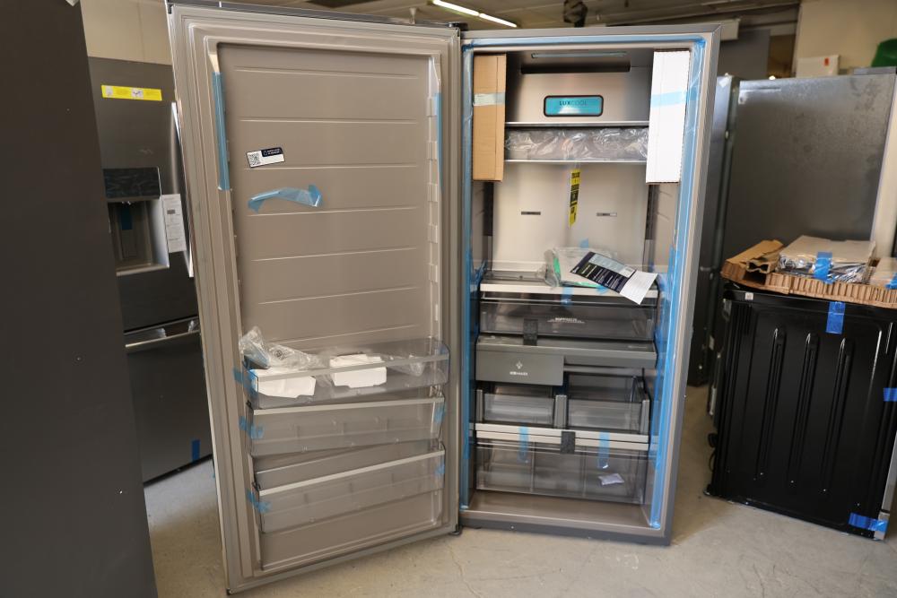 Electrolux EI33AF80WS upright freezer with no power. Features include multiple storage compartments, ice maker functionality, and an estimated yearly energy usage of 521 kWh. 72.5"H x 33"W x 27"D. Significant damage to front door and rear cover. Pickup only.