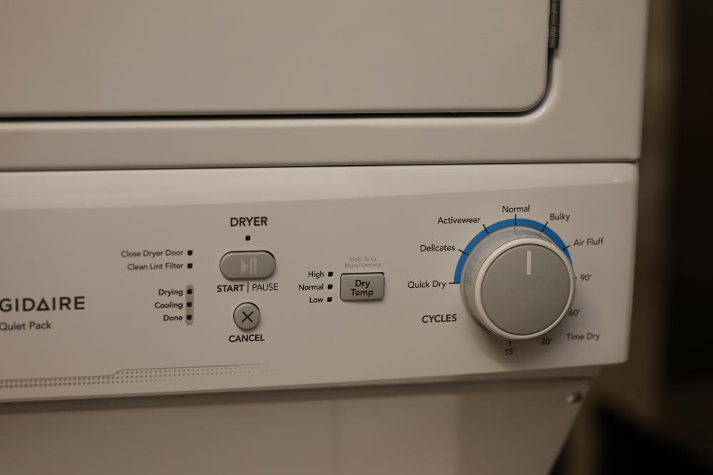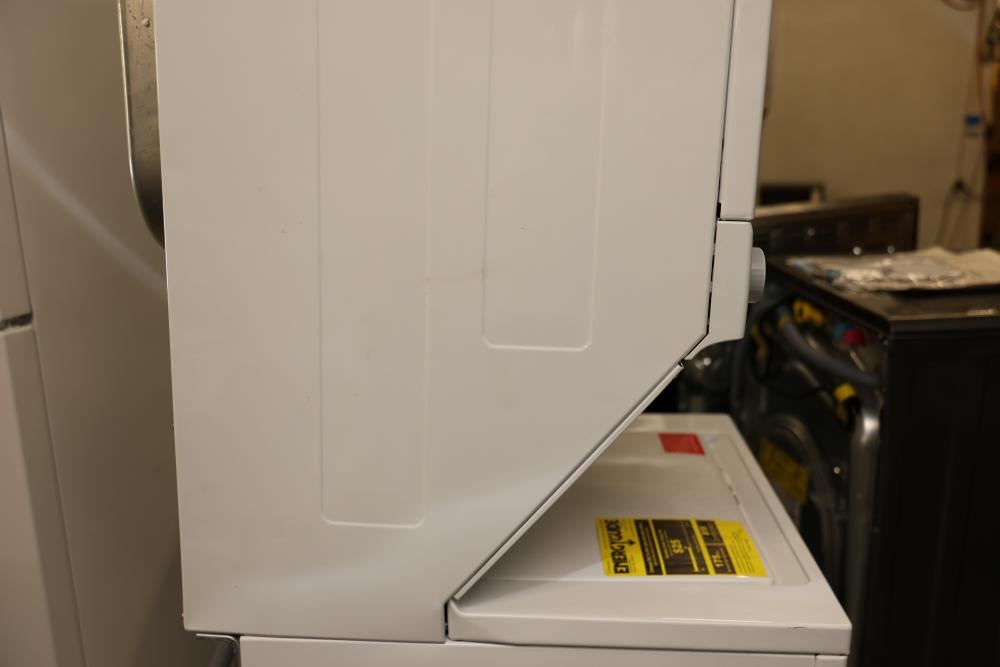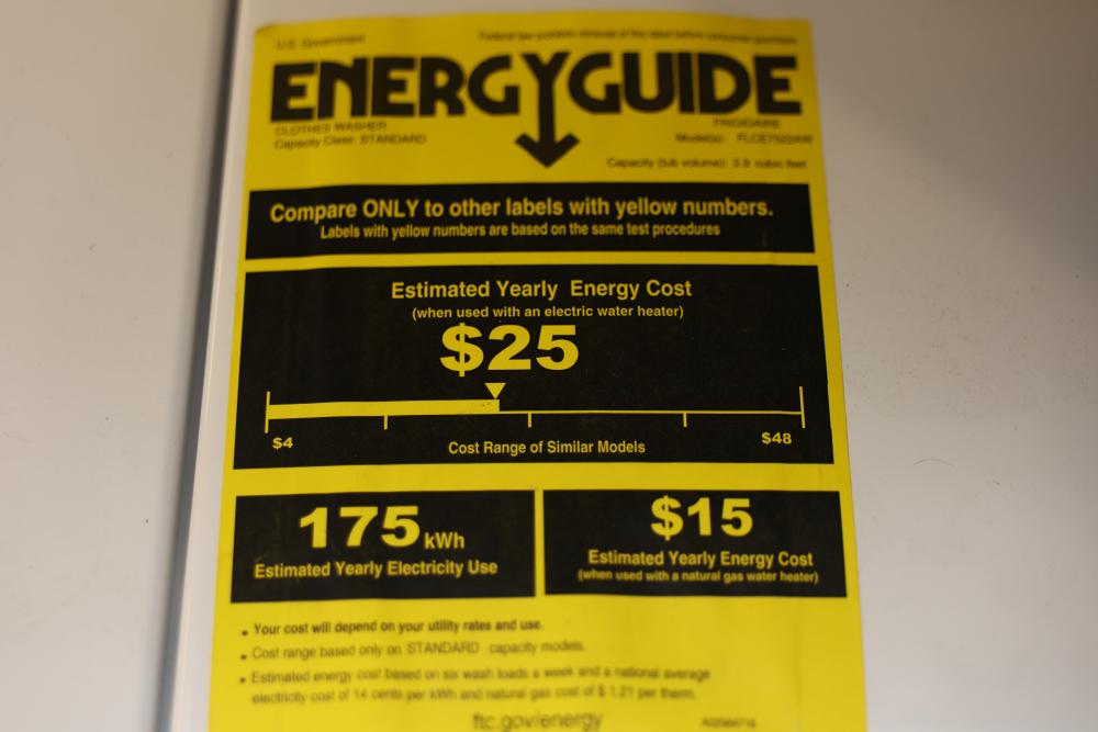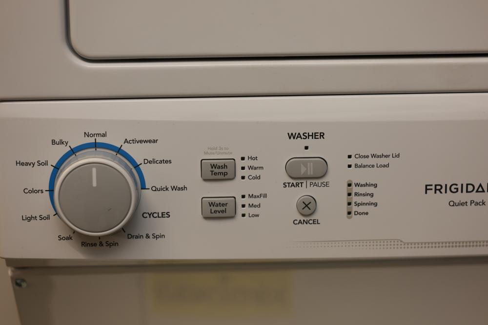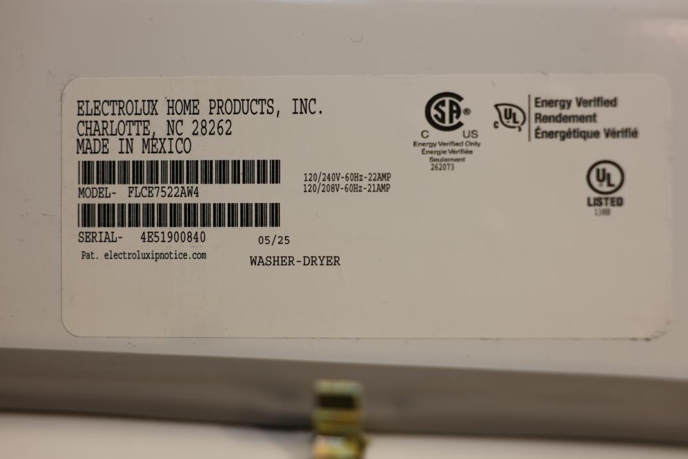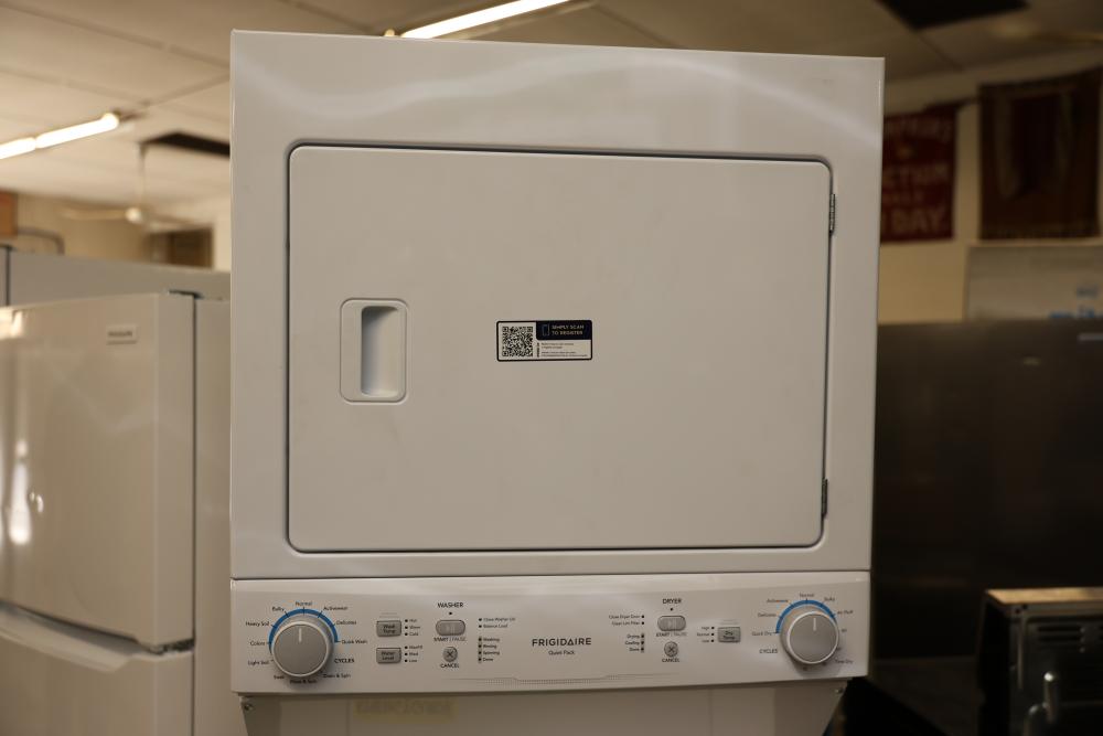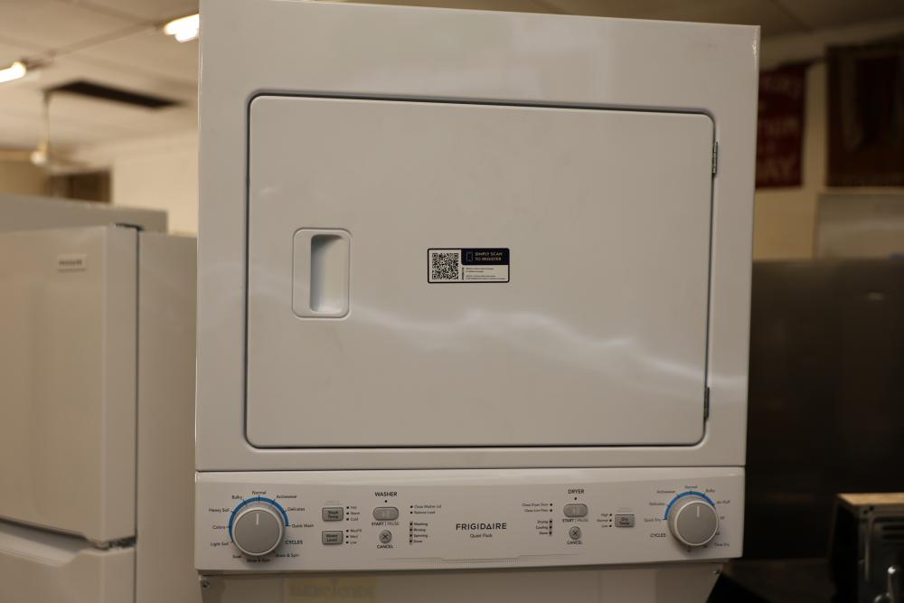 Frigidaire FLCE7522AW washer and dryer stacked unit with dimensions of 74.75"H x 27"W x 27.75"D. Features multiple wash and dry cycles, energy-efficient operation with an estimated yearly energy cost of $25, and a combined washer-dryer design for convenience. Includes visible controls, interior components, and energy labeling as shown. Pickup only.