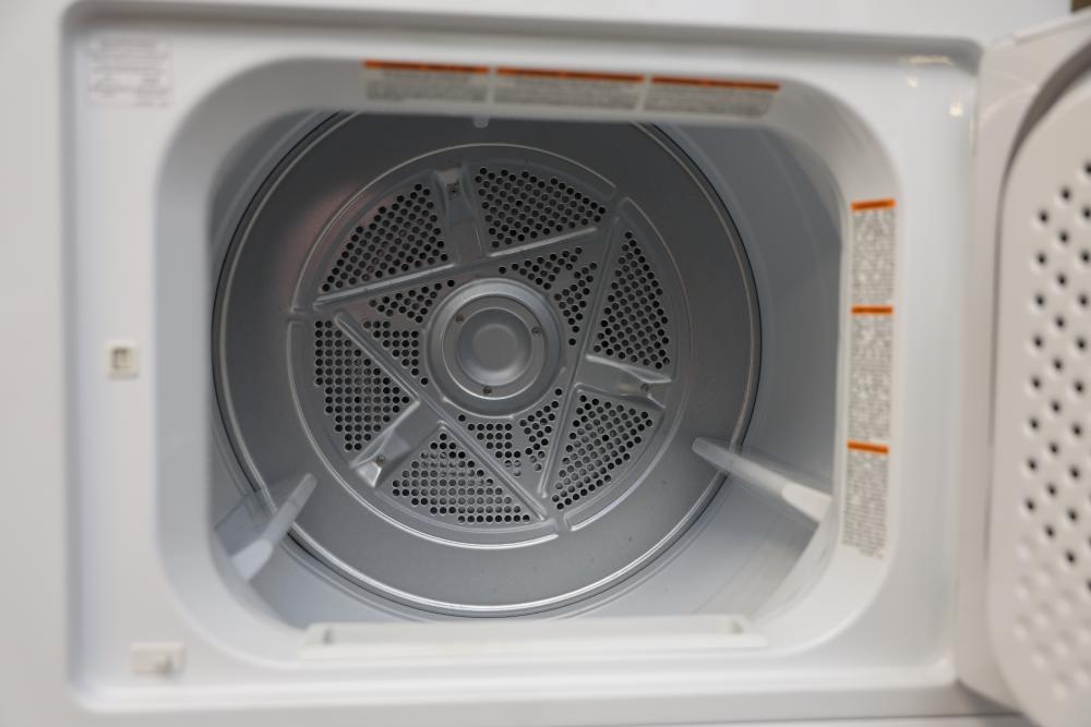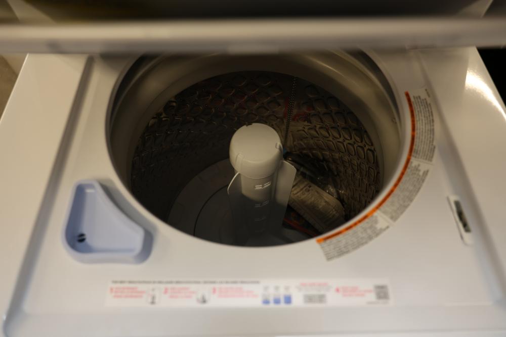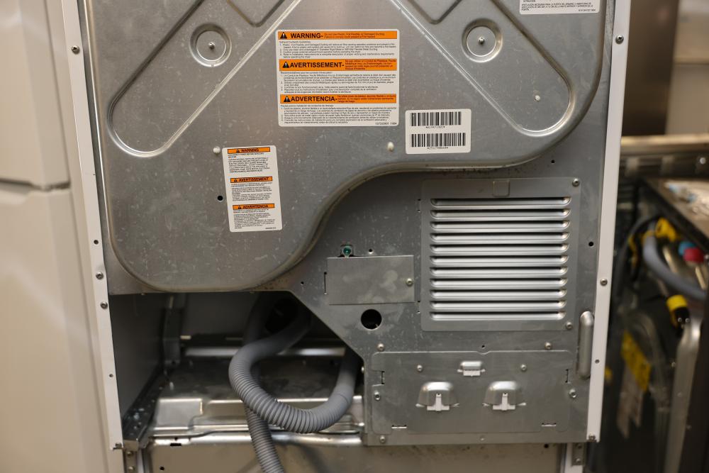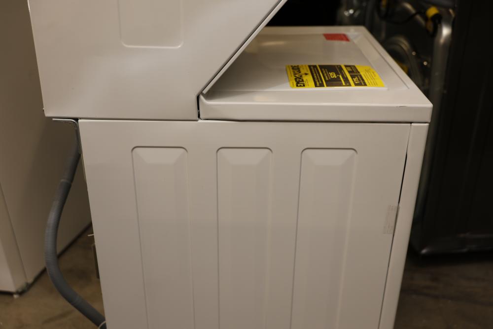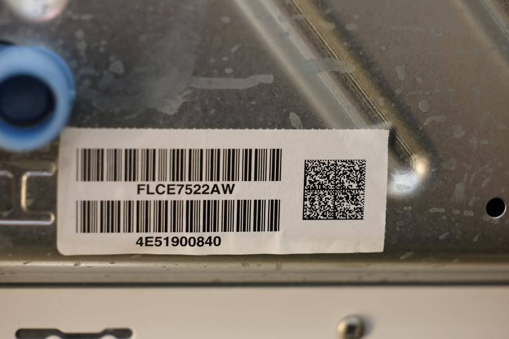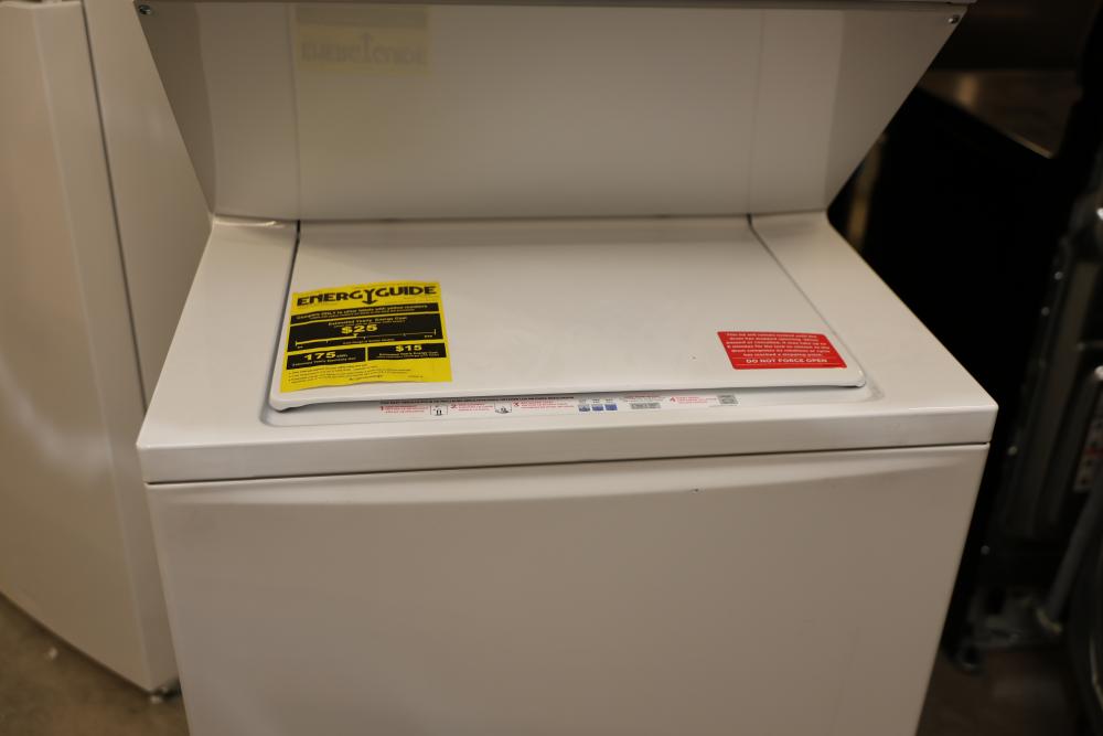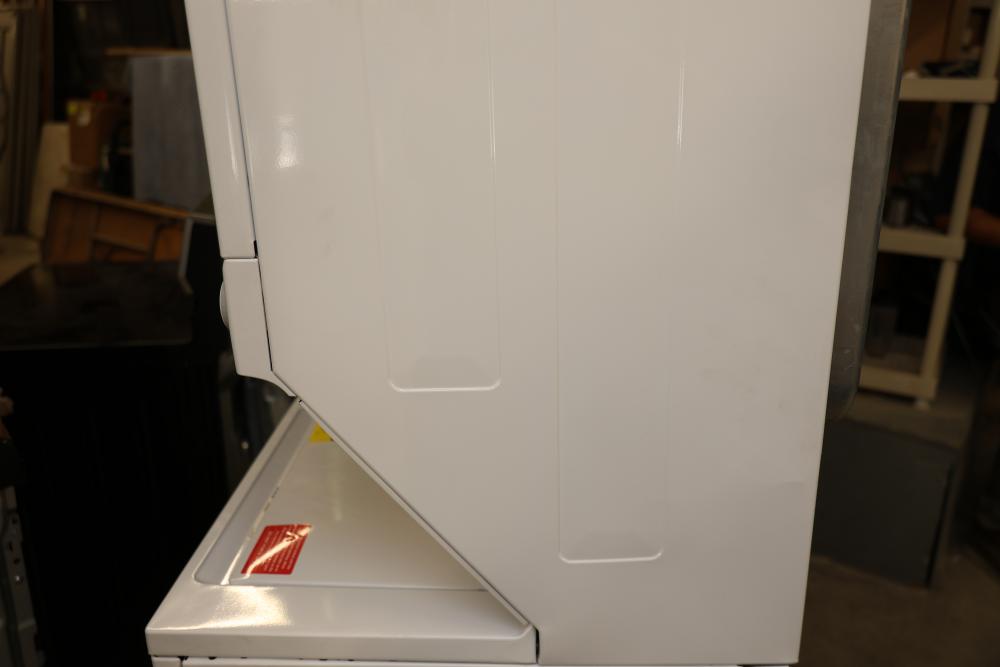 Frigidaire FLCE7522AW washer and dryer stacked unit with dimensions of 74.75"H x 27"W x 27.75"D. Features multiple wash and dry cycles, energy-efficient operation with an estimated yearly energy cost of $25, and a combined washer-dryer design for convenience. Includes visible controls, interior components, and energy labeling as shown. Pickup only.