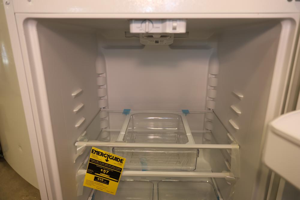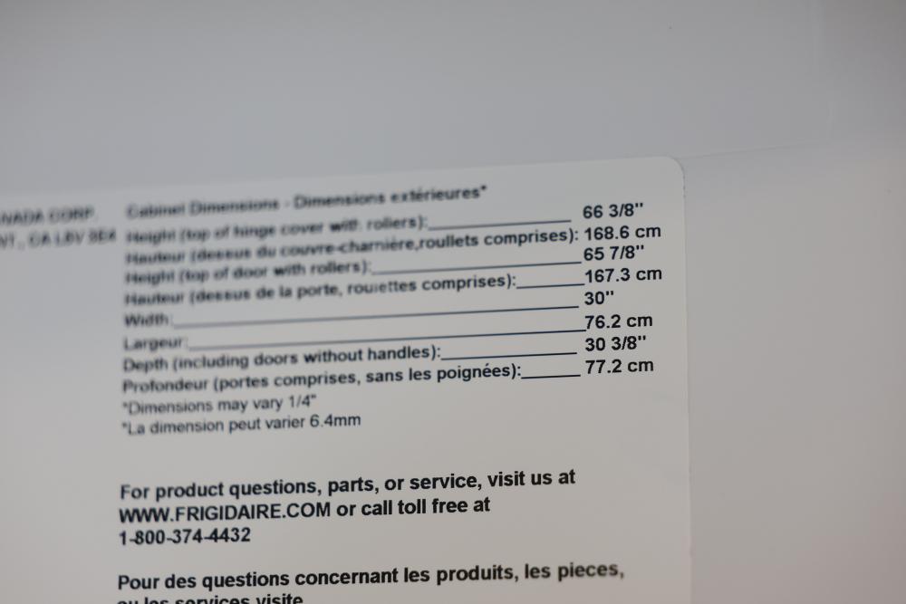Frigidaire 30-Inch White Refrigerator/Freezer with dimensions of 66 3/8 inches in height (with rolls), 30 inches in width, and 72.2 cm in depth (including doors without handles). Features include adjustable shelves, clear drawers, and Cyclopentane insulation with an Energy Star certification. The energy guide indicates an estimated yearly cost of $57 with 410 kWh usage. Pickup only.