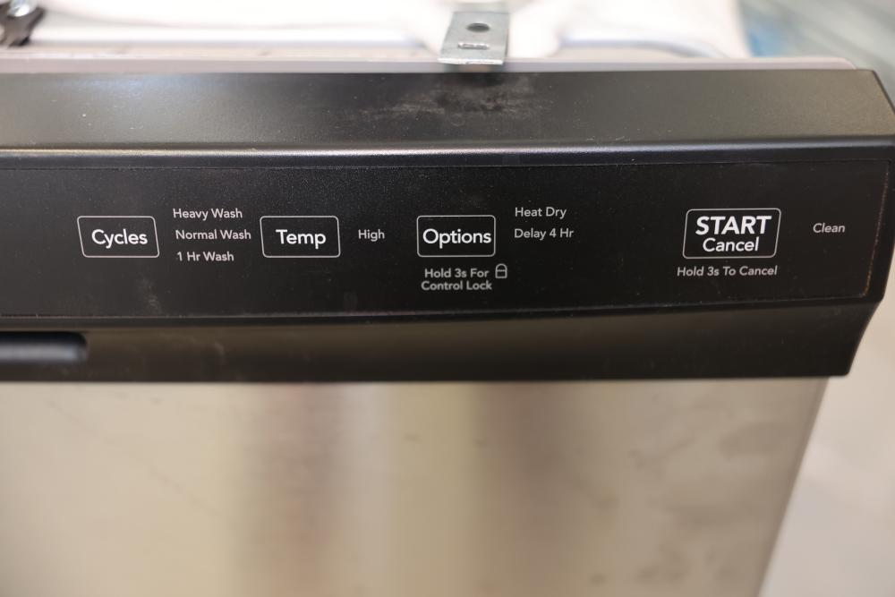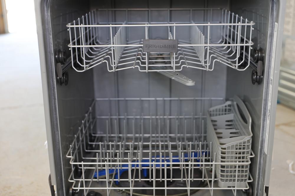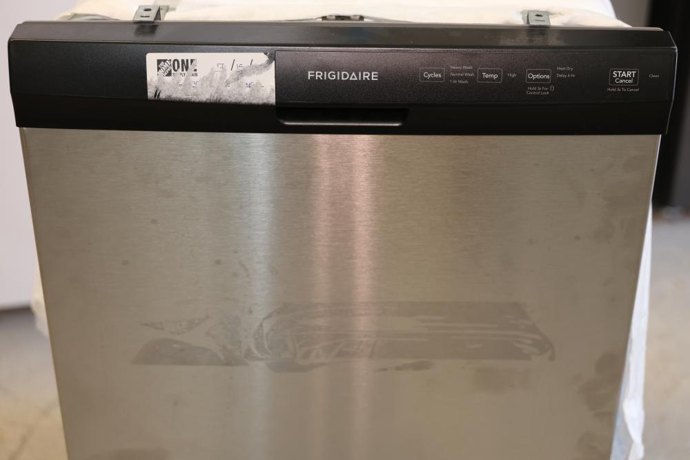 Frigidaire dishwasher with stainless steel front panel, model #FFD2413US7B. Features include multiple washing cycles, heat dry option, delay start, and control lock functionality. Dimensions are 29.75"H x 23.25"W x 24.25"D. Pickup only.
