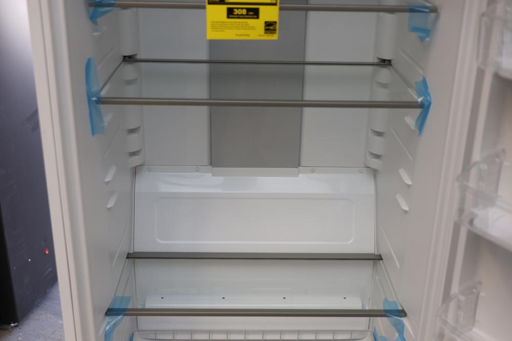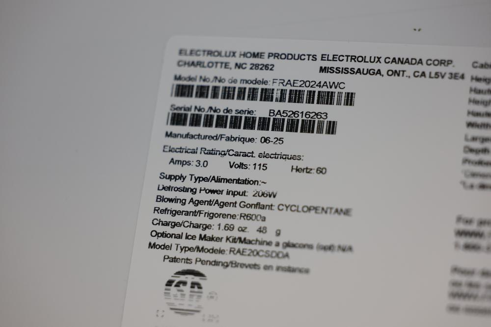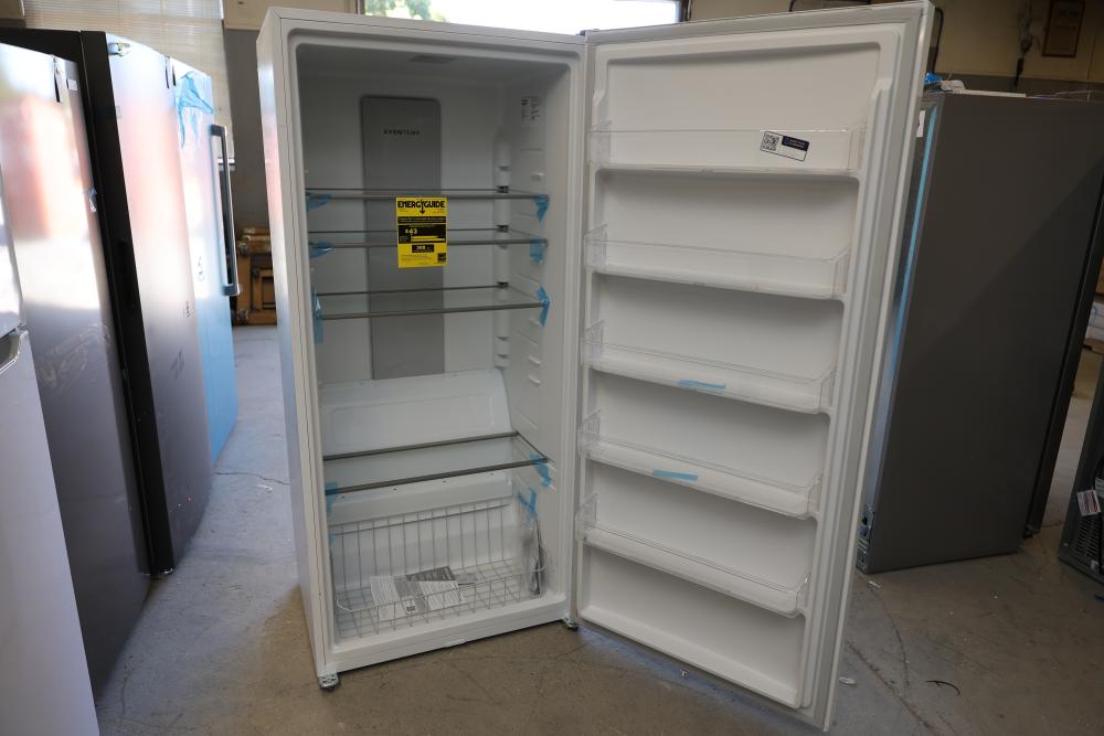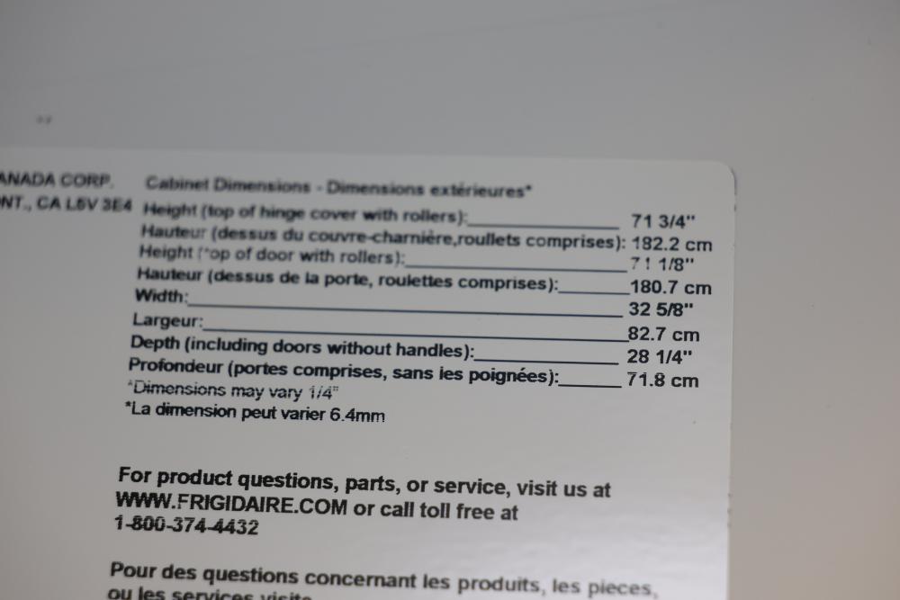 Frigidaire All-Refrigerator, 20.0 cu ft, Model FRAE2024AWC. Features a sleek white finish with a high-capacity design. Exterior dimensions include a height of 71 1/4 inches, width of 32 5/8 inches, and depth of 28 1/4 inches. The unit includes multiple adjustable glass shelves, a wire storage basket, and door shelves for additional storage. Pickup only.