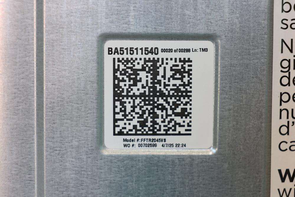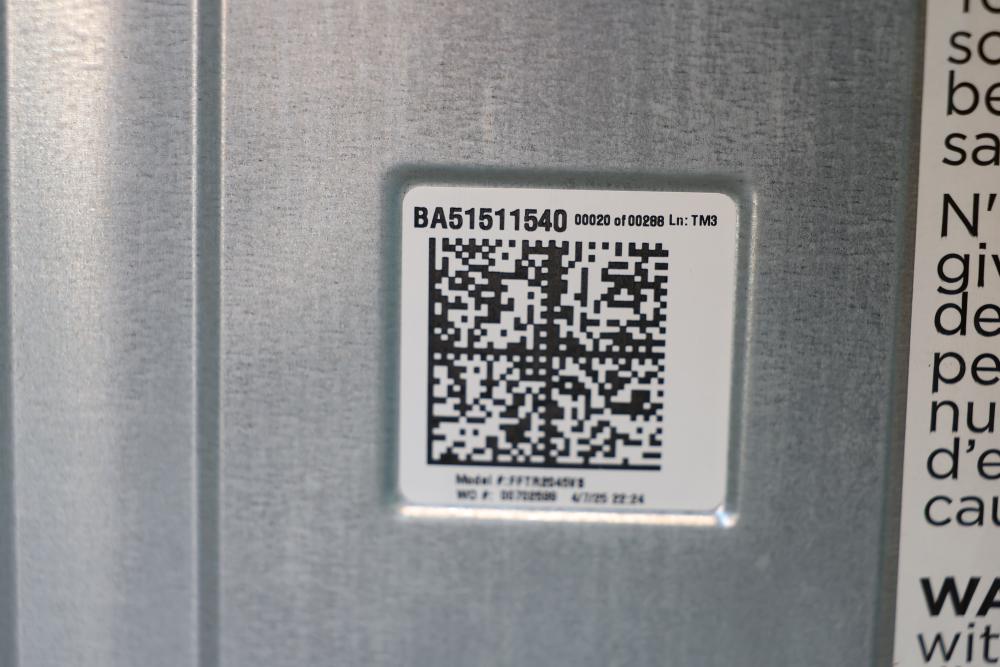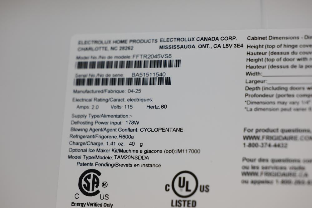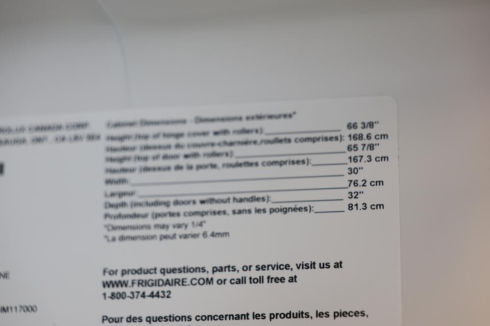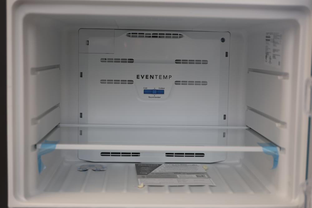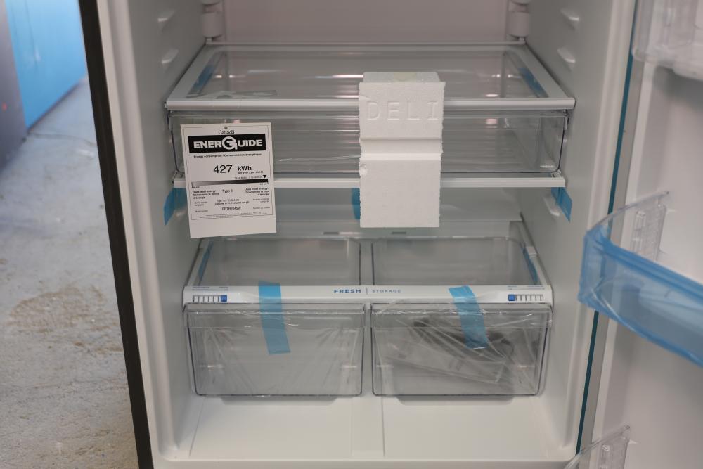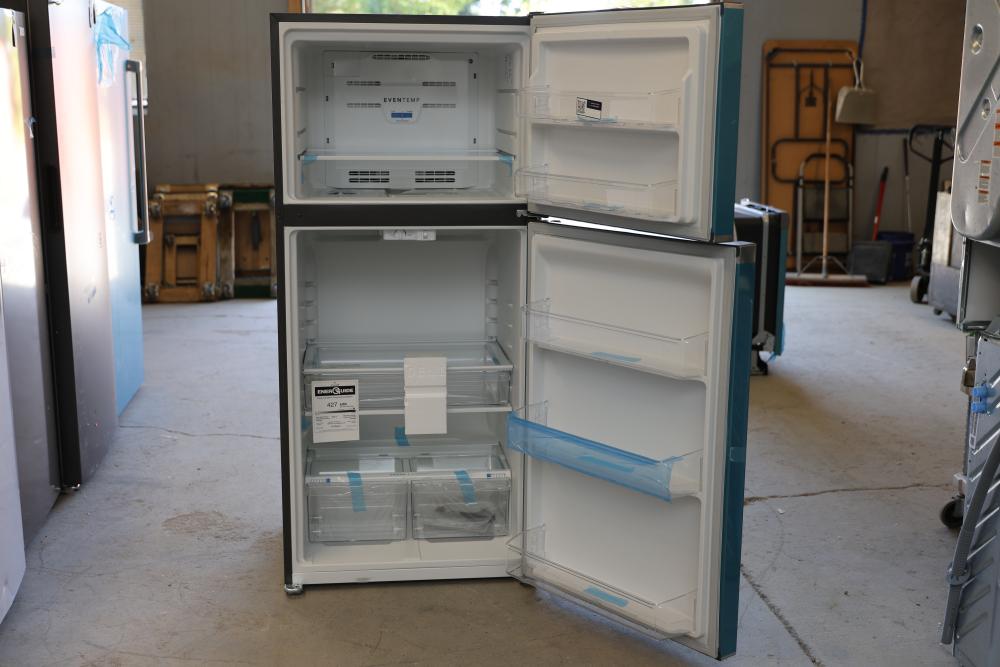 Frigidaire top freezer refrigerator featuring Eventemp technology for balanced cooling. Model no. FFTR2045VS, with a capacity of 427 liters. Includes adjustable shelves, clear crisper drawers, interior lighting, and Energy Star certification. 67"H x 30"W x 32"D. Pickup only.