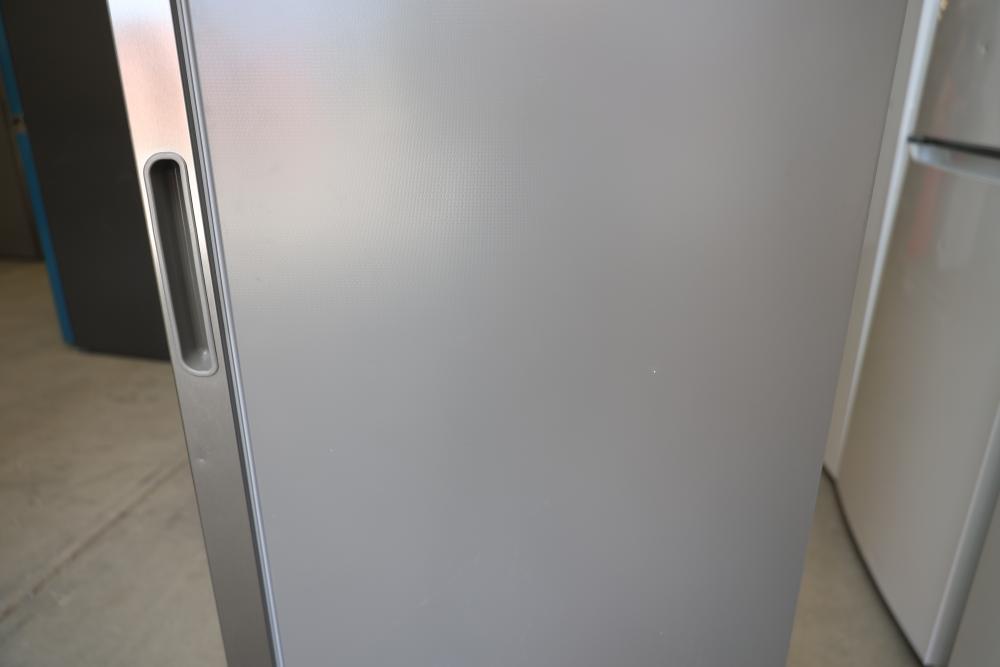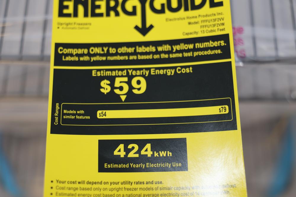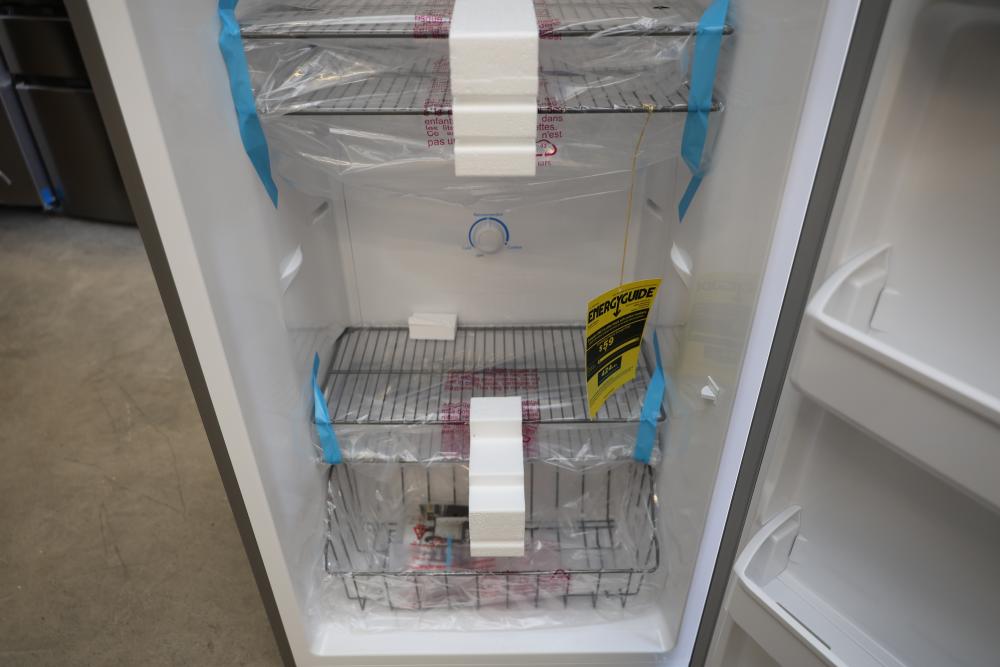 Frigidaire Upright Freezer with 13.8 cubic feet capacity, adjustable temperature control, and Energy Guide indicating an estimated yearly energy cost of $59. Features include a stainless steel exterior with minor scuffs and surface marks, and an interior equipped with wire baskets and shelves for organization. Dimensions are 67.64 inches in height, 27.72 inches in width, and 25.59 inches in depth. Pickup only.
