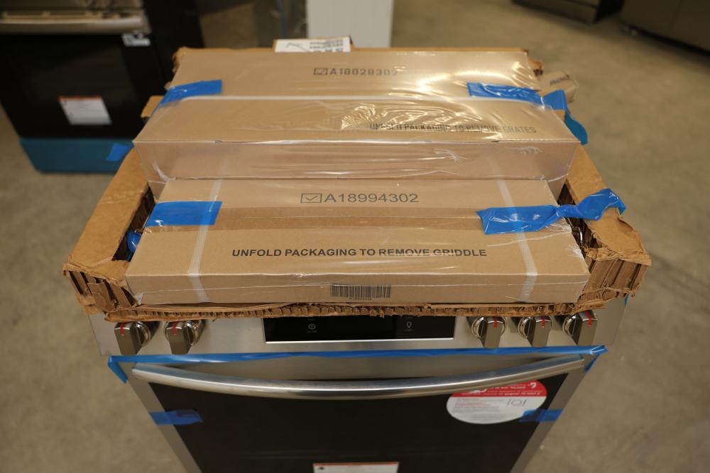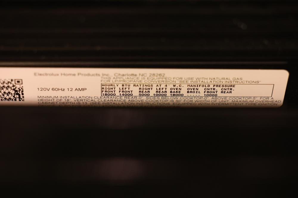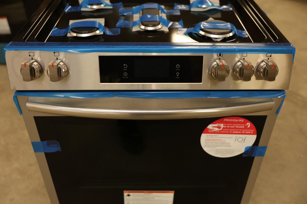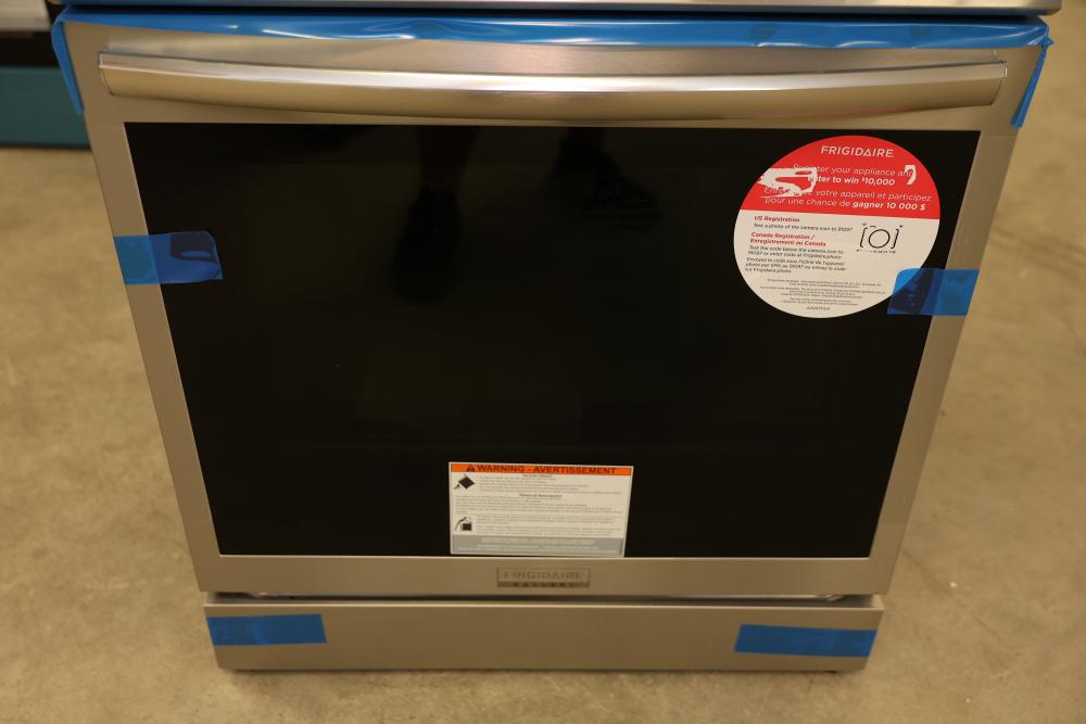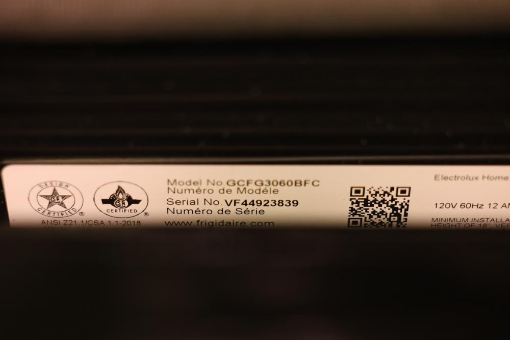 Frigidaire Gallery Gas Range with Dimensions 36.5"H x 30"W x 26.25"D. Features stainless steel finish, four-burner cooktop, and a spacious convection oven. Includes oven racks as shown. Model number is GCGF3060BFC, and it operates on 120V 60Hz 12 AMP power. Pickup only.
