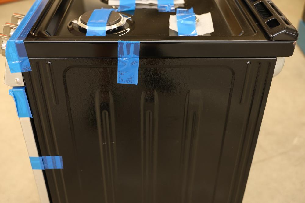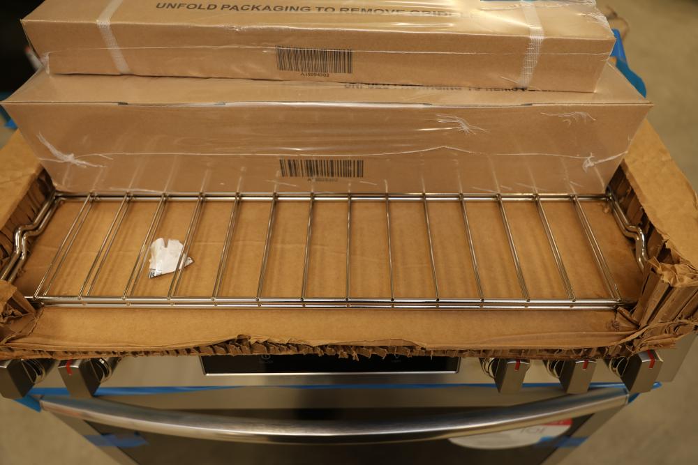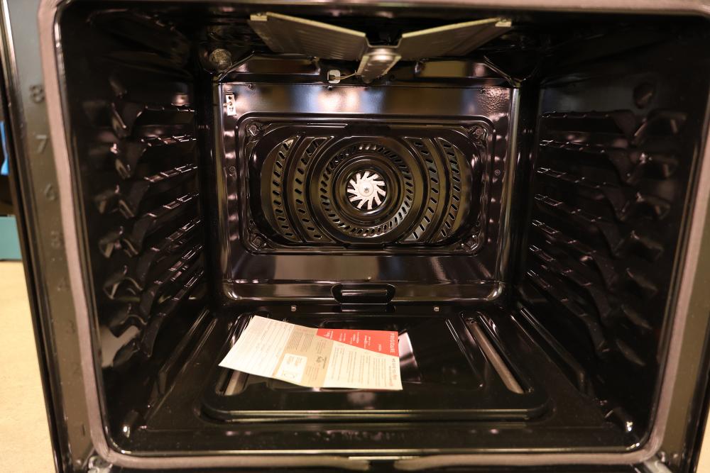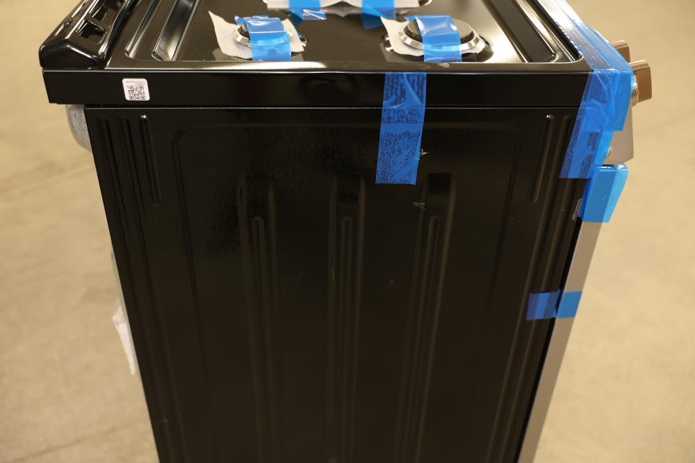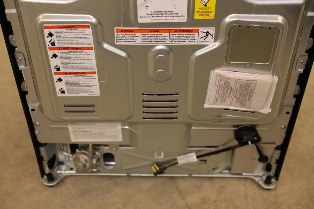 Frigidaire Gallery Gas Range with Dimensions 36.5"H x 30"W x 26.25"D. Features stainless steel finish, four-burner cooktop, and a spacious convection oven. Includes oven racks as shown. Model number is GCGF3060BFC, and it operates on 120V 60Hz 12 AMP power. Pickup only.