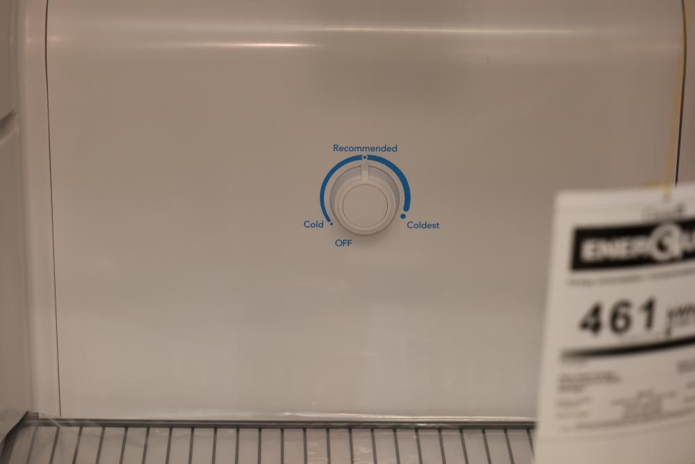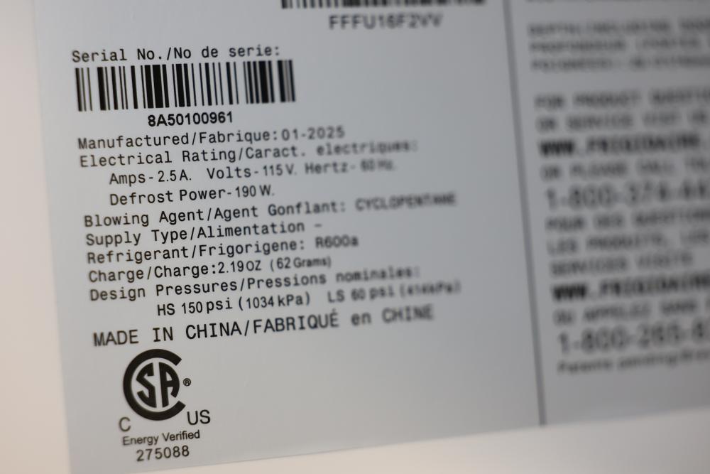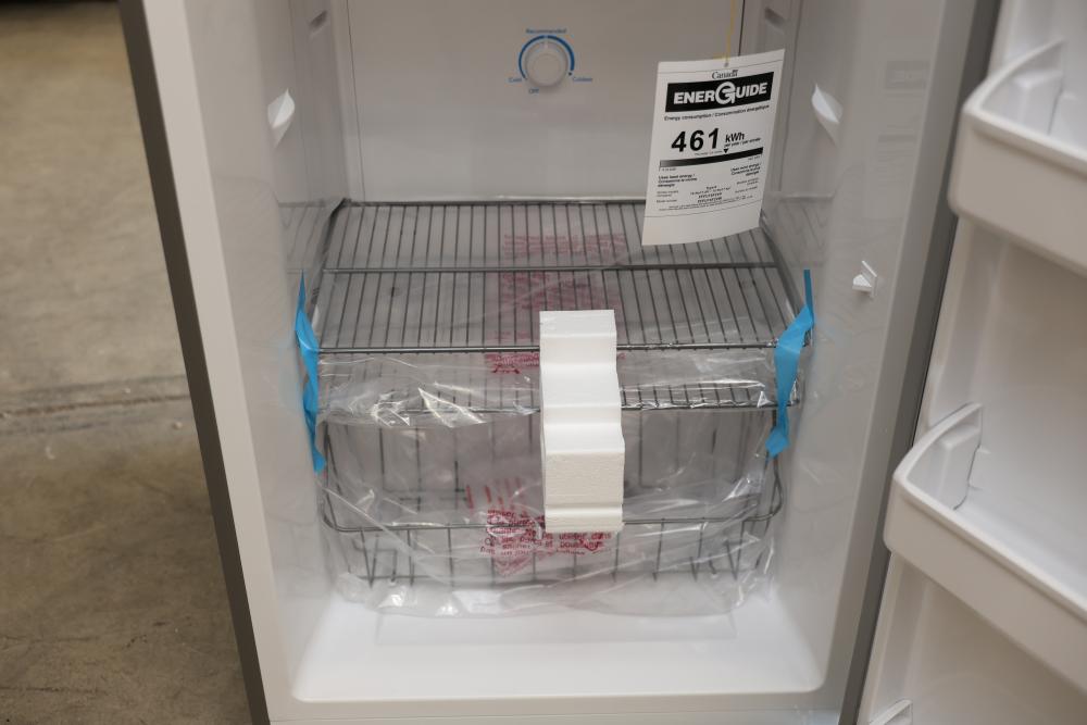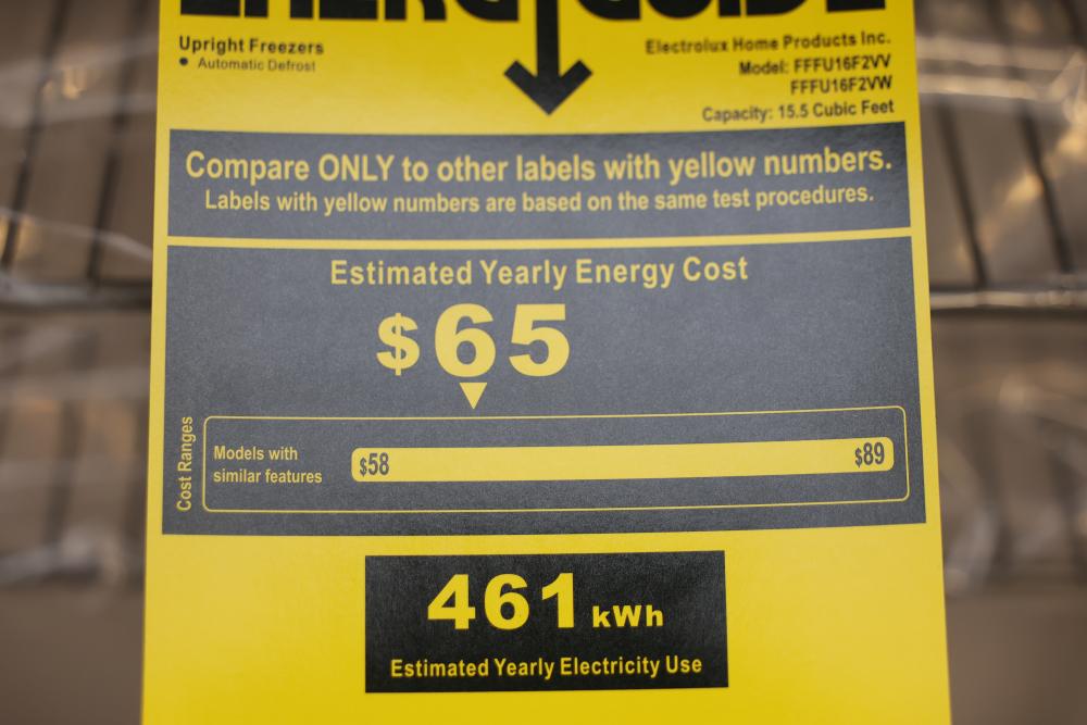 Frigidaire upright freezer, measuring 60 inches in height, 28.5 inches in width, and 27.75 inches in depth. Features include a mechanical temperature control knob, energy-efficient design with an annual electricity usage of 461 kWh, and a cooling system powered by cyclopentane and R600a refrigerant. Includes standard power plug. Pickup only.
