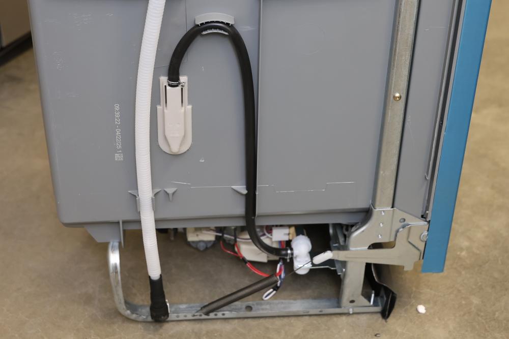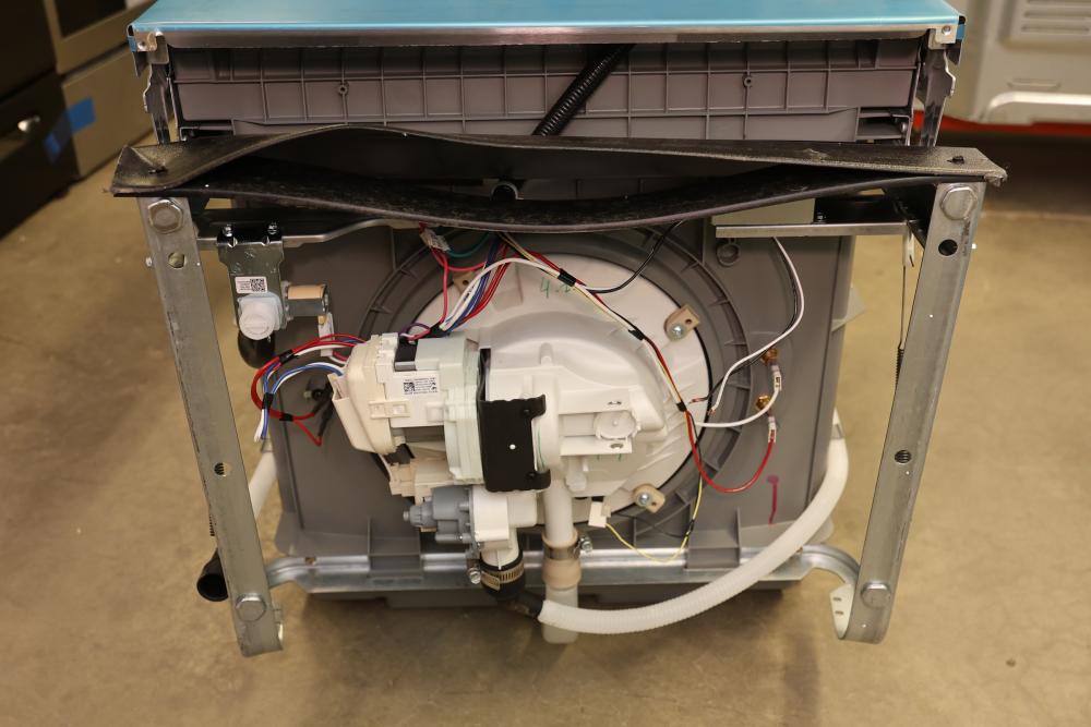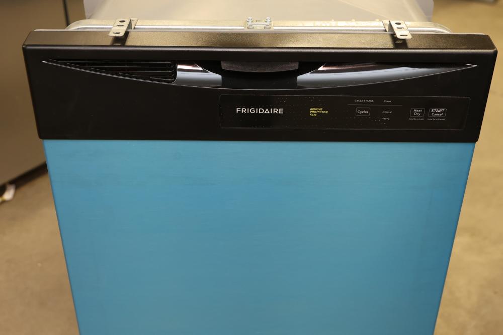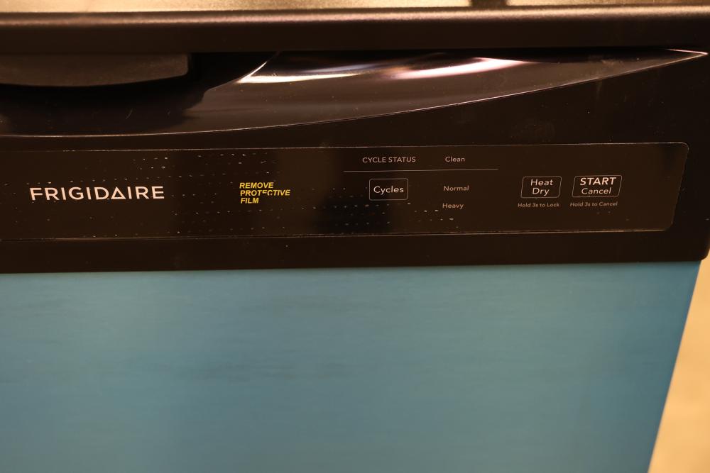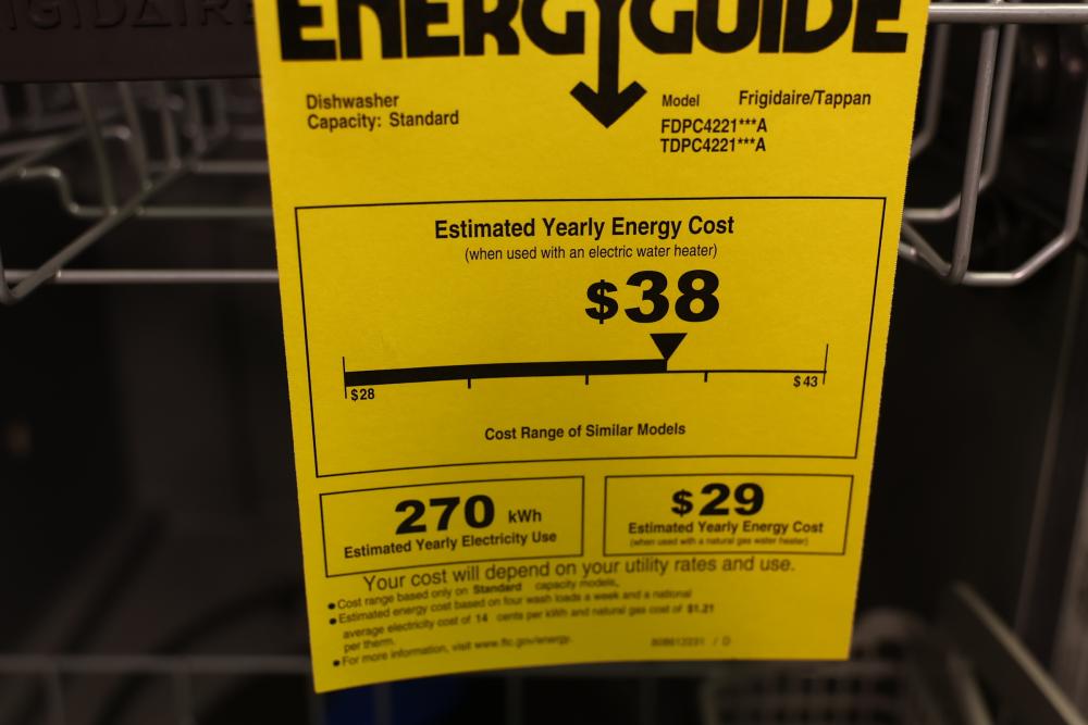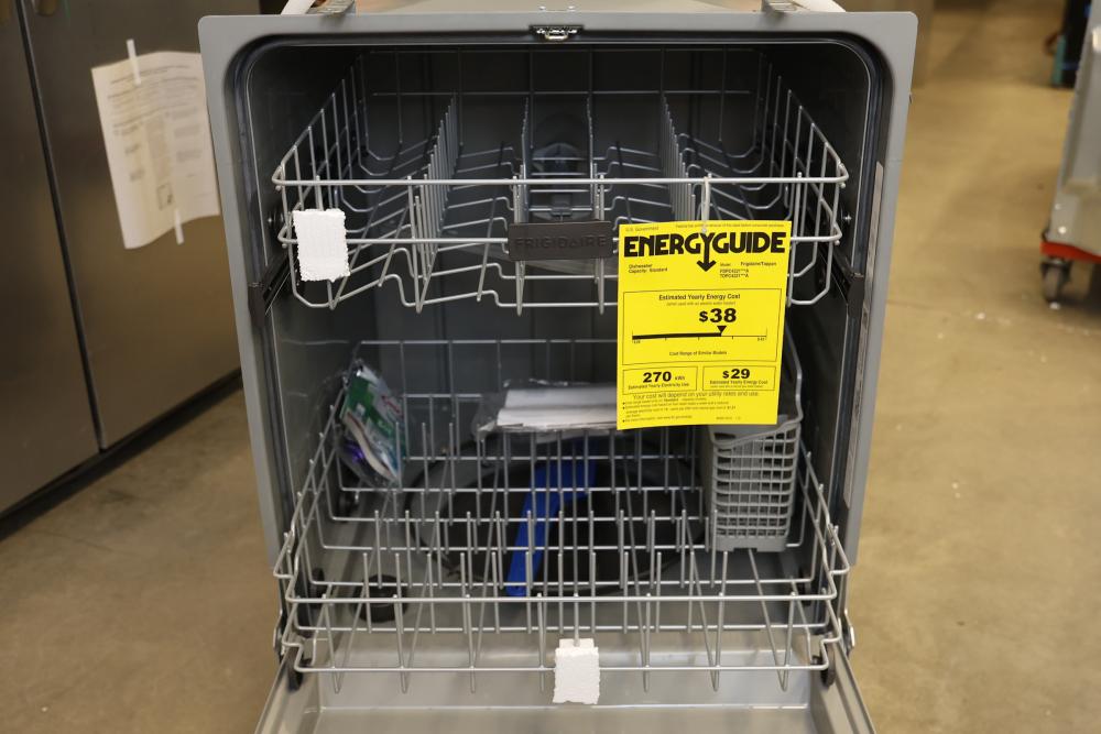 Frigidaire Dishwasher with Energy Guide Label. Features front electronic controls, lower and upper rack setup, integrated detergent dispenser, and wiring components exposed at the back. The dishwasher includes an annual energy estimation of $38 and usage of 270 kWh as per the attached Energy Guide. 33.5"H x 24"W x 25"D. Pickup only.