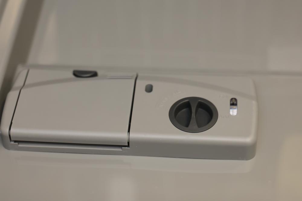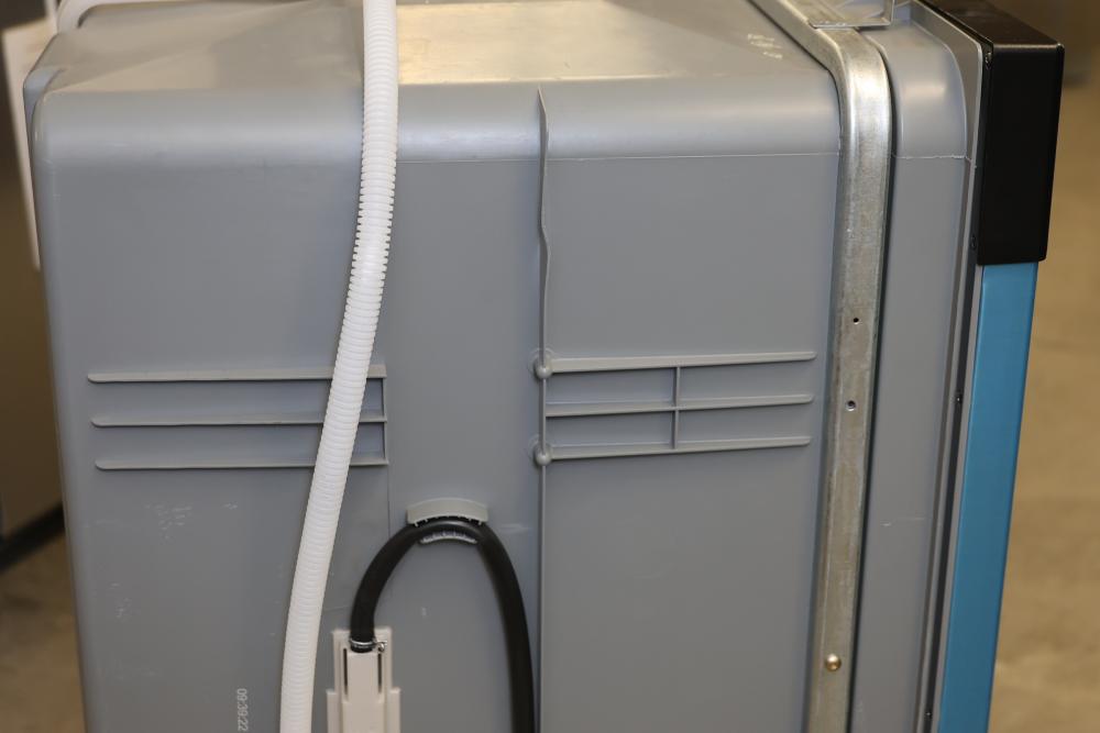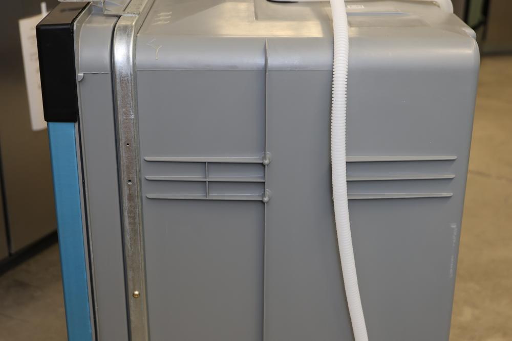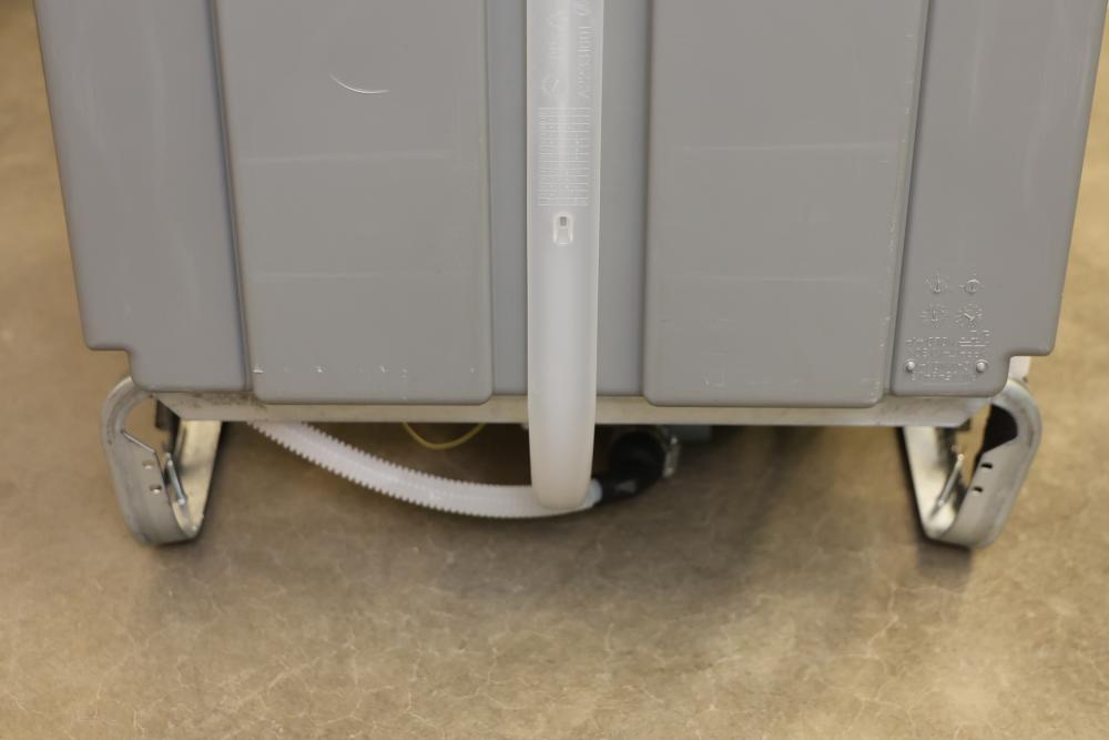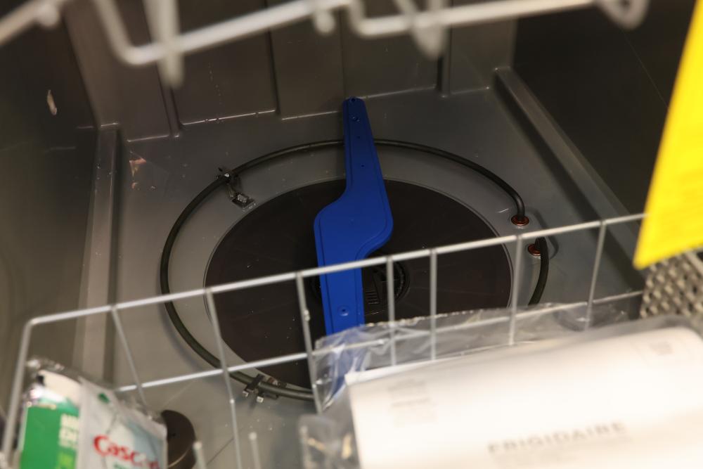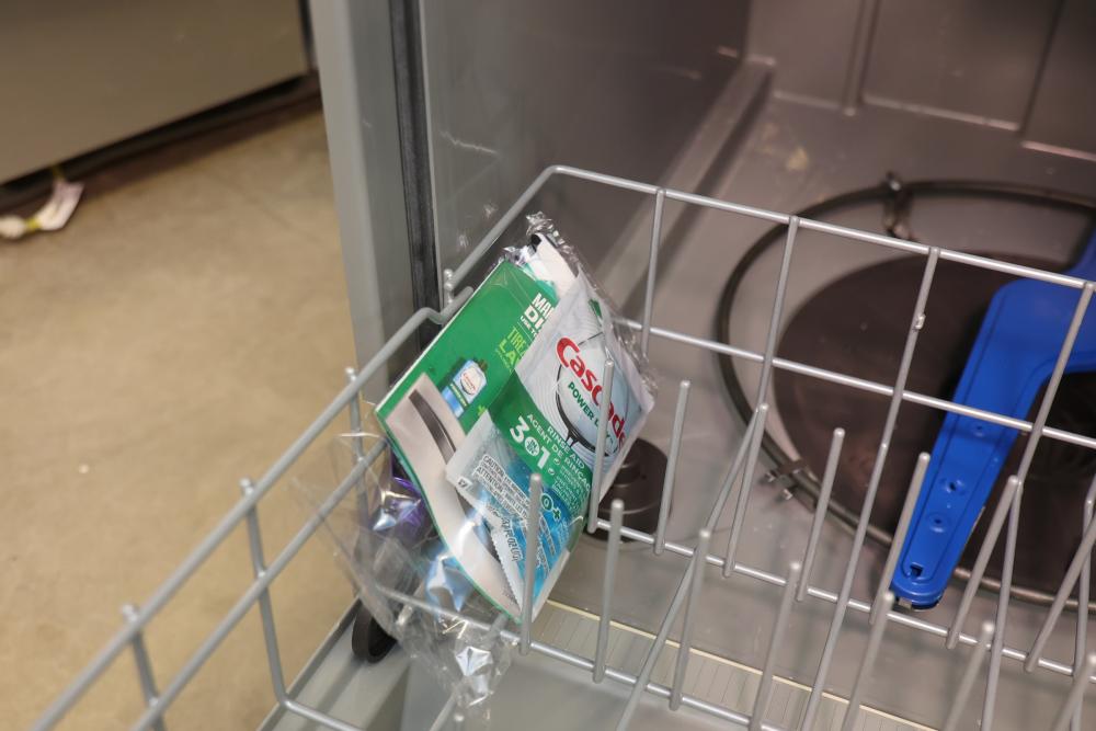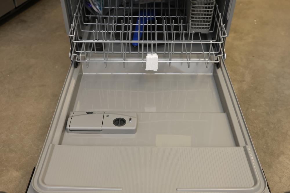 Frigidaire Dishwasher with Energy Guide Label. Features front electronic controls, lower and upper rack setup, integrated detergent dispenser, and wiring components exposed at the back. The dishwasher includes an annual energy estimation of $38 and usage of 270 kWh as per the attached Energy Guide. 33.5"H x 24"W x 25"D. Pickup only.