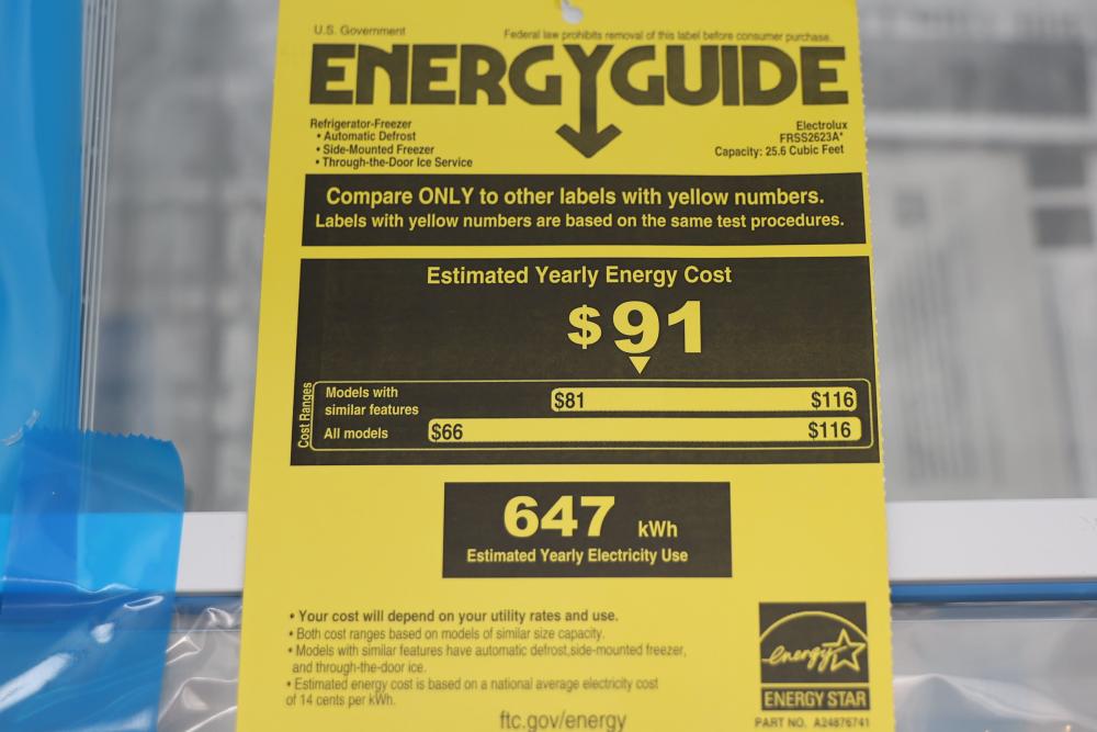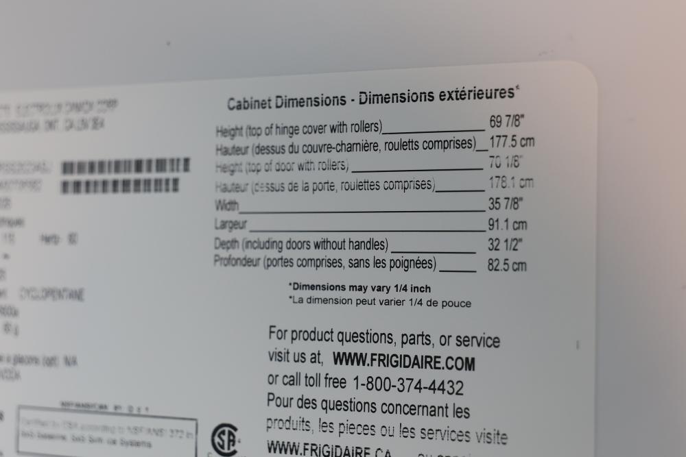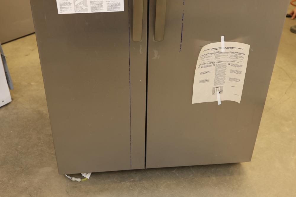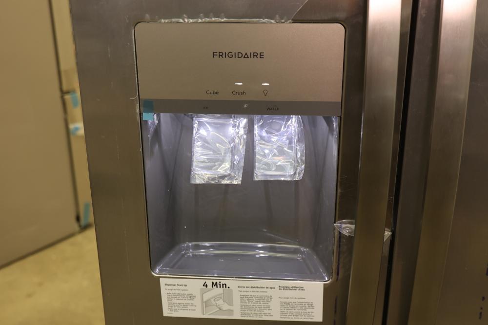 Frigidaire stainless steel side-by-side refrigerator with built-in water and ice dispenser. Features a PureAir Ultra II air filter, LED lighting, and multiple interior shelves and compartments for organized storage. Energy-efficient design with an estimated yearly energy cost of $91. Dimensions: Height 69 7/8 inches, width 36 inches, depth 32 inches. Pickup only.