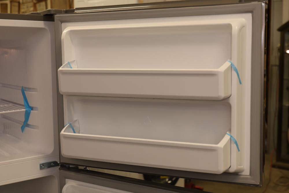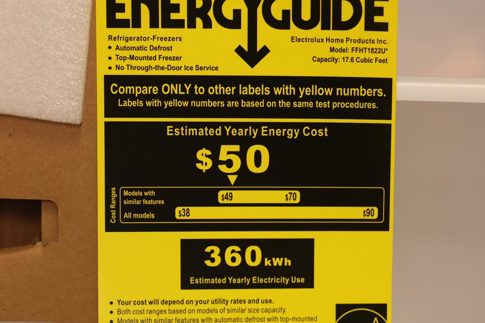 Frigidaire FFHT1822UV 18.3 Cu. Ft. stainless steel refrigerator featuring a top-mounted freezer, adjustable temperature controls, and a freshness controlled crisper drawer. Includes spacious storage shelves, door bins, and a wire rack in the freezer section. Energy-efficient with an estimated yearly energy cost of $50 and operates on 1.7 Amps, 115V, 60Hz. Dimensions: Height 1700mm, Width 708mm, Depth 783mm. Pickup only.