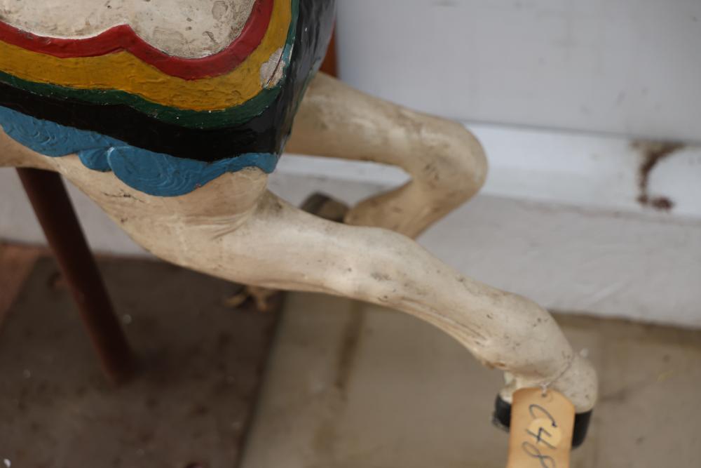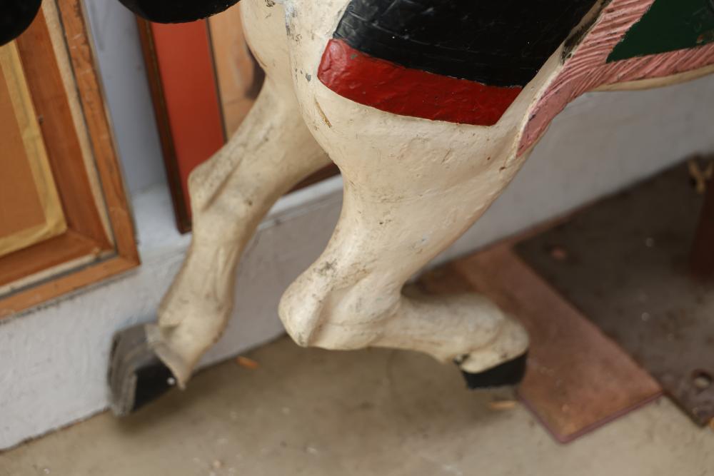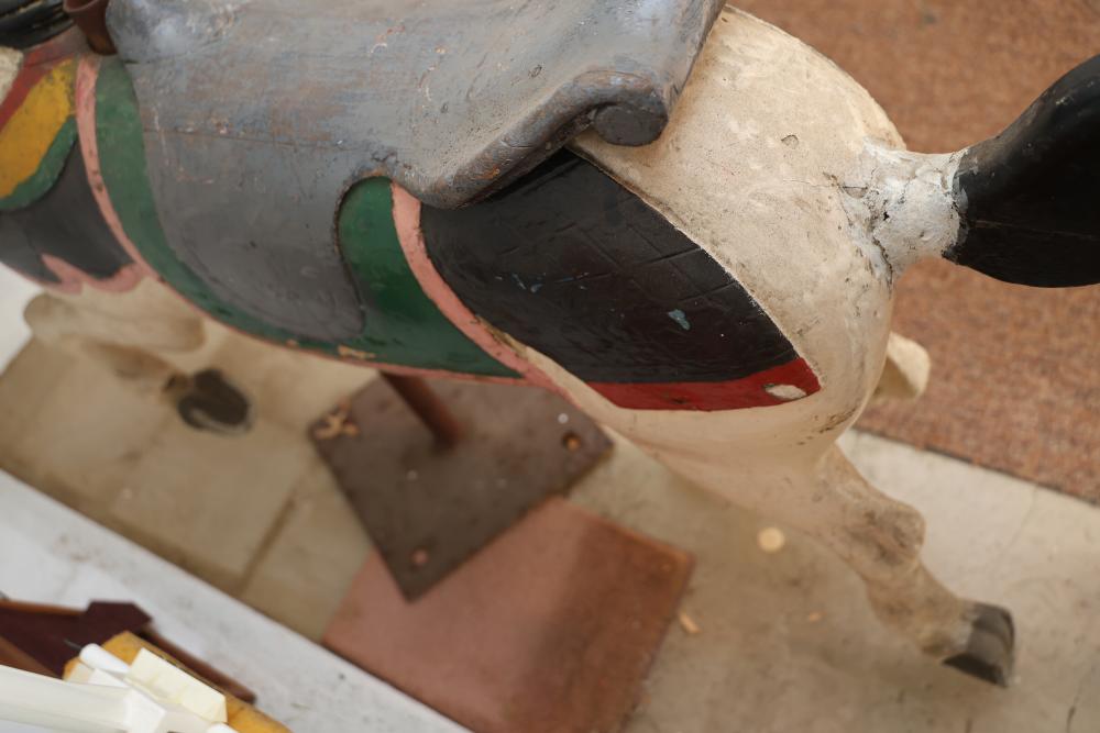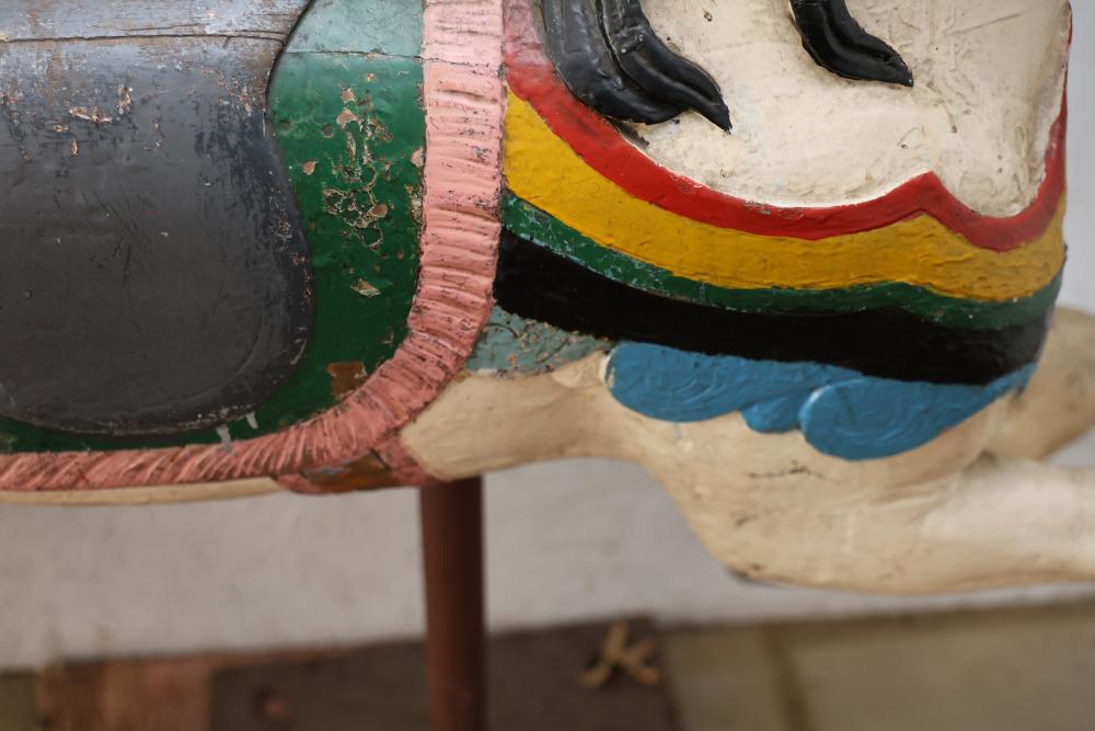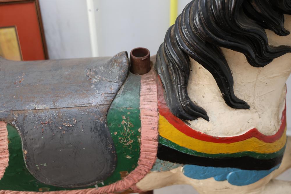 Hand-Painted Wooden Carousel Horse with Metal Base. Features a brightly painted saddle, mane, and decorative details. Mounted on a steady metal stand. Visible signs of wear typical of use and age, including paint chipping and surface marks. Seller reports to be one of the original Coney Island Carousel Horses.