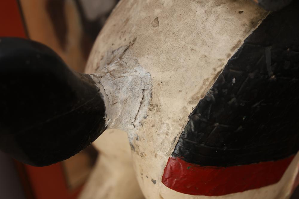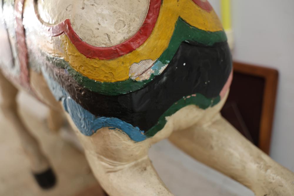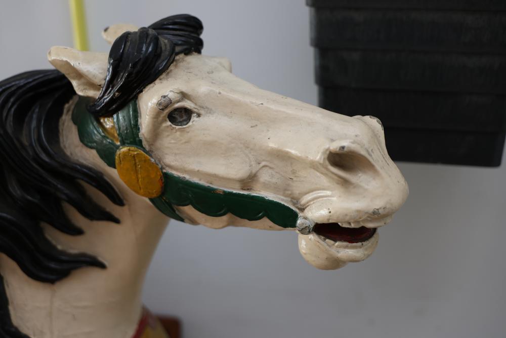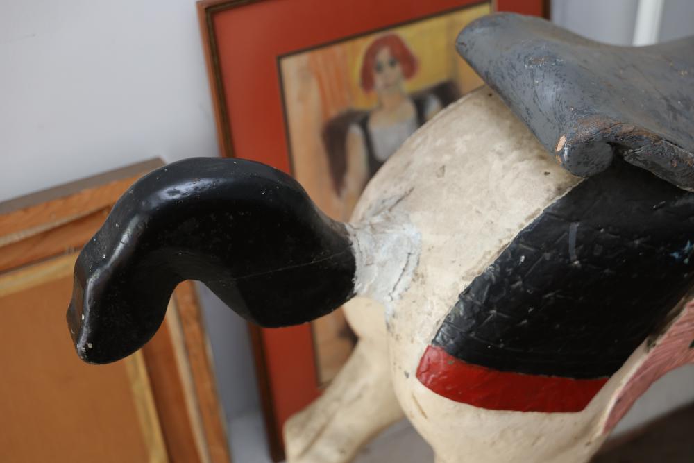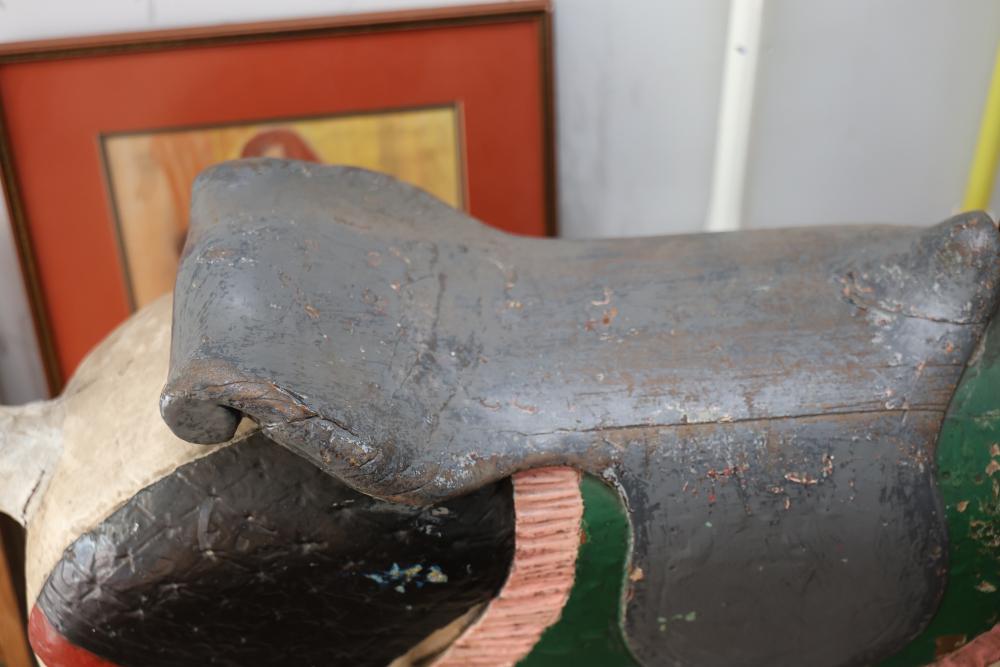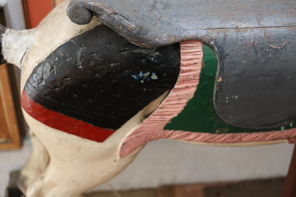 Hand-Painted Wooden Carousel Horse with Metal Base. Features a brightly painted saddle, mane, and decorative details. Mounted on a steady metal stand. Visible signs of wear typical of use and age, including paint chipping and surface marks. Seller reports to be one of the original Coney Island Carousel Horses.