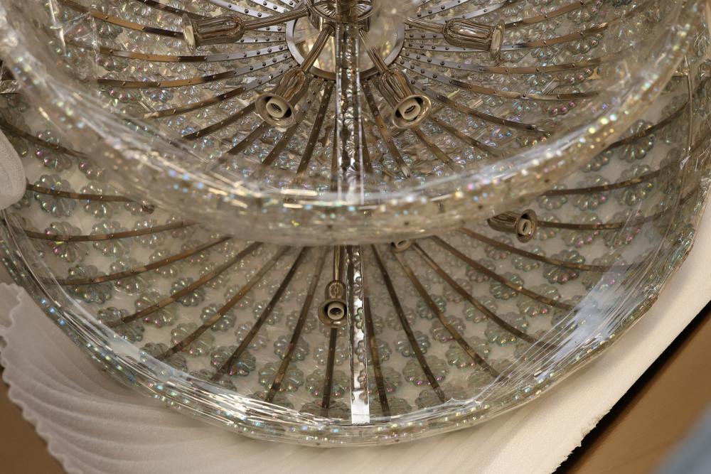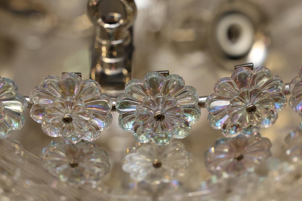 Hudson Valley Polished Nickel Chandelier with Crystal Beading. Features a tiered design with decorative crystal flower accents, polished nickel frame, and multiple bulb sockets. Includes assembly parts such as chain, canopy, and hardware. Pickup only.