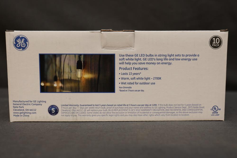 GE LED String Light Replacement Bulbs, 40 Bulbs Total. Includes four boxes containing 10 bulbs each, designed for outdoor use with a soft white light appearance. Each bulb is 1 watt, with a brightness of 60 lumens and an estimated life of 13.7 years based on 3-hour daily usage. Includes screw-type E26 bases and an energy-saving design. Pickup only.