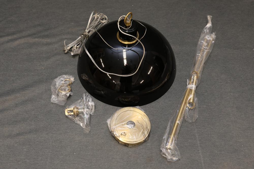 Mitzi H769701S-AGB/GBK Pendant Light in Aged Brass and Black. Includes dome-shaped black shade, brass mounting hardware, and wiring components. Original packaging with assembly parts as shown. Pickup only.