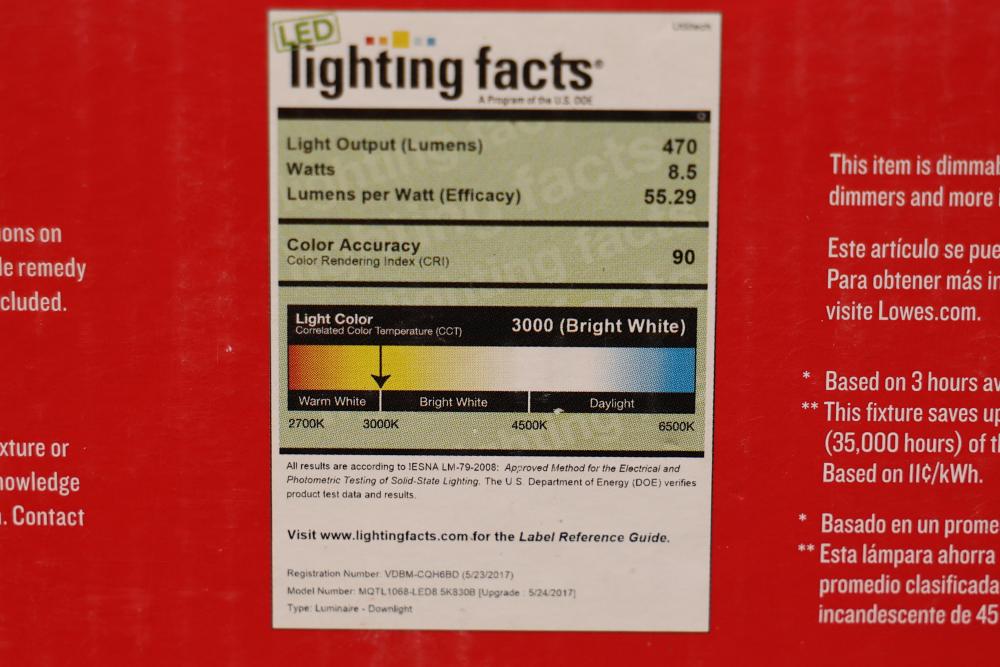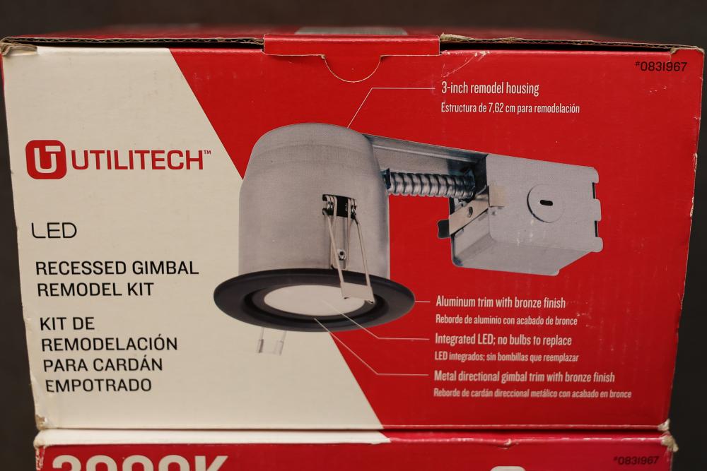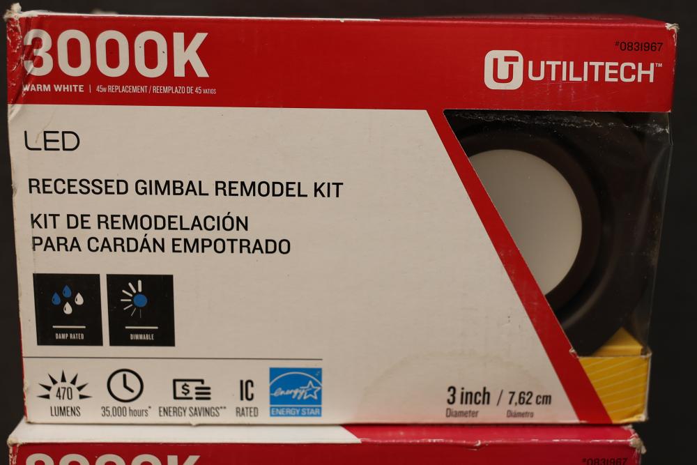 Utilitech LED Recessed Gimbal Remodel Kits, 2-Pack, 3000K. Each kit includes a 3-inch remodel housing and LED light providing a 3000K warm white color temperature, 470 lumens, and 8.5 watts with 55.29 lumens per watt. The lights feature aluminum trims with bronze finish and directional adjustments. IC rated for insulation contact and damp location listed.