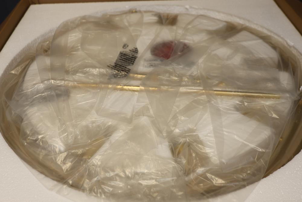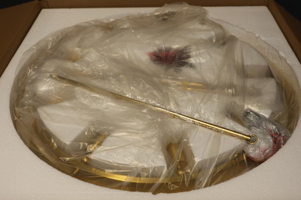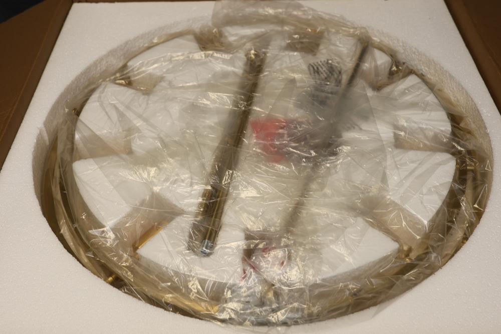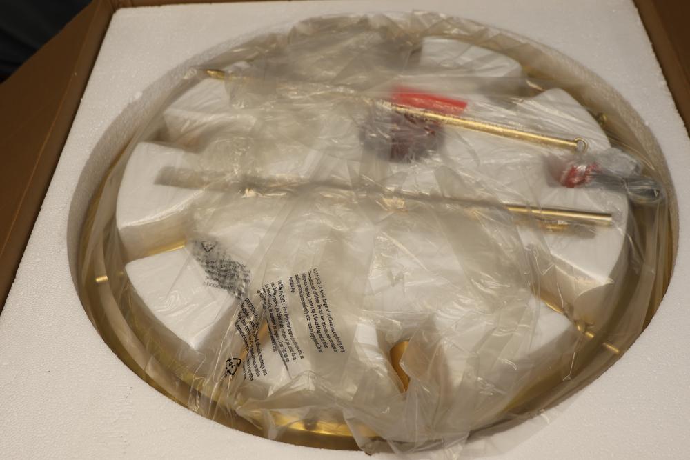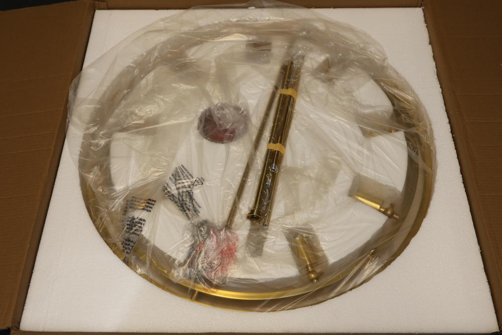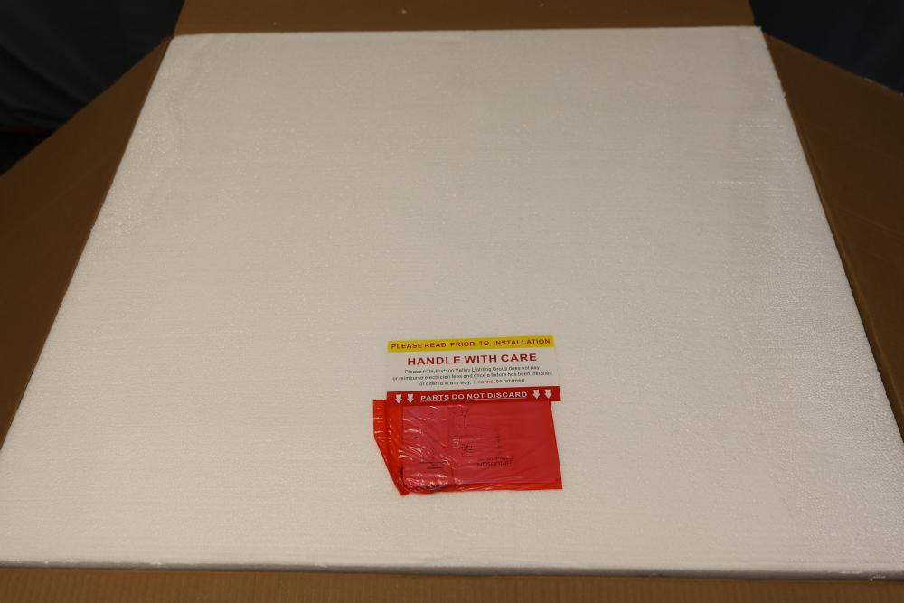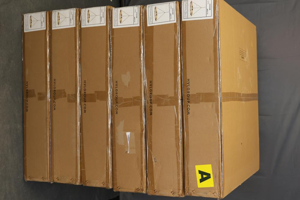 Hudson Valley Lighting 2732-AGB Pendant in Aged Brass. Includes multiple components for assembly, with detailed parts and instruction labels included in packaging. Constructed with a gold-toned aged brass finish. Set contains unopened boxes with carefully packaged pieces for protection. Pickup only.