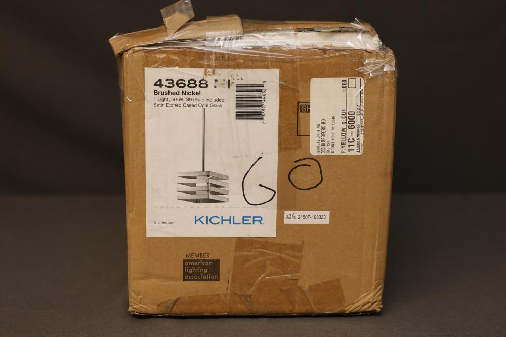 Kichler Brushed Nickel Pendant Light with Satin Etched Cased Opal Glass. Includes fixture components, wiring, mounting bracket, and instruction manual. Designed for 50W G9 bulb, which is included. Satin etched cased opal glass shade complements the brushed nickel finish. All parts appear to be intact and in original packaging. Pickup only.