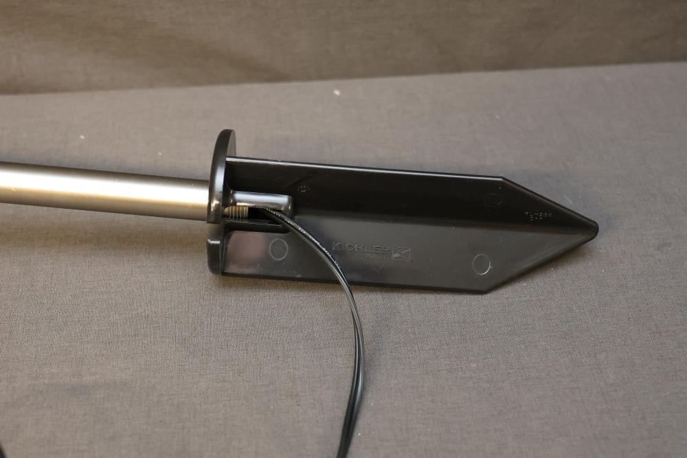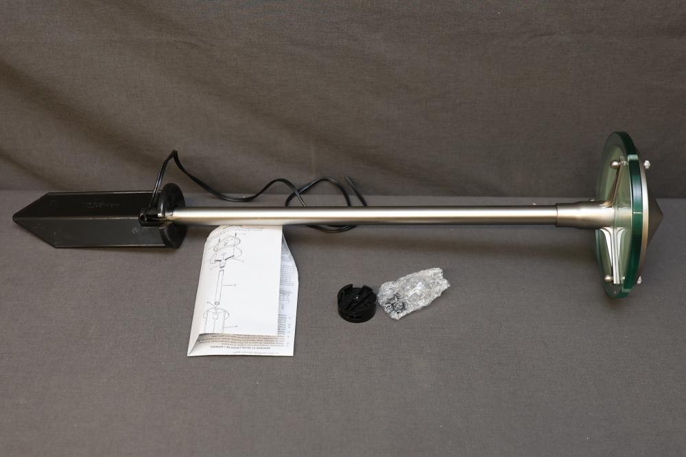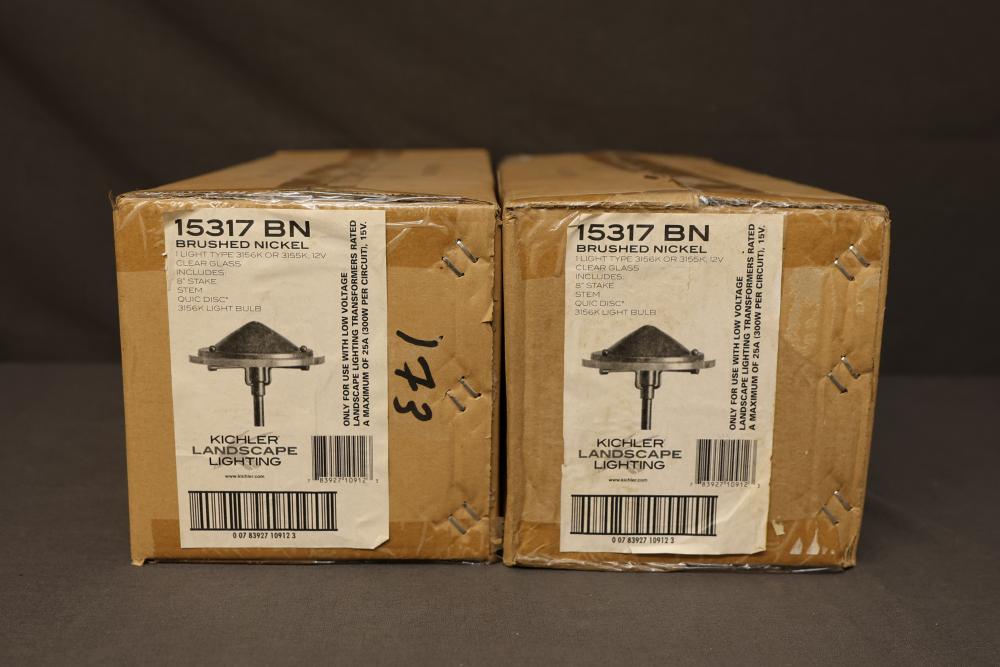 Kichler Brushed Nickel Landscape Lighting Fixtures. Includes two 15317 BN fixtures with clear glass shades, stems, and stakes. Designed for low-voltage use with 12V circuits, each fixture supports a 3156K light bulb. New in box with assembly instructions included.