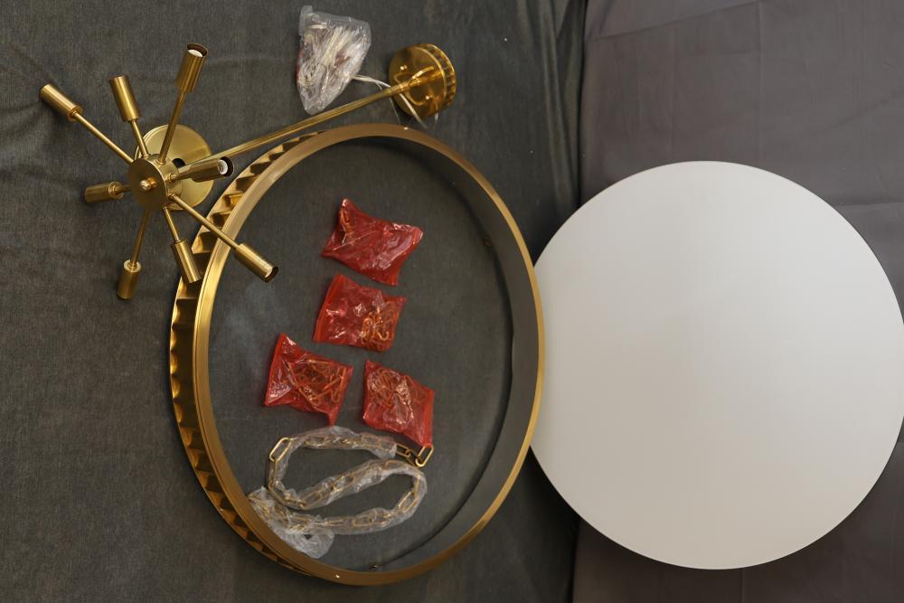 Hudson Valley Lighting Pendant Model 903-AGB in aged brass finish. The fixture includes a round metal frame, chains, wiring, and a white glass shade. Packaged in its original box, it is suitable for ceiling installation. Pickup only.