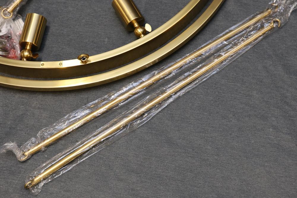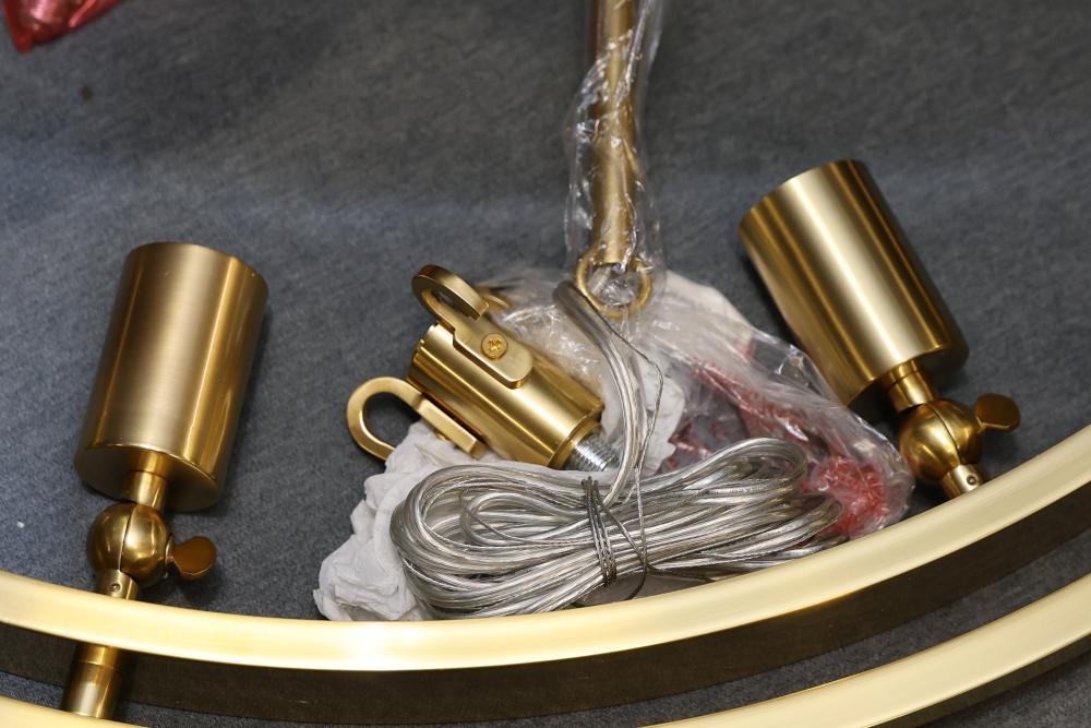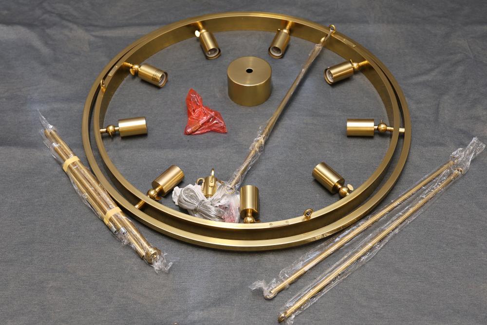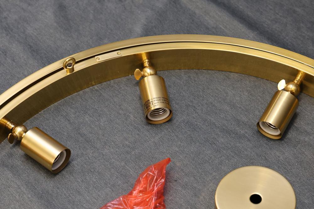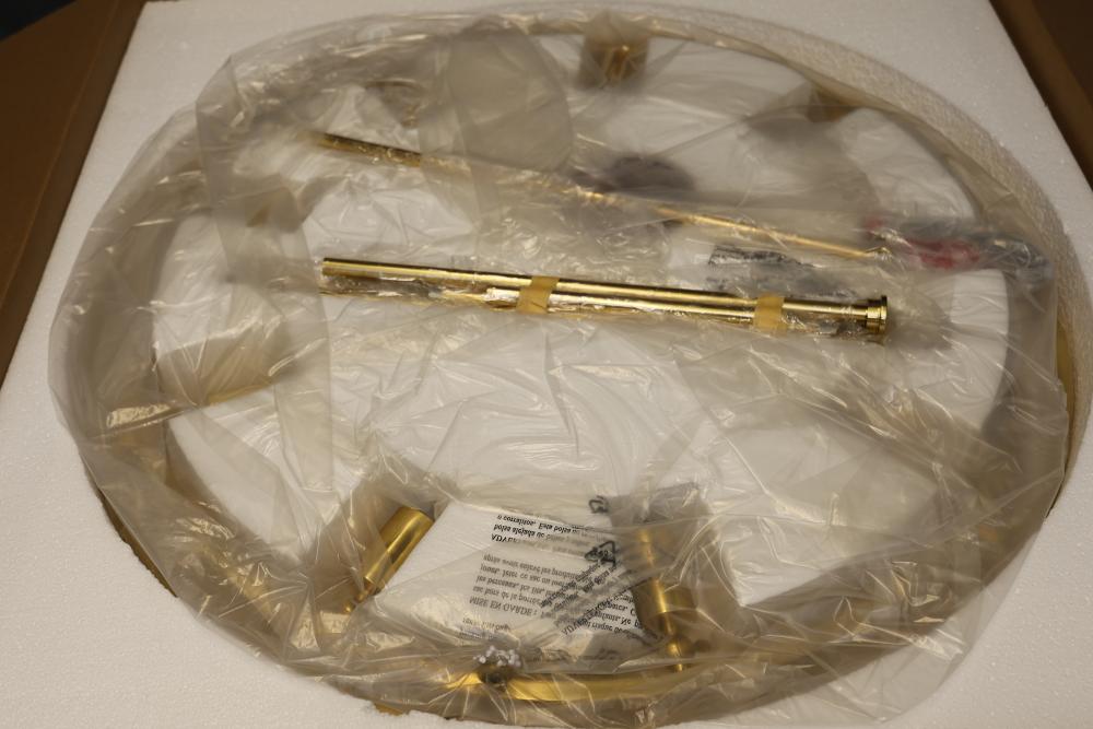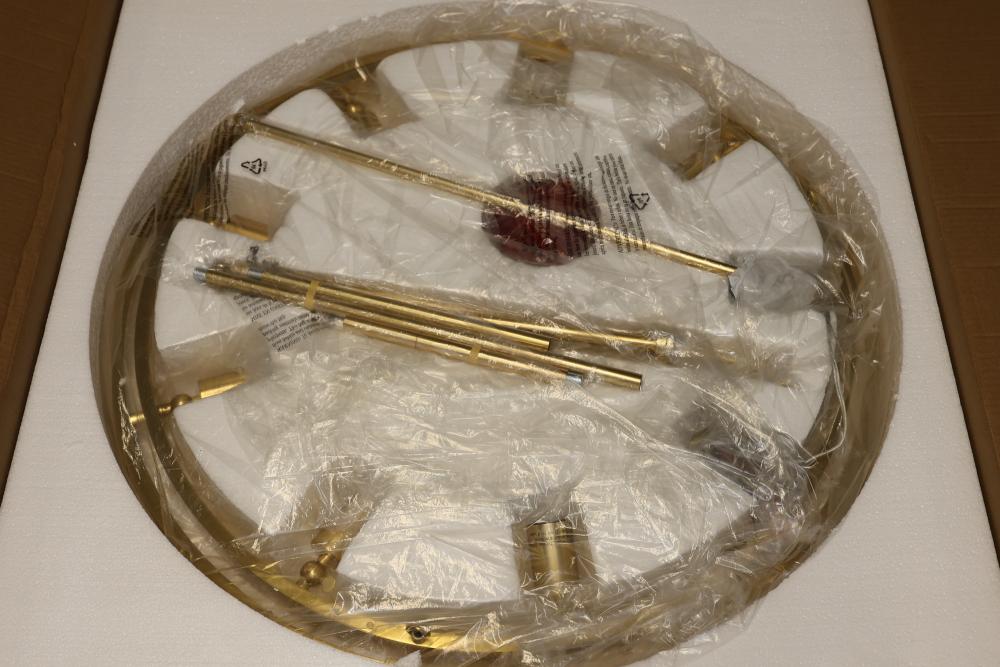 Hudson Valley Lighting Pendant in Aged Brass, Model 2732-AGB. This item includes all parts required for assembly, featuring a circular frame with multiple light fittings and aged brass finish. The lighting fixture is packaged in original boxes with protective materials. Suitable for indoor installation. Pickup only.