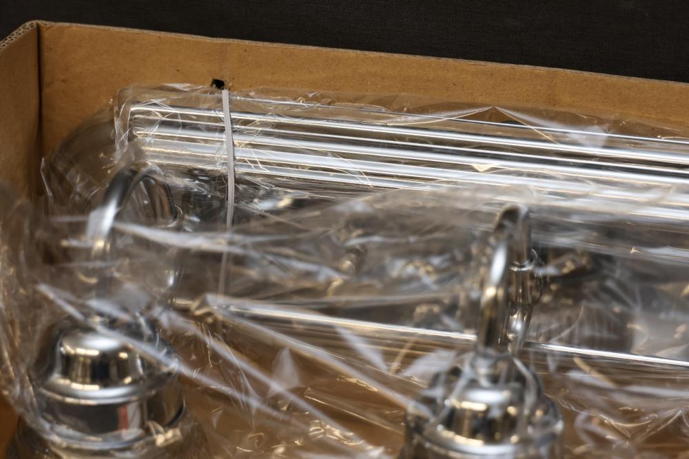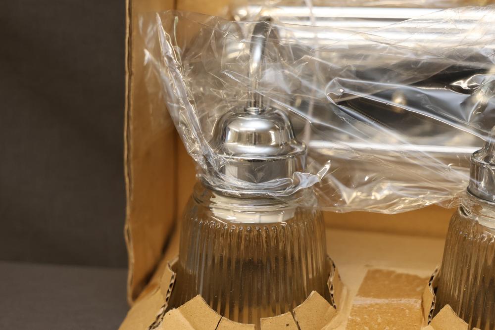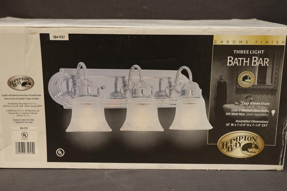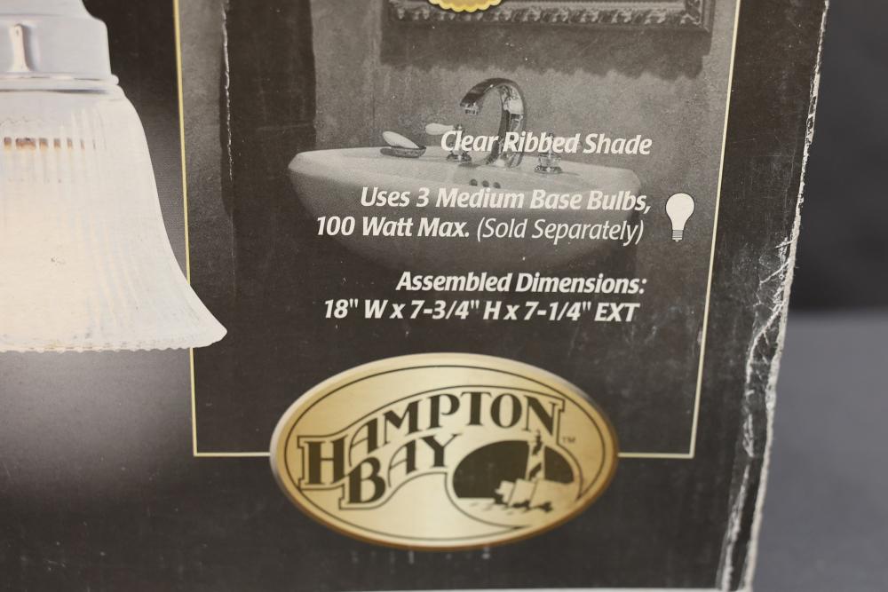 Hampton Bay Three-Light Bath Bar in Chrome Finish with clear ribbed glass shades. Uses three medium base bulbs, with a maximum wattage of 100W (bulbs sold separately). Assembled dimensions are 18" W x 7-3/4" H x 7-1/4" EXT. Includes installation hardware and instructions. Suitable for damp locations. Pickup only.