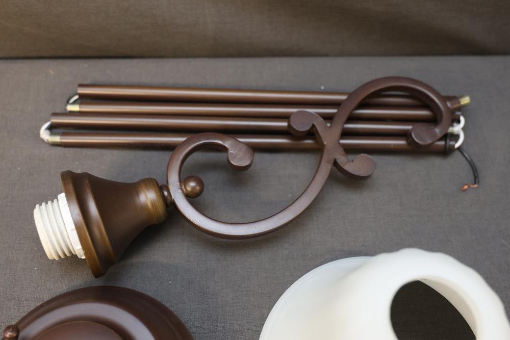Hudson Valley Wall Sconce in Old Bronze with components. Includes a frosted glass shade, metal mounting base, decorative arm, and other installation parts, as shown. All parts appear to fit the model 5400-OB. Pickup only.