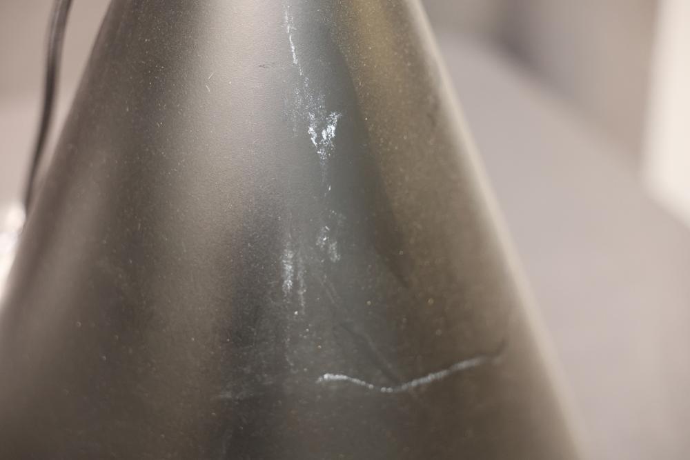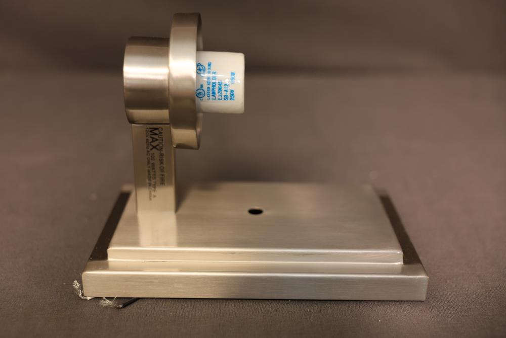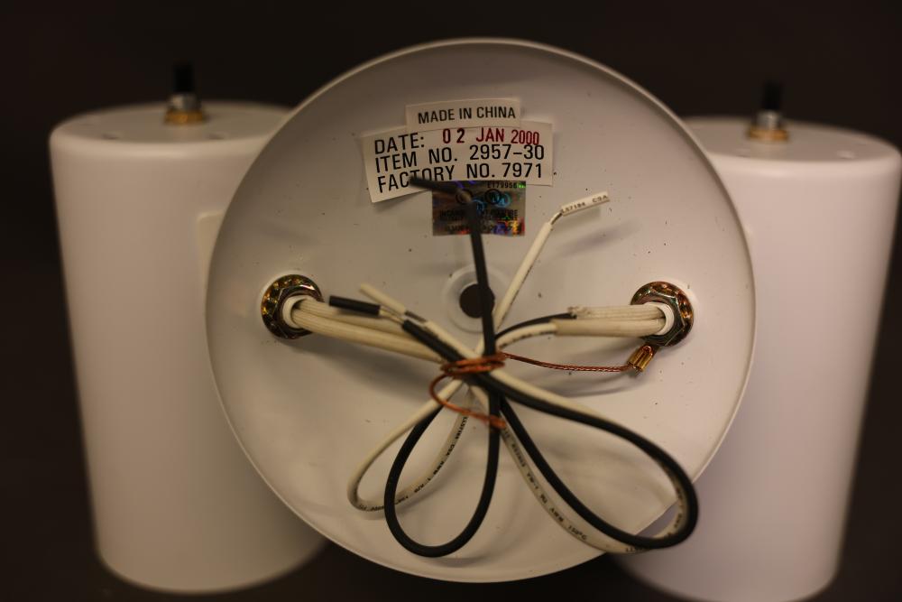 Wall-Mounted Light Fixtures with Metal Construction. Includes multiple light fixtures constructed for wall mounting and suitable for damp locations. Components include a black and gold cone-shaped fixture, dual white adjustable lamps, a rectangular white fixture, and a single-mount stainless steel lamp. Wear and scratches are visible on some pieces. Pickup only.