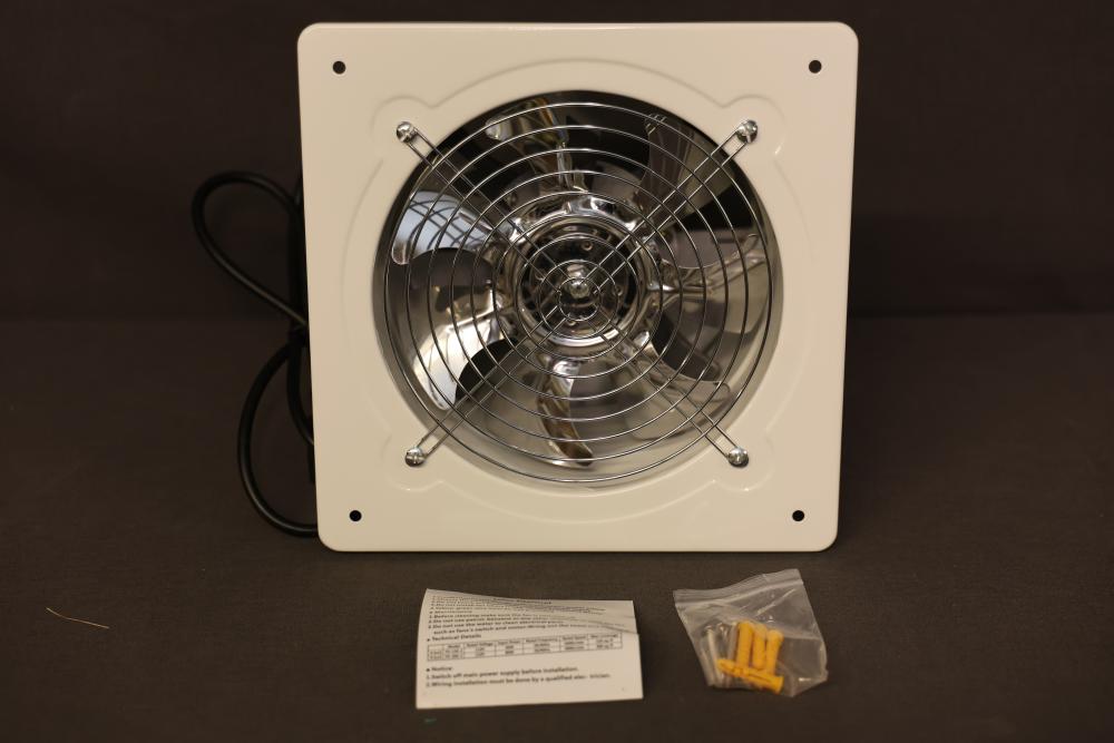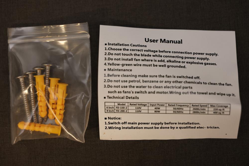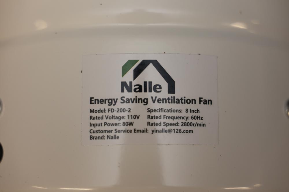 Nalle Energy Saving Ventilation Fan Model FD-200-2, featuring an 8-inch fan size, 110V rated voltage, and an 80W input power. Includes yellow wall plugs, screws, user manual, and the original box. Rated frequency is 60Hz with a speed of 2800/min. Pickup only.