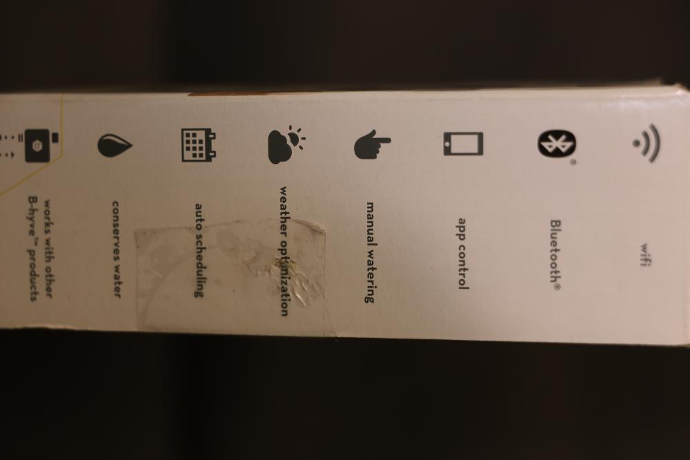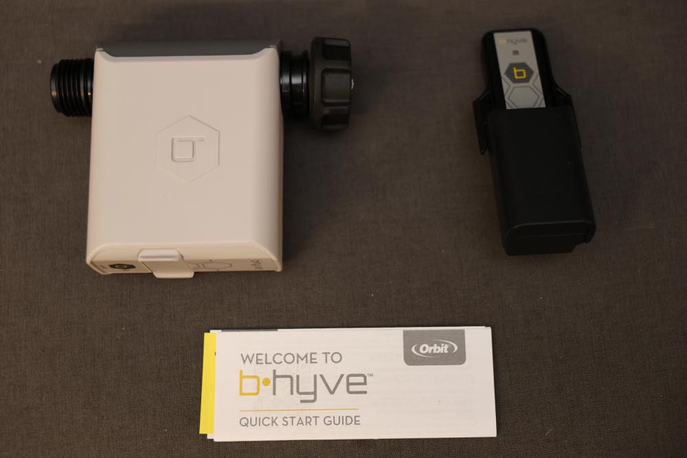 Orbit B-hyve Smart WiFi Hose Faucet Timer with Hub. Includes faucet timer, hub, and quick start guide. Features weather optimization, manual watering, Bluetooth and WiFi connectivity, app control, and auto-scheduling. For indoor use only. Pickup only.