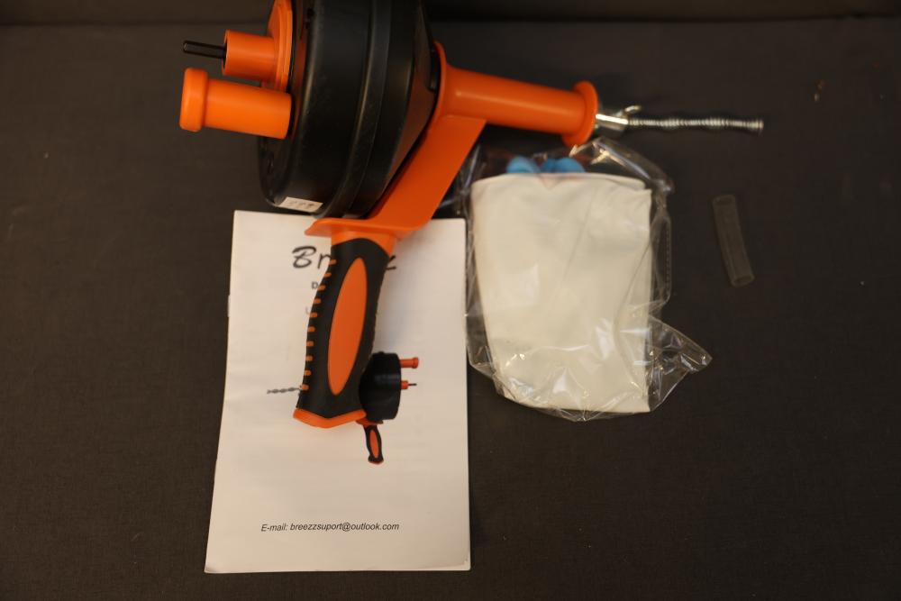 Breezz 1/4 Inch x 25 Ft Power Drum Auger designed for unclogging sinks, tubs, and showers. Includes a flexible 25 ft cable and ergonomic handle for ease of use. Includes additional components as shown. Pickup only.