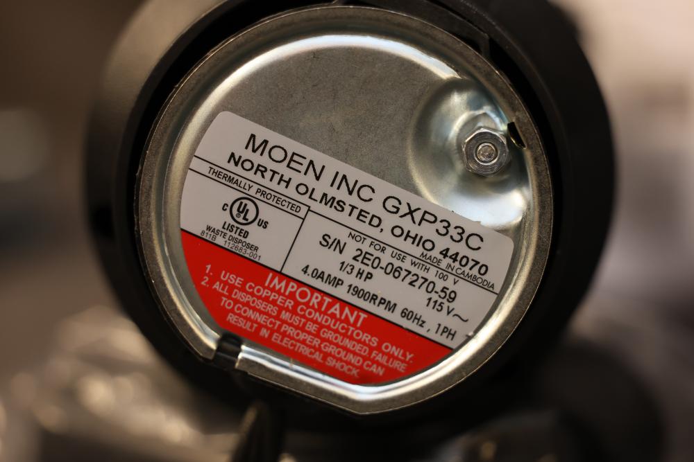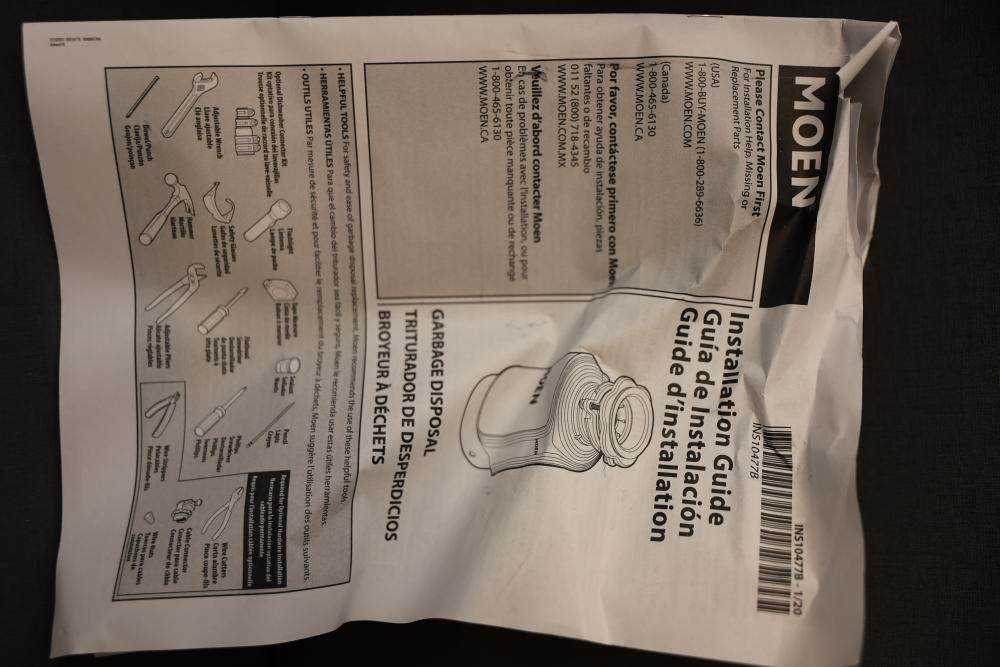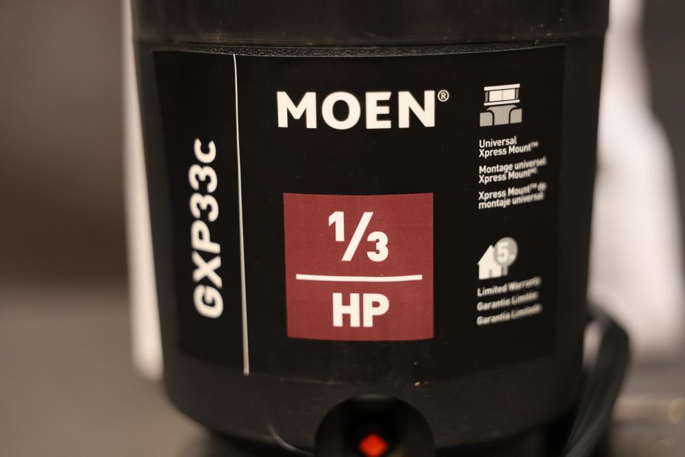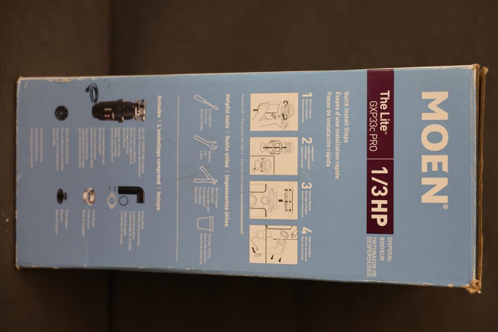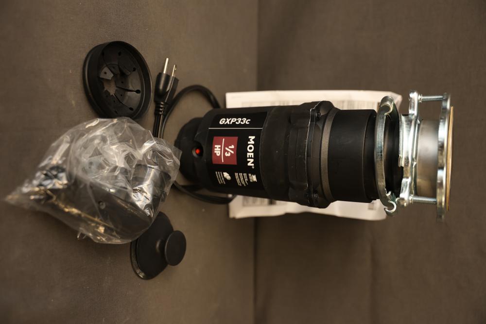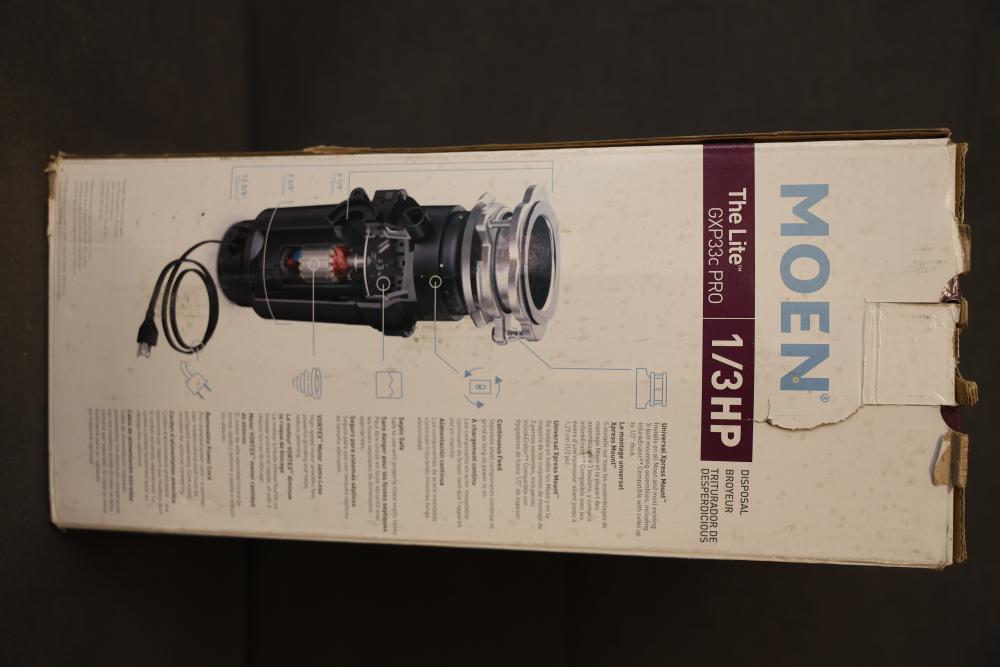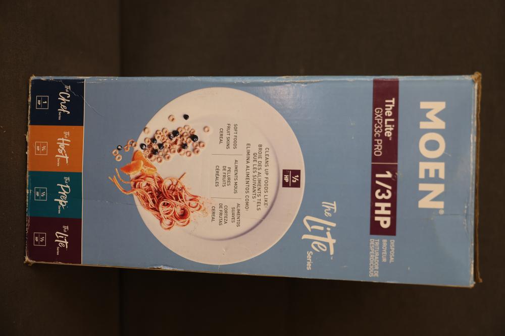 Moen GXP33C Garbage Disposal 1/3 HP with Accessories. Item features a 1/3 horsepower motor, compact design, and includes an installation guide and additional components. Designed for easy installation and reliable use. Pickup only.