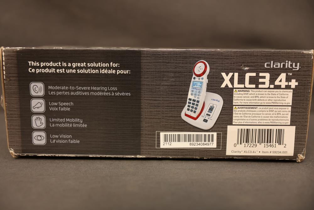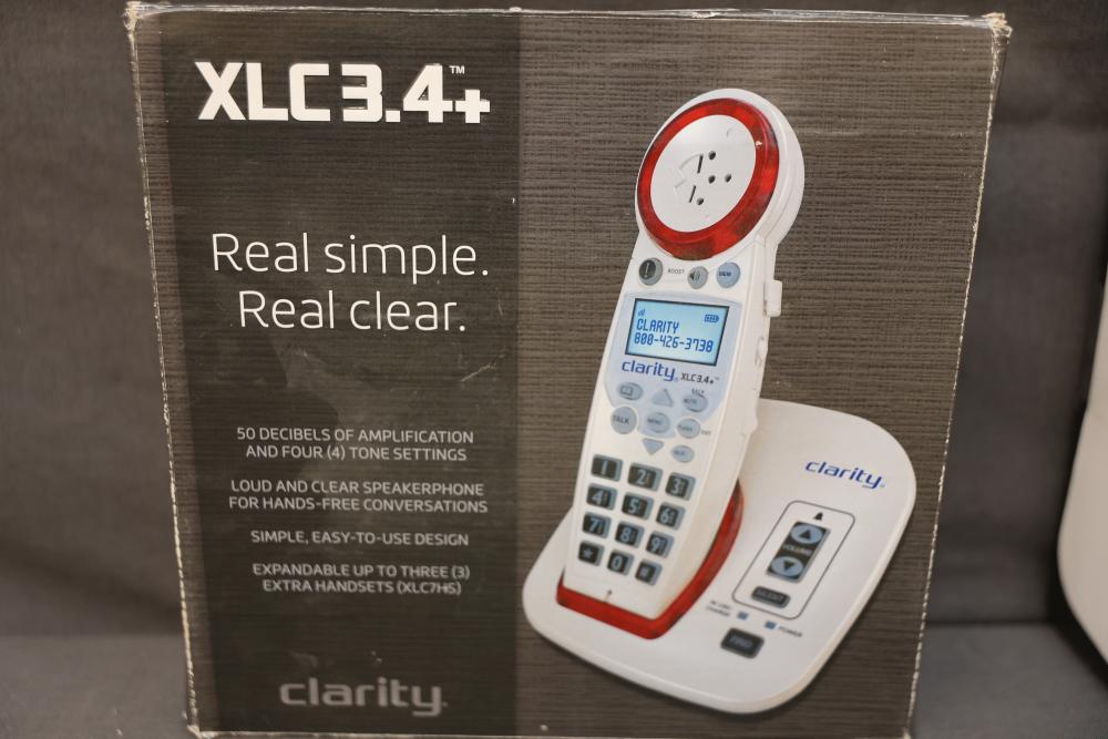 Clarity XLC3.4+ Amplified Cordless Phone System with accessories. Features include 50 decibels of amplification, four tone settings, loud and clear speakerphone for hands-free conversations, and an easy-to-use design. Compatible with up to three additional handset expansions. Pickup only.