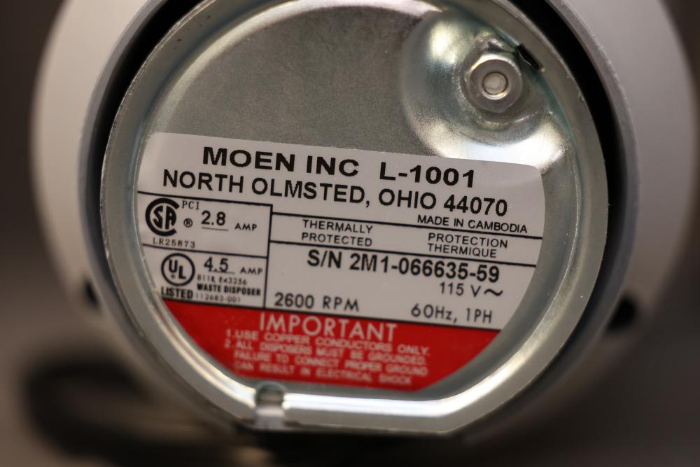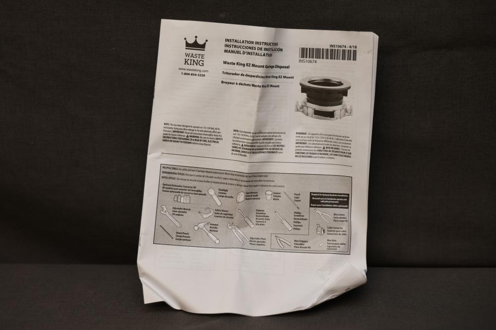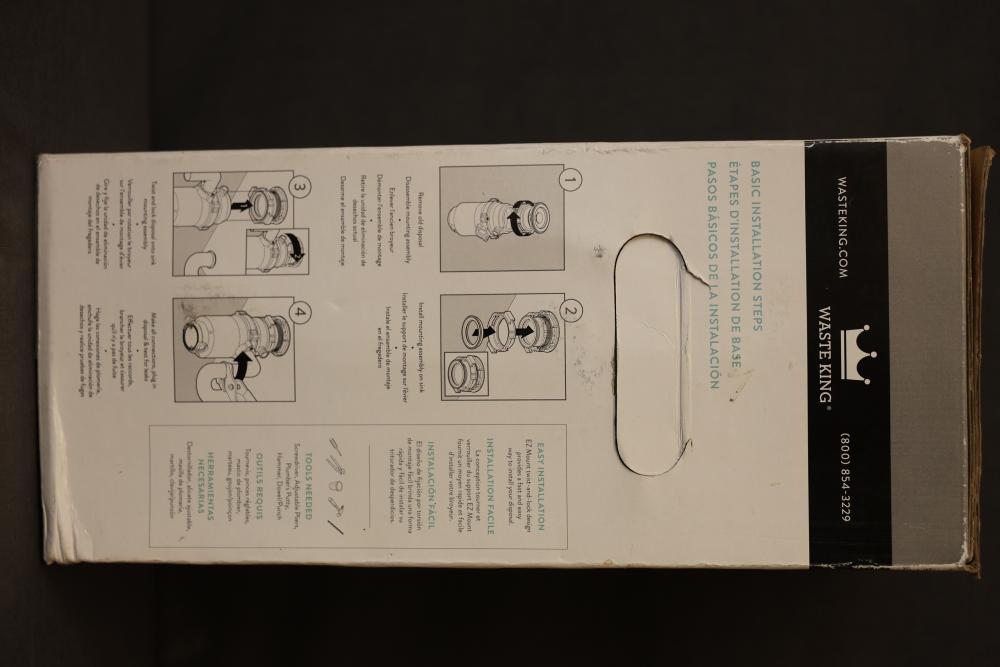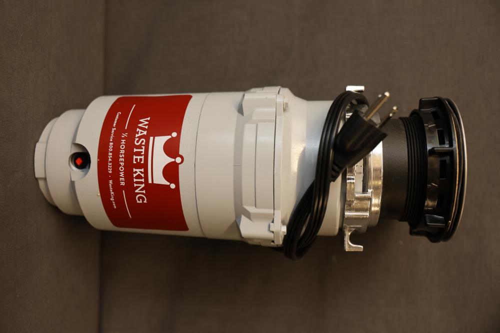 Waste King L-1001 1/2 HP Garbage Disposal with Accessories. Includes the main unit, installation components, user manual, and original packaging. The disposal features a 2600 RPM motor, requires 1-phase 60 Hz power supply, and is thermally insulated. Pickup only.
