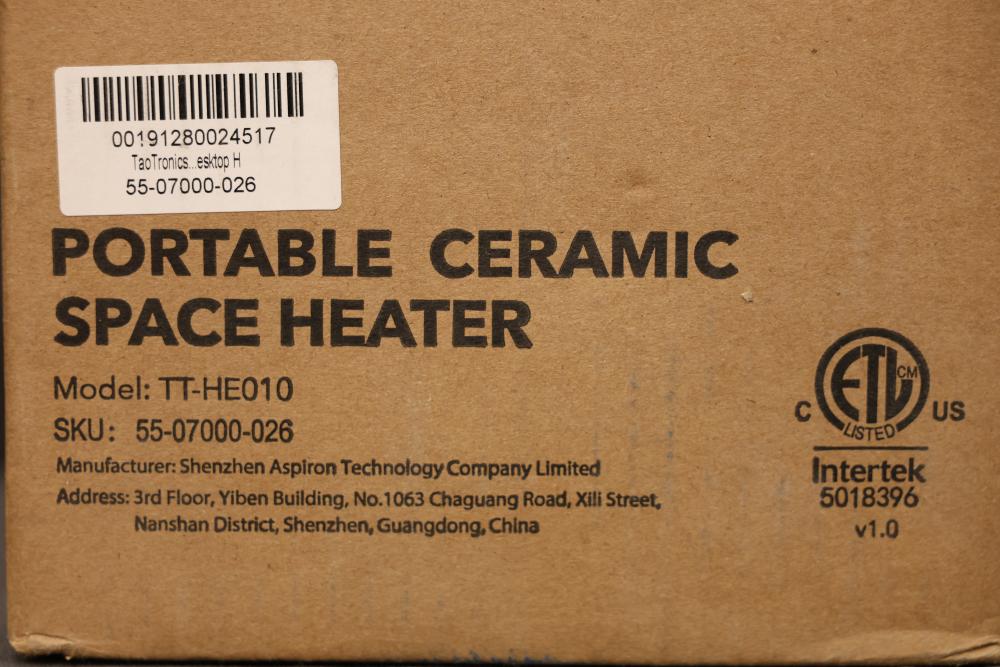 TaoTronics Portable Ceramic Space Heater, Model TT-HE010. Features 120VAC, 60Hz, 1500W power specifications with thermal protection. Includes the original packaging and user manual. Pickup only.
