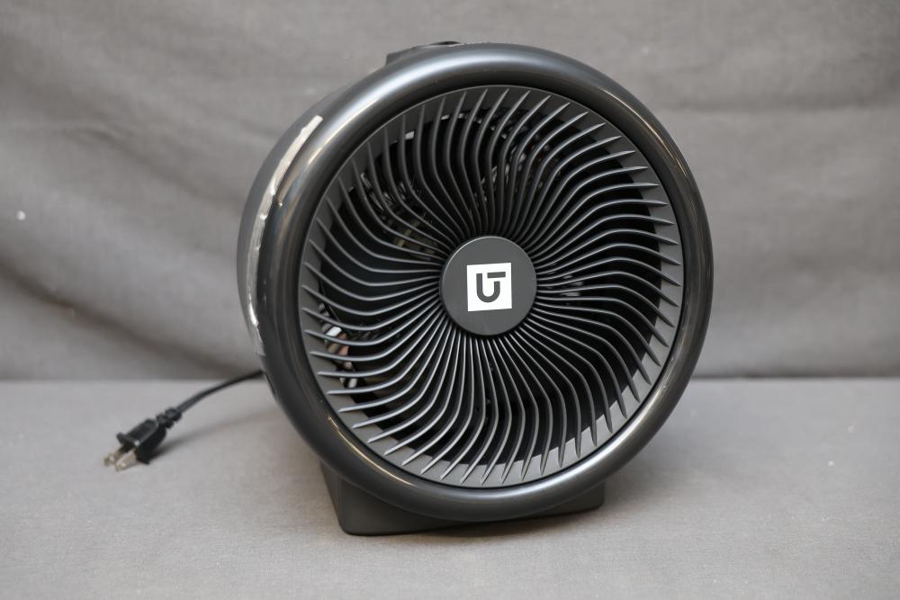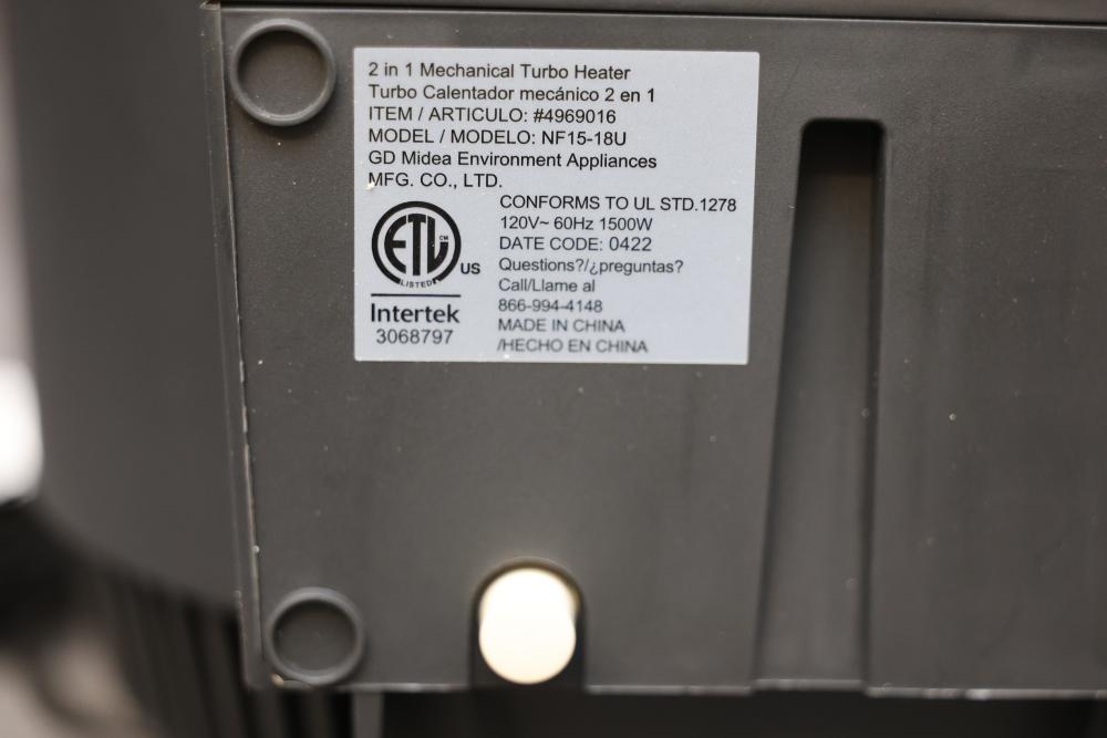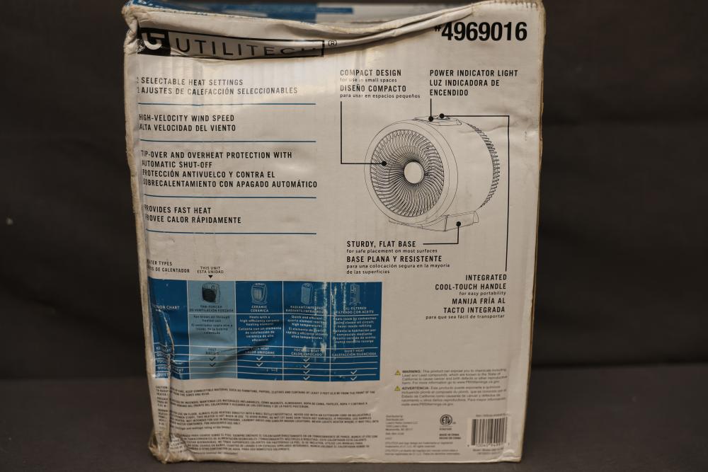Utilitech 2-in-1 Portable Heater With All-Season Circulation Fan, model NF15-18U. Designed for spaces up to 200 sq ft; features include 2 heat settings, fan-only mode, adjustable thermostat, and power indicator light. With a compact and lightweight design, it plugs into standard 120V outlets. Includes original box with visible wear. Pickup only.