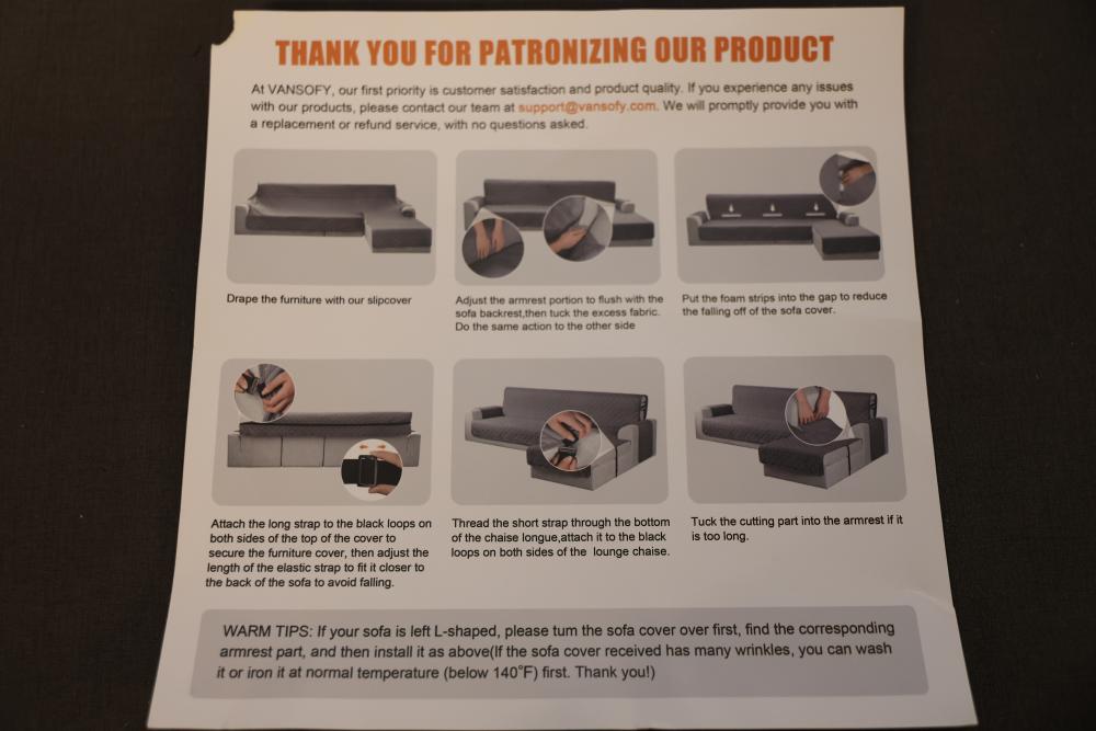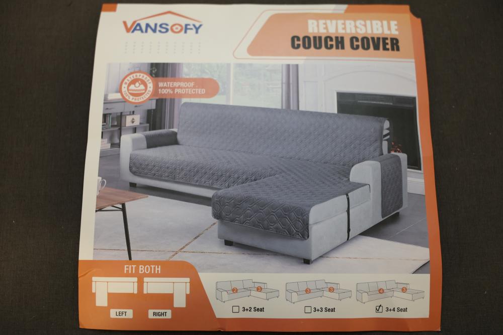 Vansofy Reversible Couch Cover with Quilted Design and Accessories. Includes a waterproof, 100% protected cover for left or right L-shaped couches. Fit sizes from 3-seat to 8-seat configurations. Comes with attachment accessories and instructions. Pickup only.