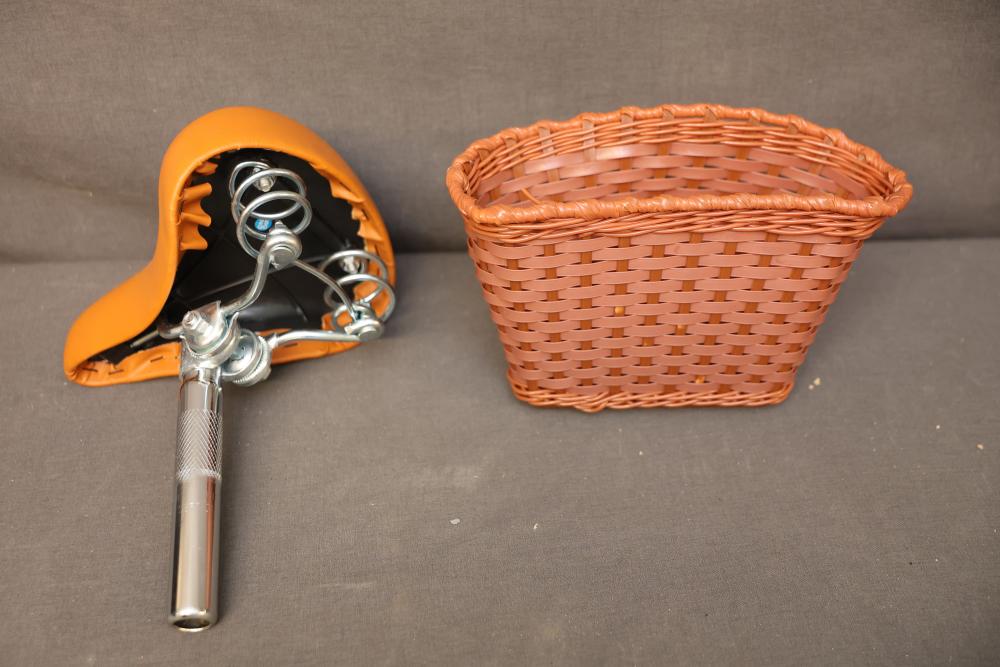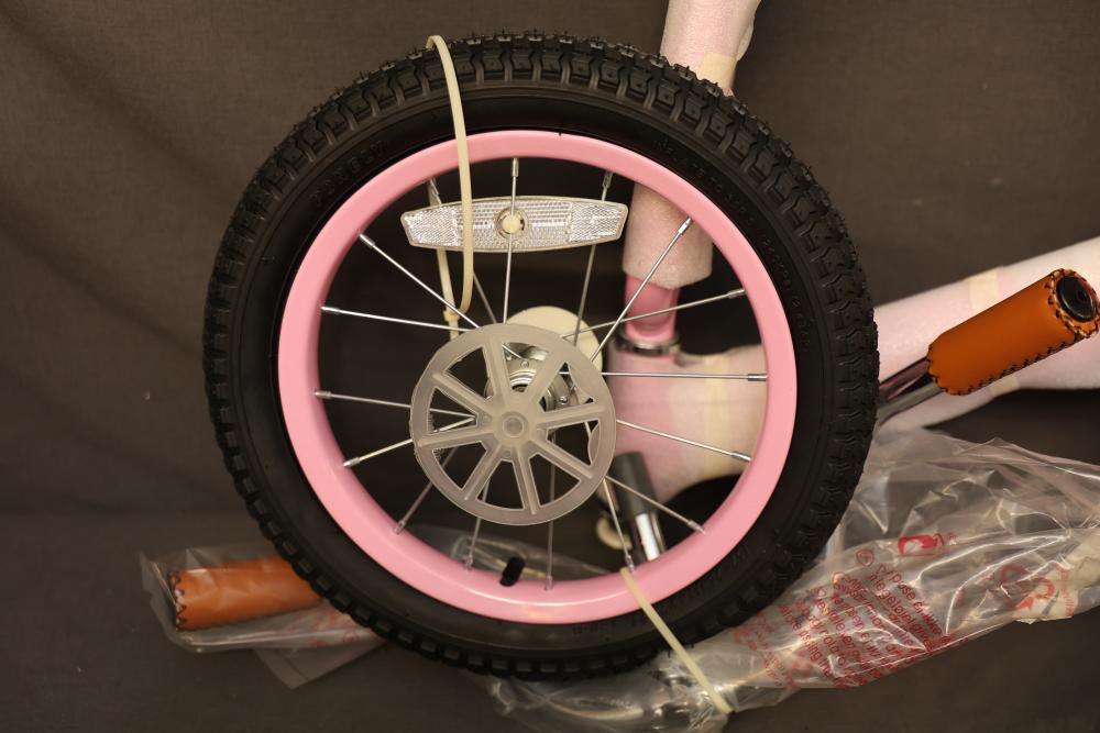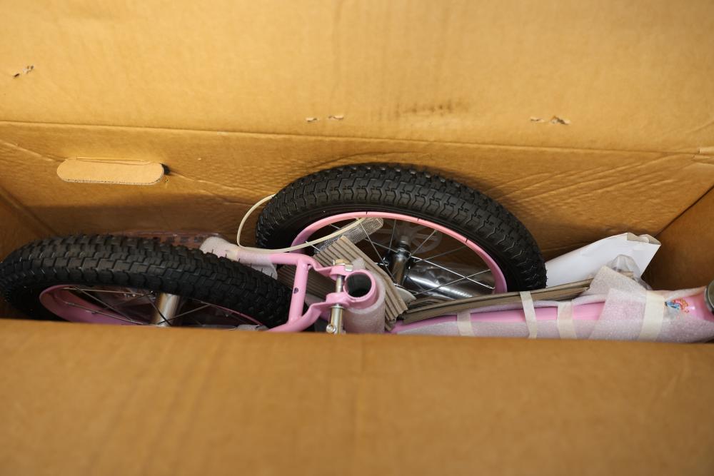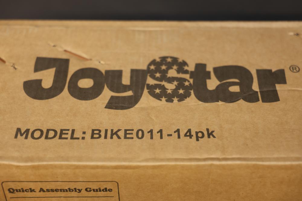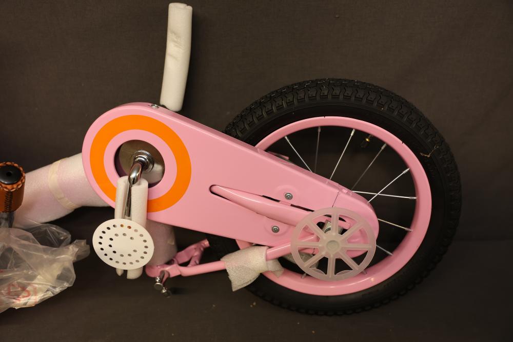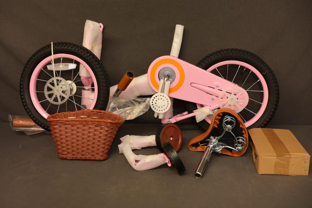 JoyStar Kids Bike Model BIKE011-14pk with Accessories. This partially assembled pink kids bike features 14-inch wheels, training wheels, and a wicker-style basket. Includes parts such as saddle, pedals, and necessary hardware, along with an assembly guide. Tools required for assembly are not included. Item is new in its original packaging. Pickup only.