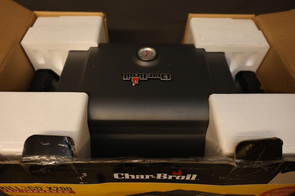 Char-Broil Grill2Go X200 Tru-Infrared Portable Gas Grill. Features a durable, compact design with a high-impact frame and built-in handles for portability. Includes a lid-mounted temperature gauge, TRU-Infrared cooking system for even heat distribution, and stainless steel grates. Comes in original packaging with accessories and instructions. Pickup only.