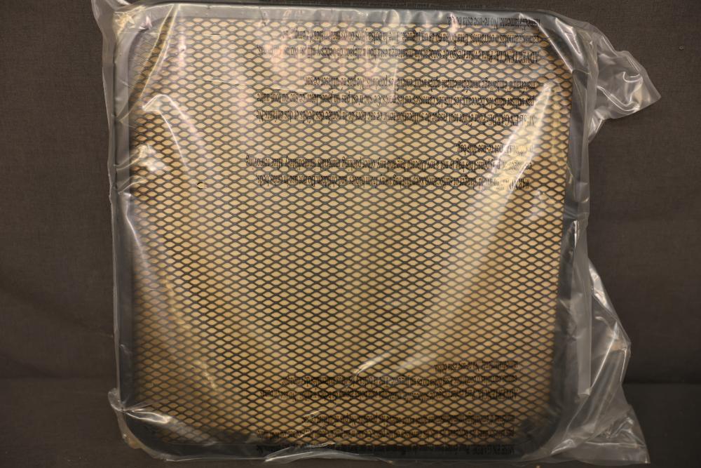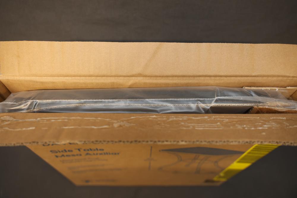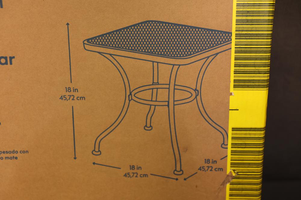 Davenport Metal Side Table with Matte Black Finish. Constructed with durable metal and a mesh tabletop, this side table measures 18 inches by 18 inches with a height of 18 inches. Packaged in its original box and appears to be in unused condition. Pickup only.